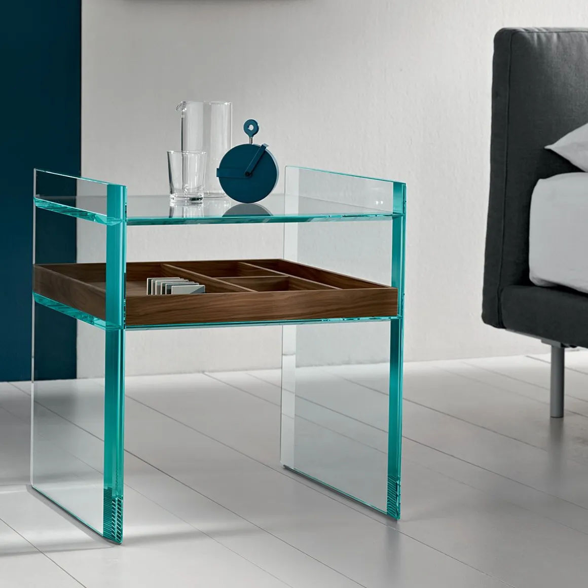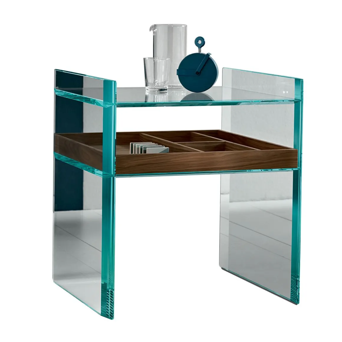 Table d’appoint. Ce meuble peut être complété par un plateau en noyer canaletto massif ou en MDF blanc mat.