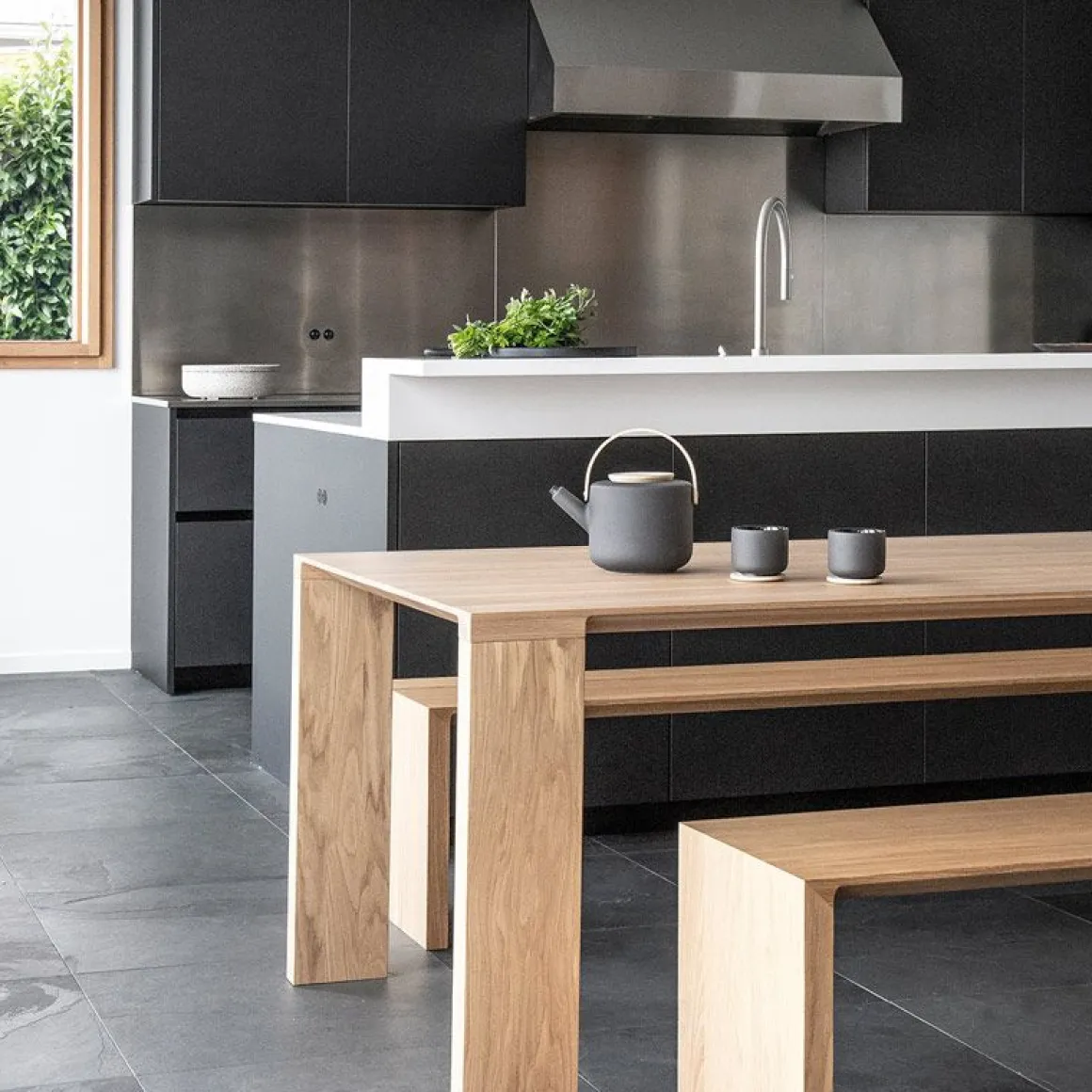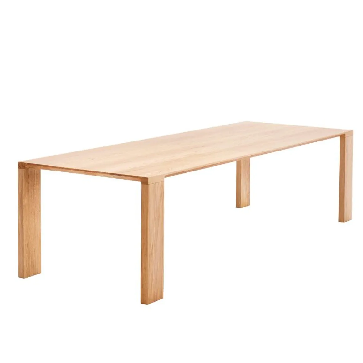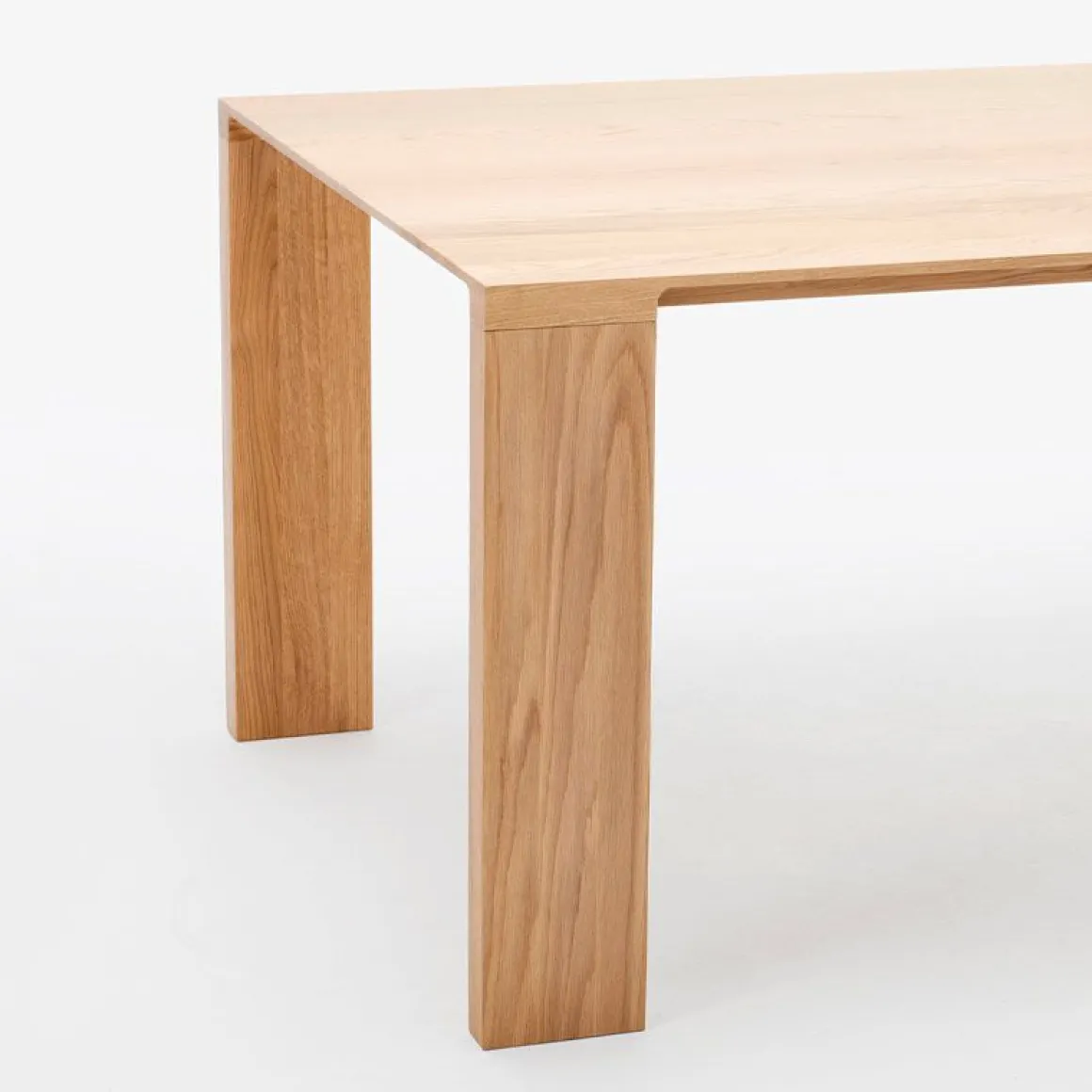Le biseau arrondi caractéristique sur le bord met en valeur la beauté naturelle du grain du bois sur la table à manger en bois massif Radii. La conception est définie par de minces bords biseautés qui s’écoulent intelligemment à travers des coupes arrondies pour se fondre dans les jambes épaisses. Ce détail sculptural donne une légèreté visuelle au plateau tout en soulignant la masse et la durabilité des pieds. Les plaques de métal dissimulées assurent une connexion transparente et rigide entre le plateau et les pieds. Les barres de support en acier massif insérées dans le dessus éliminent tout potentiel de mouvement du bois. La finition mate à grain ouvert donne au bois un aspect naturel tout en étant velouté au toucher et protège entièrement le bois de l’humidité et des débris.