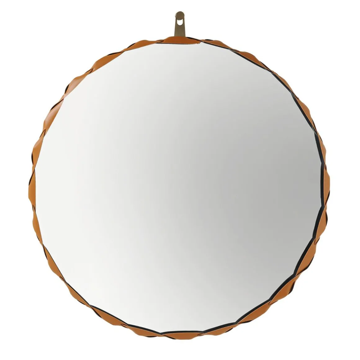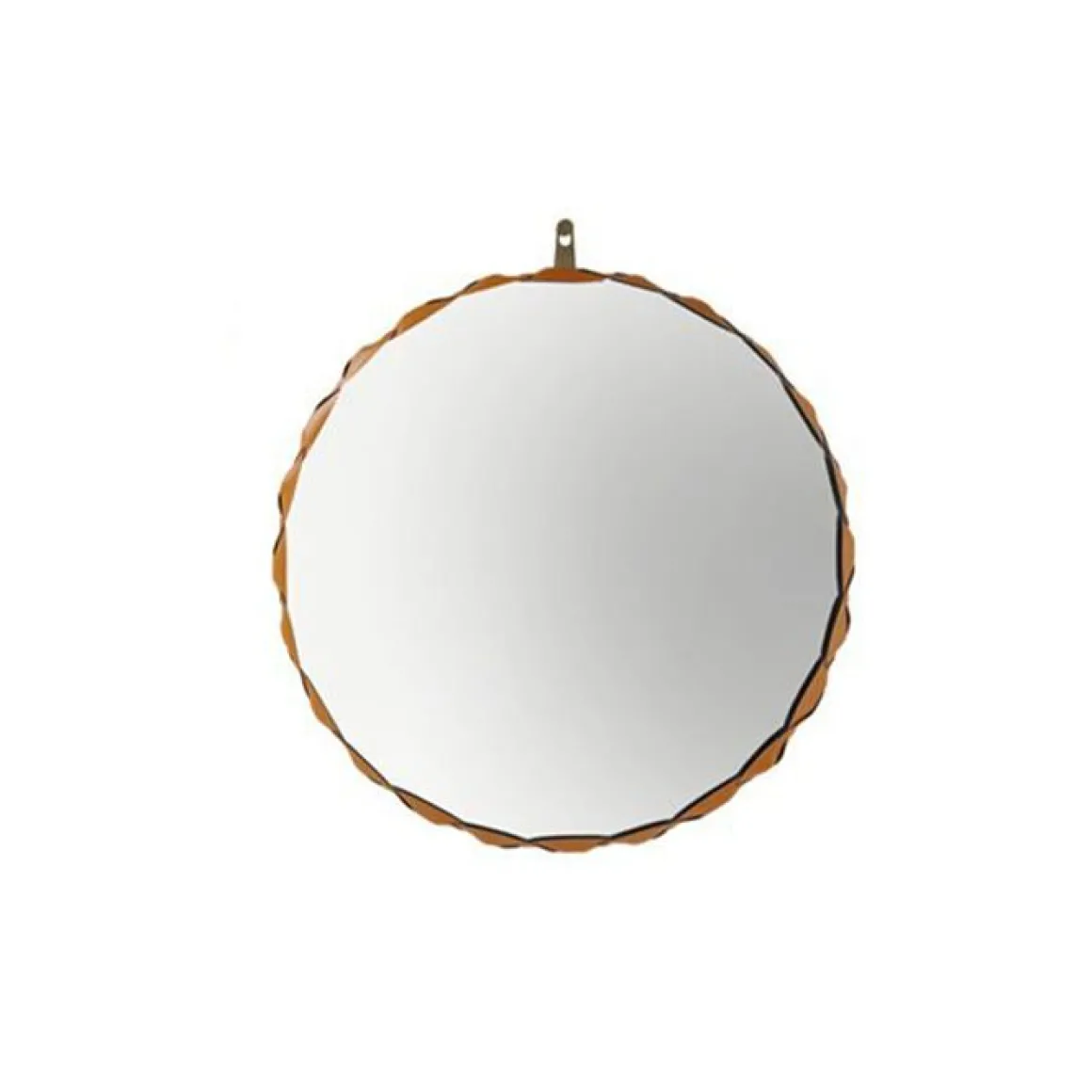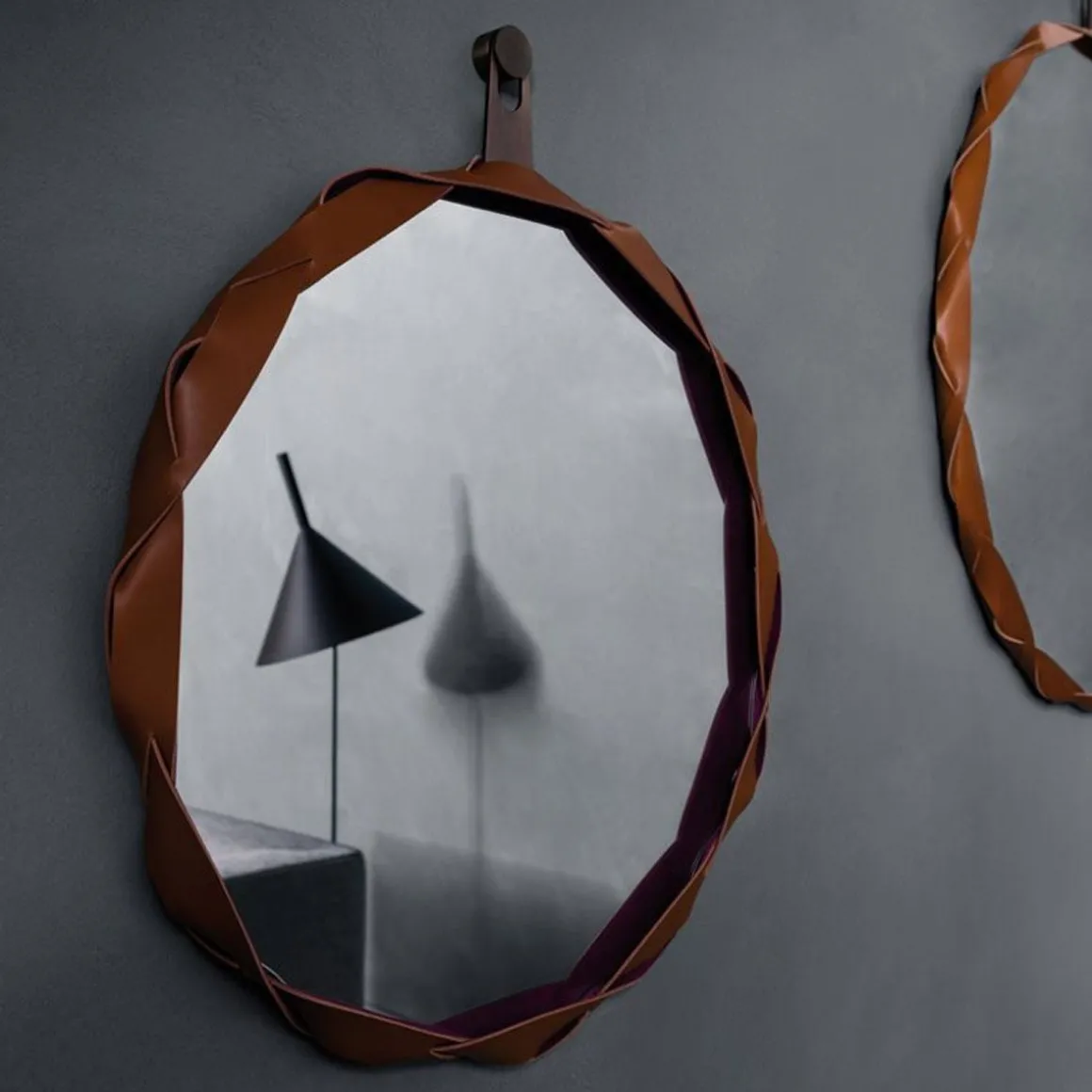 Miroir Raperonzolo de Zanotta en cristal d’une épaisseur de 5 mm. Le bord du miroir est en cuir sellier tressé dans la couleur dorée couplé au Alcantara®. L’accrochage au mur est prévu à travers une plaque en métal bronzée. Il est disponible en 3 différentes tailles.