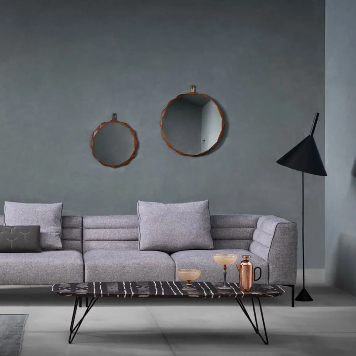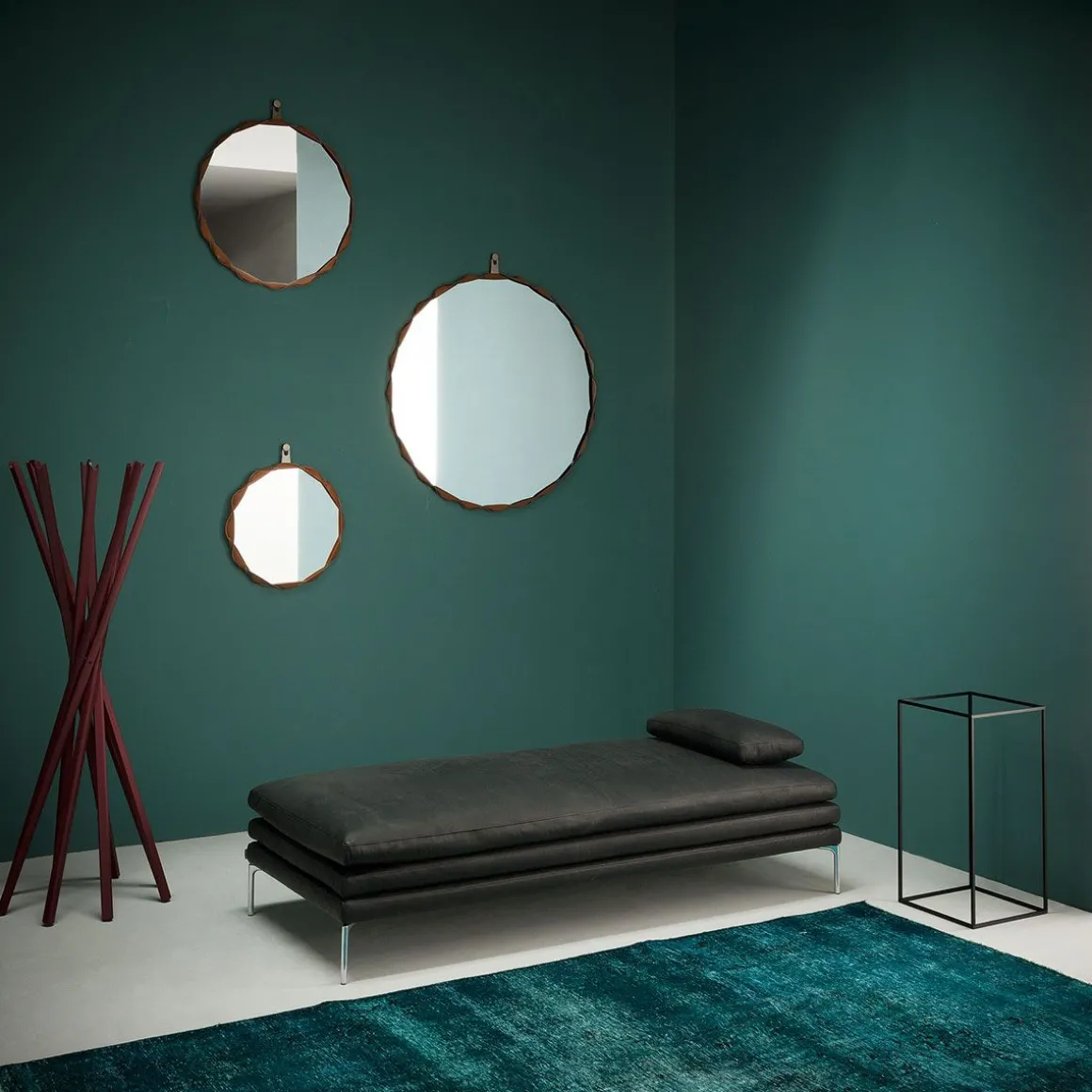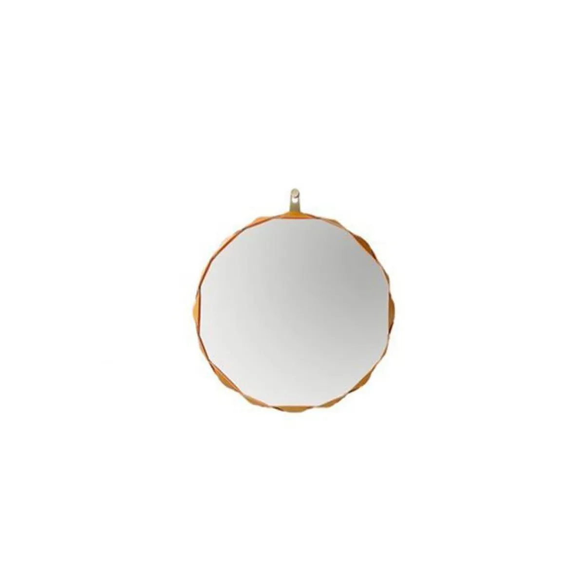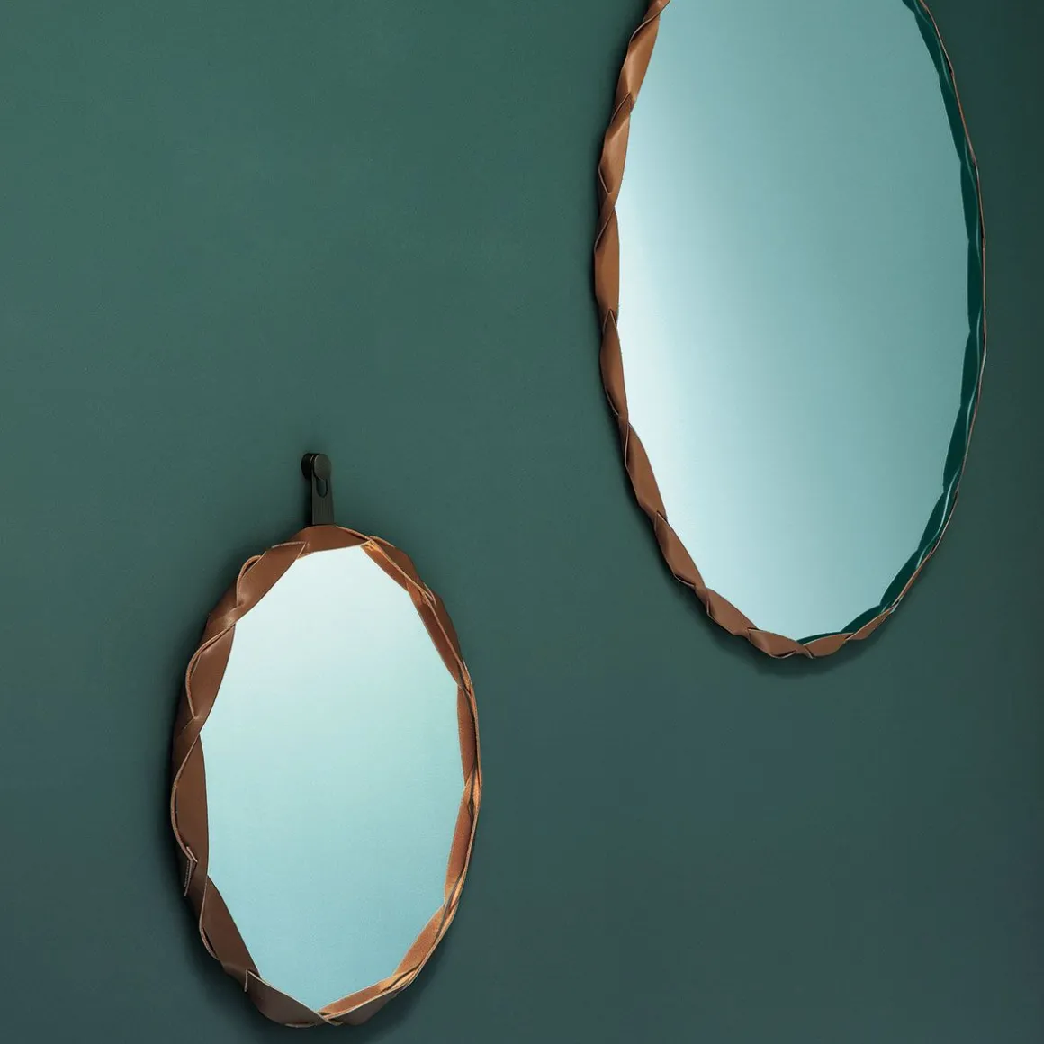 Miroir Raperonzolo de Zanotta en cristal d’une épaisseur de 5 mm. Le bord du miroir est en cuir sellier tressé dans la couleur dorée couplé au Alcantara®. L’accrochage au mur est prévu à travers une plaque en métal bronzée. Il est disponible en 3 différentes tailles.