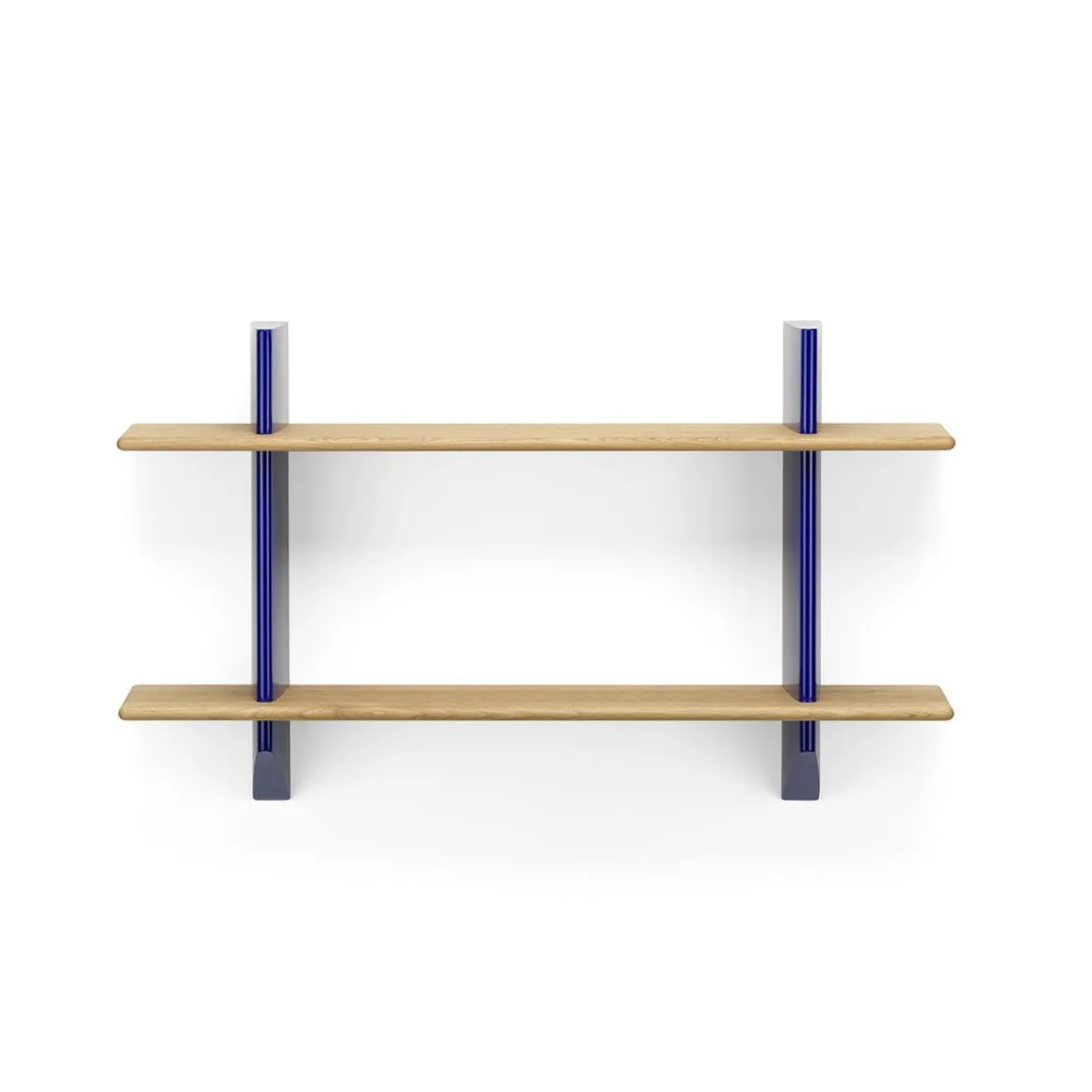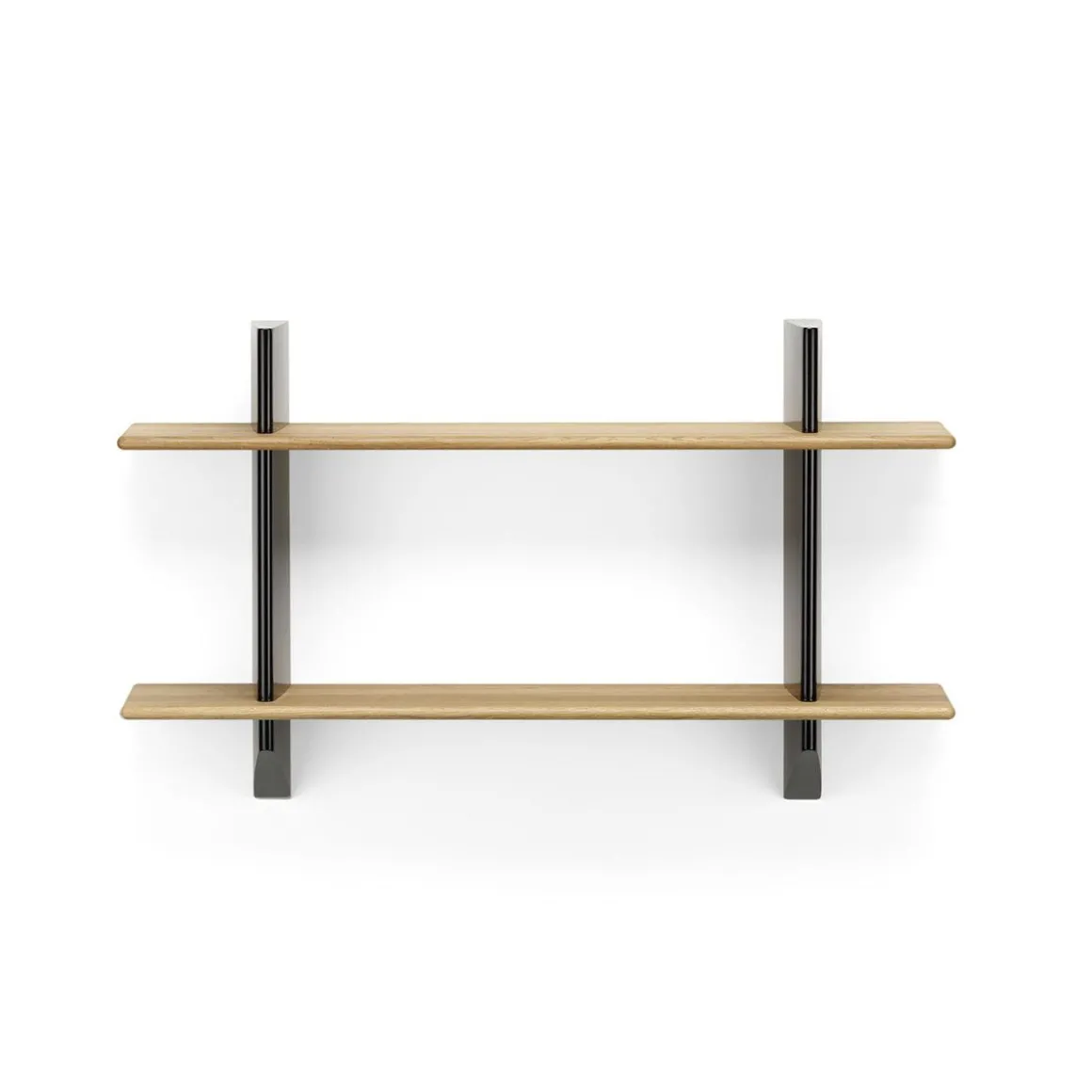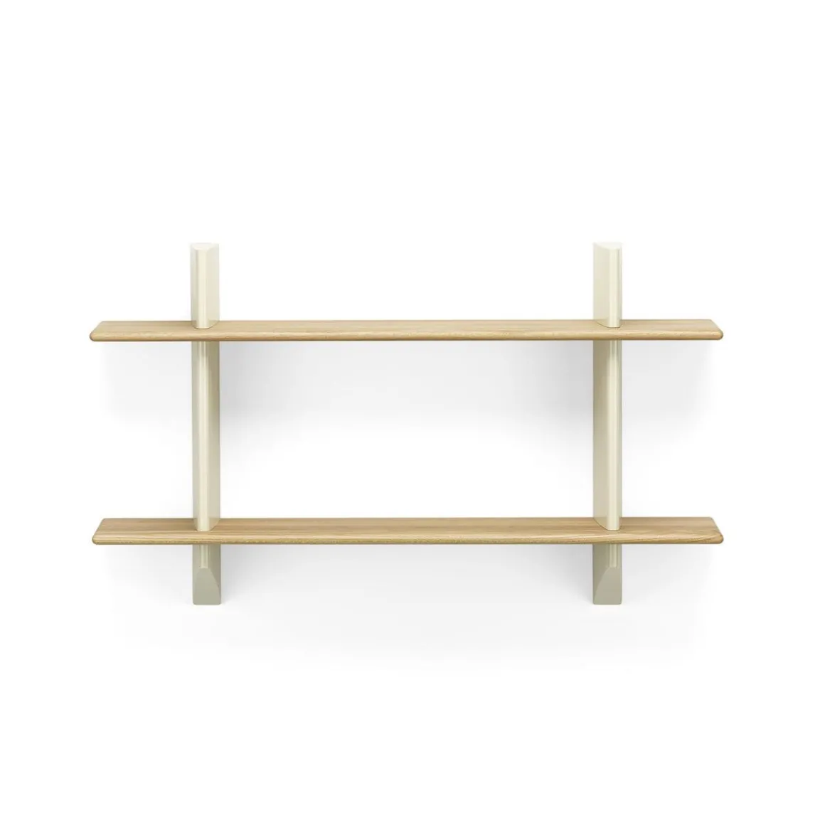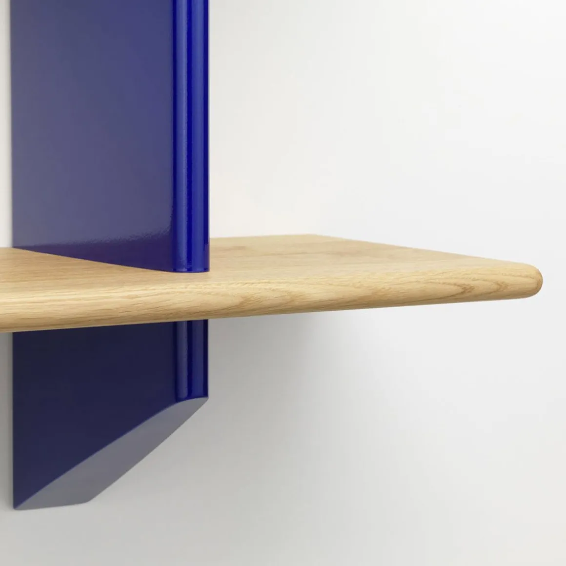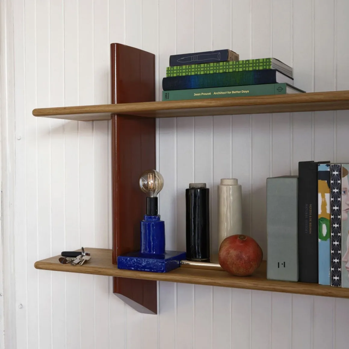 Les bibliothèques à fixer au mur étaient courantes dans les intérieurs de la première moitié du XXe siècle. Jean Prouvé a lui aussi conçu un certain nombre d’étagères murales, comme la Rayonnage Mural produit par Vitra, qui a été conçu à l’origine en 1936 pour l’École nationale professionnelle de la ville de Metz. Les deux support muraux verticaux de Rayonnage Mural sont réalisés en tôle pliée peinte. Avec leur forme aérodynamique qui rappelle le gouvernail d’un avion ou d’un navire, ils sont un élément récurrent des créations de Prouvé. Les supports muraux présentent des fentes horizontales réalisées avec précision dans lesquelles sont insérées les étagères en bois massif. Ces deux matériaux à fort contraste forment ensemble une étagère pratique qui possède les qualités sculpturales d’un objet esthétique. Les étagères en bois se décline en chêne clair ou foncé, tandis que les support muraux sont disponibles dans différentes couleurs originales de Prouvé.