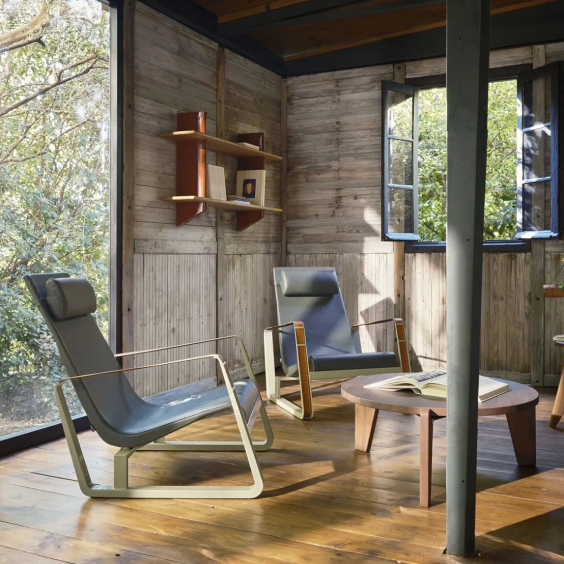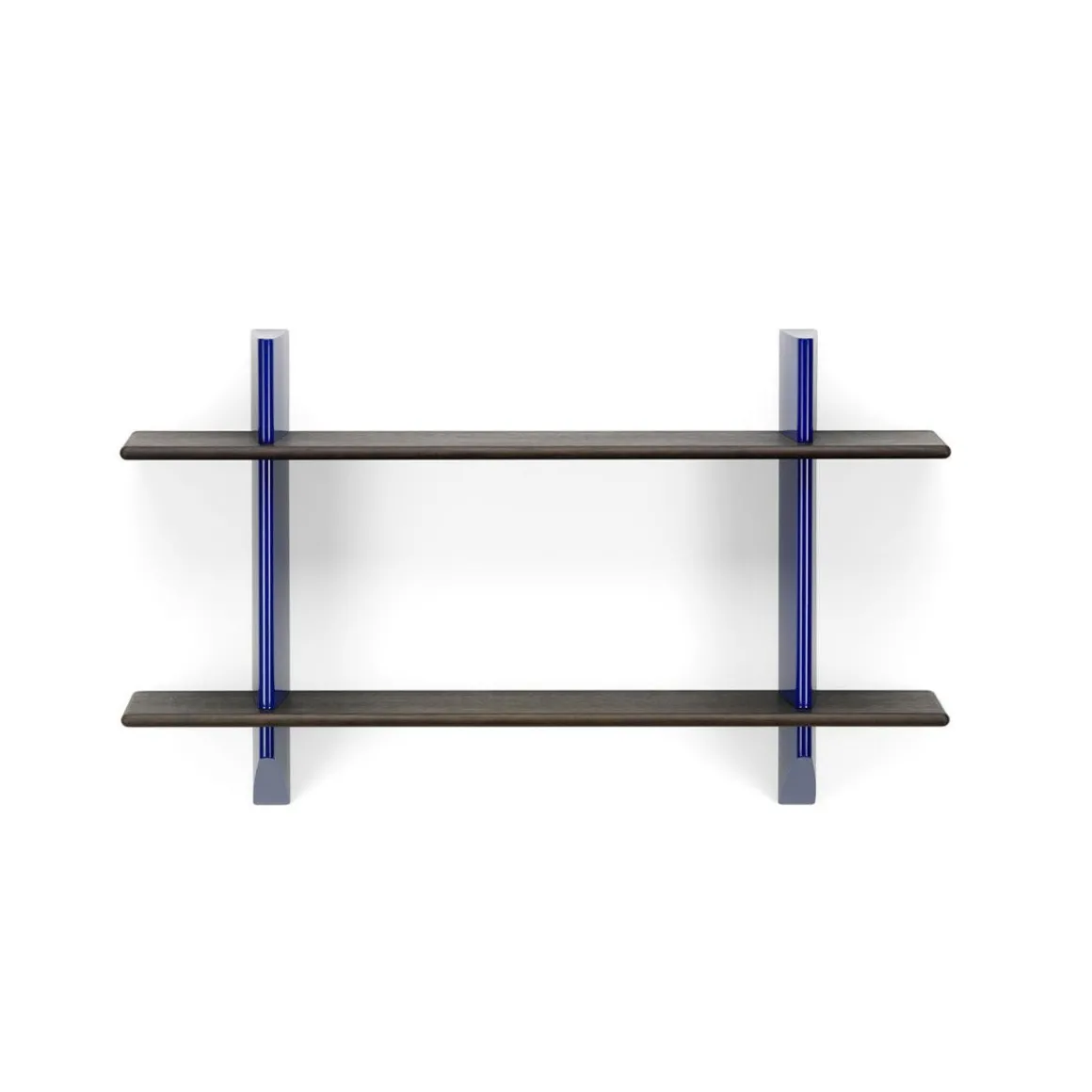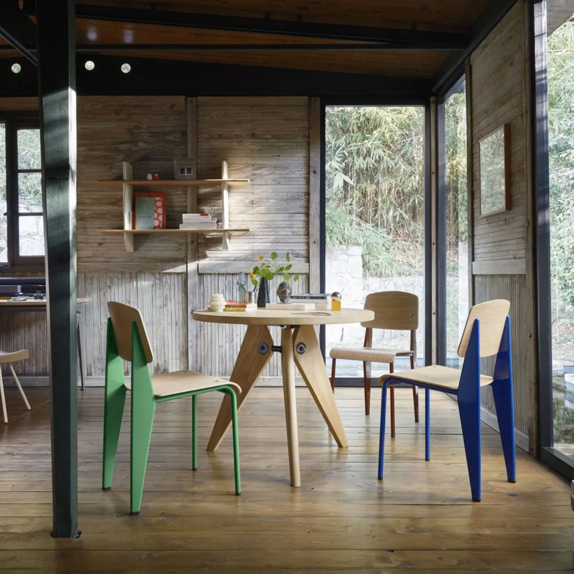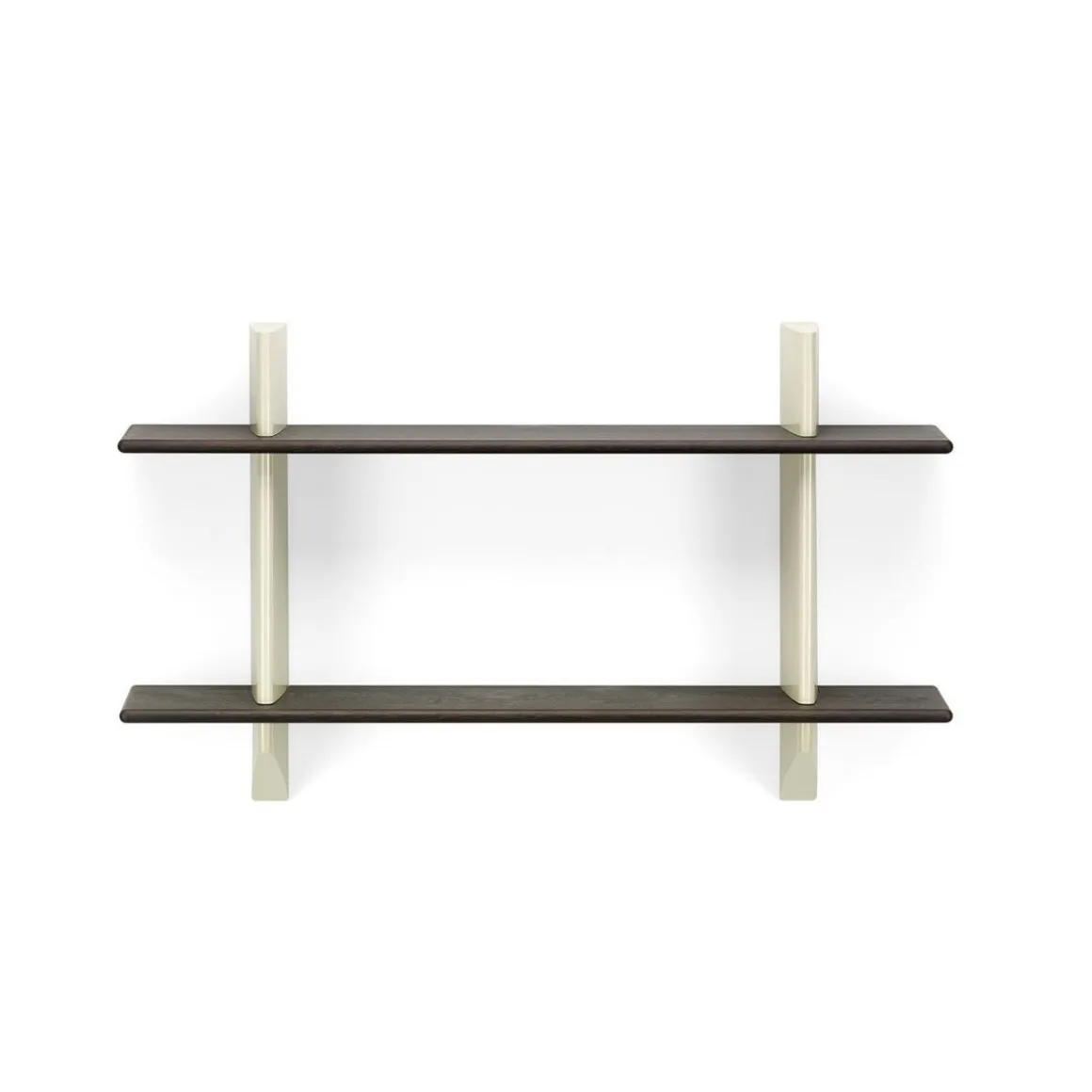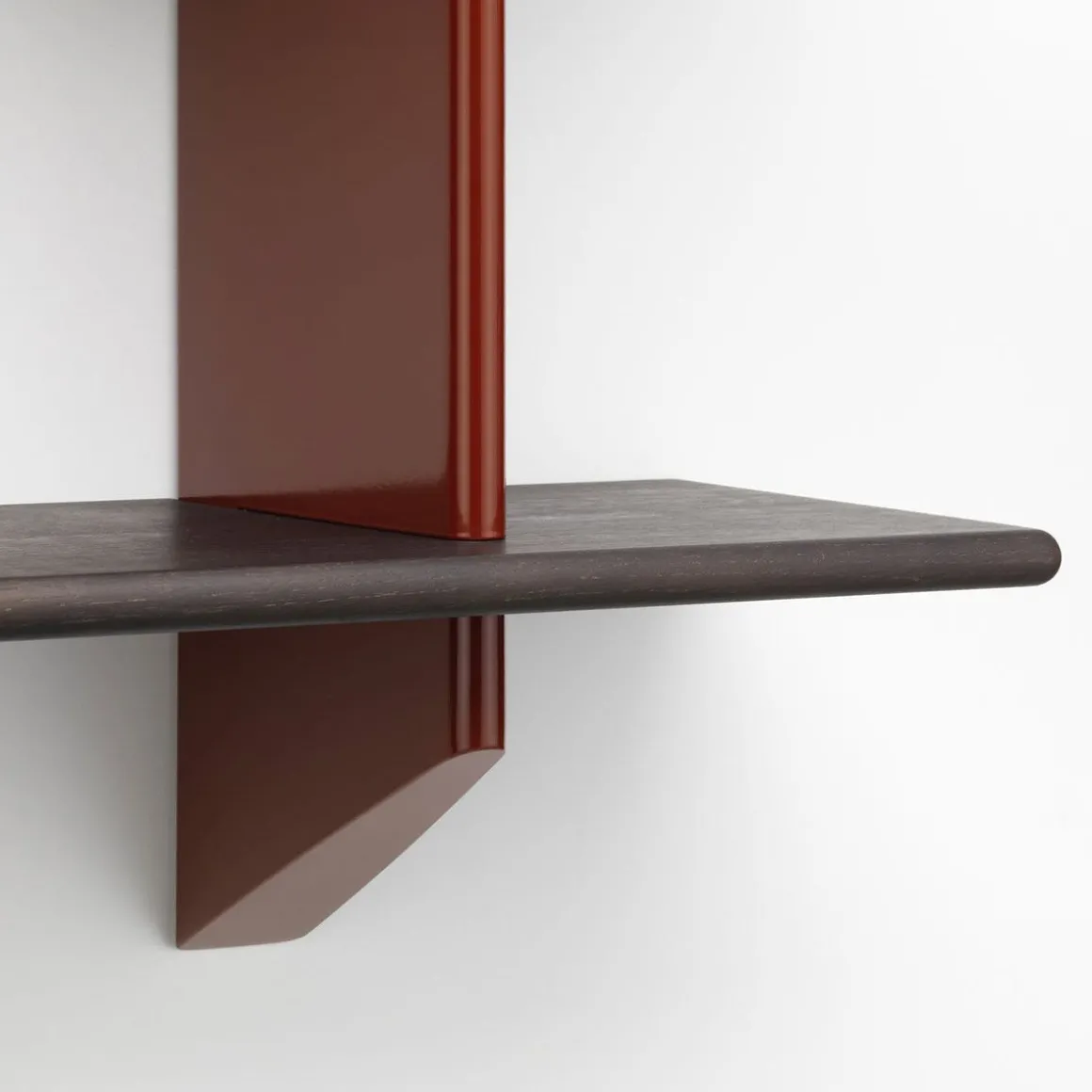 Les bibliothèques à fixer au mur étaient courantes dans les intérieurs de la première moitié du XXe siècle. Jean Prouvé a lui aussi conçu un certain nombre d’étagères murales, comme la Rayonnage Mural produit par Vitra, qui a été conçu à l’origine en 1936 pour l’École nationale professionnelle de la ville de Metz. Les deux support muraux verticaux de Rayonnage Mural sont réalisés en tôle pliée peinte. Avec leur forme aérodynamique qui rappelle le gouvernail d’un avion ou d’un navire, ils sont un élément récurrent des créations de Prouvé. Les supports muraux présentent des fentes horizontales réalisées avec précision dans lesquelles sont insérées les étagères en bois massif. Ces deux matériaux à fort contraste forment ensemble une étagère pratique qui possède les qualités sculpturales d’un objet esthétique. Les étagères en bois se décline en chêne clair ou foncé, tandis que les support muraux sont disponibles dans différentes couleurs originales de Prouvé.