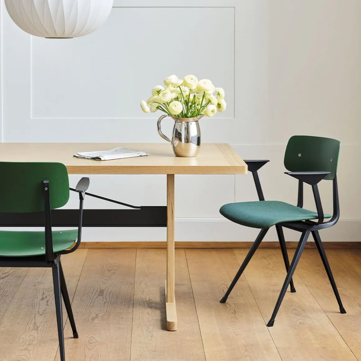 Result Armchair de Hay. Le fauteuil Result partage la même base en tôle d’acier mince, le siège et le dossier en chêne que le Result Chair original, mais est complété par des accoudoirs surélevés qui apportent un confort et une fonctionnalité supplémentaires au design. Créée à l’origine par Friso Kramer et Wim Rietveld alors qu’ils travaillaient chez Ahrend dans les années 1950, la collection en acier découpé a été relancée par HAY en collaboration avec Ahrend. Il est disponible dans une variété de finitions en bois et de couleurs de base, ainsi qu’une variante avec assise rembourrée et une version entièrement rembourrée proposée dans une large gamme d’options de textiles et de cuir. Toutes les variantes peuvent être coordonnées avec la Pyramid Table, ce qui en fait une configuration de sièges polyvalente pour une utilisation dans de nombreux contextes publics et privés.