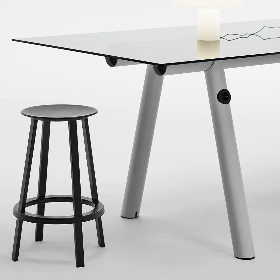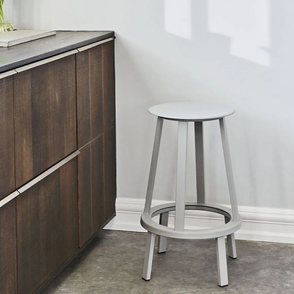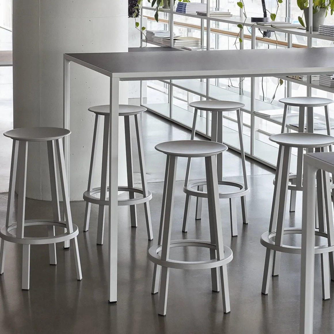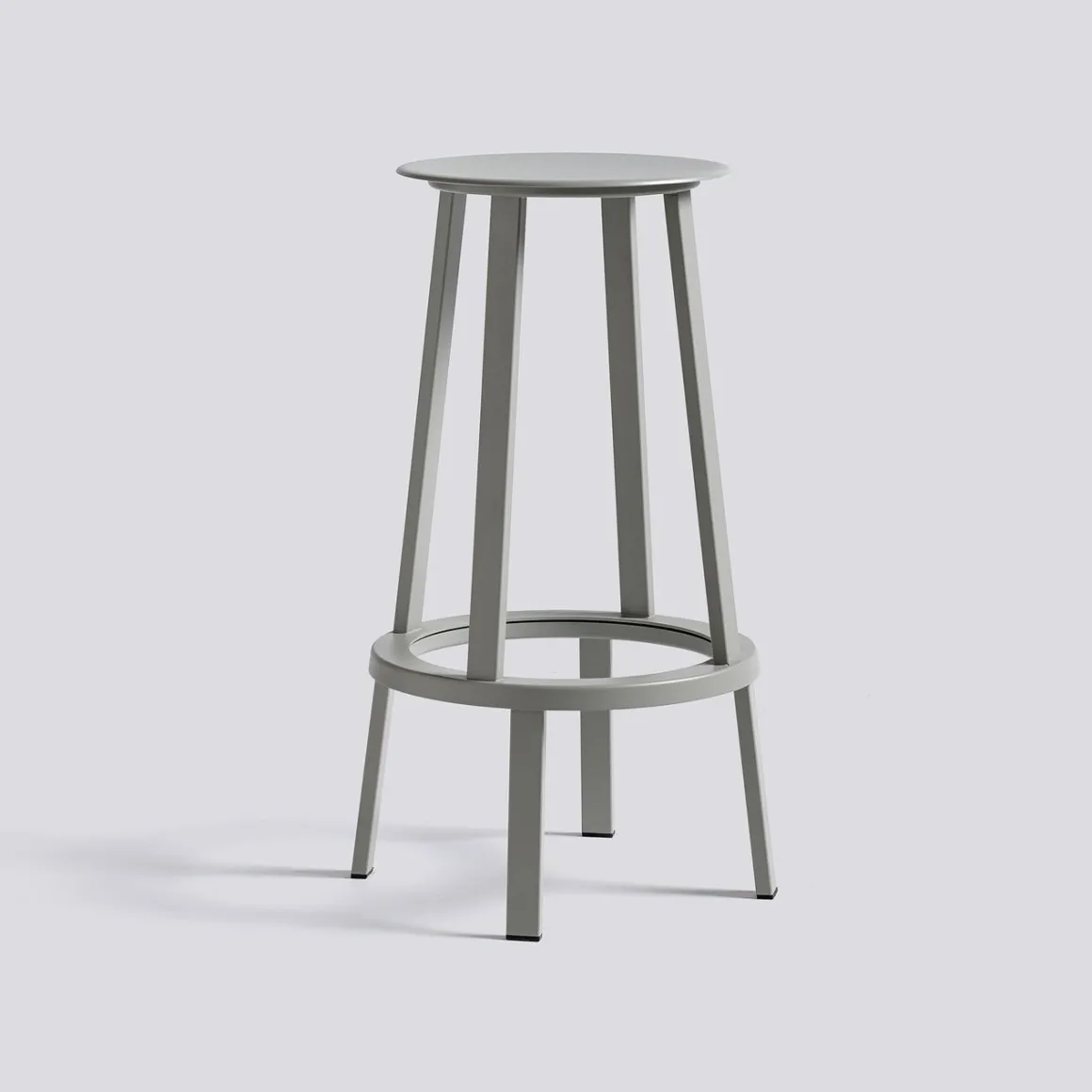 Revolver Tabouret de Hay. Le tabouret Revolver a une assise ronde et un repose-pieds circulaire avec un système de roulement à billes intégré qui permet de le faire pivoter de 360°. Dessiné par le designer new-yorkais Leon Ransmeier, ce tabouret haut en métal possède une silhouette atypique avec son système de rotation surprenant ! Revolver se compose de deux parties superposées assez distinctes visuellement. La base fixe en bas est surmontée d’un anneau rotatif qui permet à la partie supérieure du tabouret de pivoter à 360 °. Toute la partie supérieure du tabouret est mobile : ce n’est pas seulement l’assise qui pivote mais également les quatre pieds supérieurs. Ce tabouret illustre le travail de Ransmeir avec ses meubles graphiques qui ne révèlent pas à première vue leur spécificité fonctionnelle. Un tabouret fonctionnel et design étonnant !