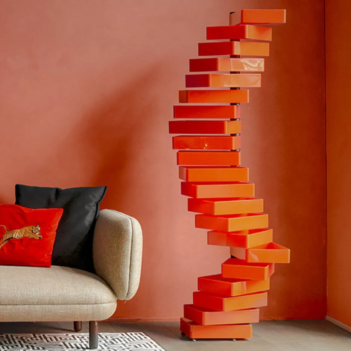 Le meuble Revolving cabinet fait partie de ces pièces mythiques du design des années 70 qui ont révolutionné les intérieurs. Créée par Shiro Kuramata et éditée par Cappellini, cette commode en matériau acrylique poli rouge est équipée de 20 tiroirs pivotants sur une barre verticale en métal. Telle une sculpture domestique évolutive, sa forme est en perpétuel changement selon la position des tiroirs. Une façon ludique, étonnante et particulièrement originale de ranger des accessoires de bureaux ou tous les menus objets qui trainent dans la maison.
