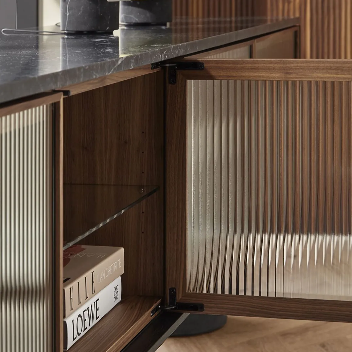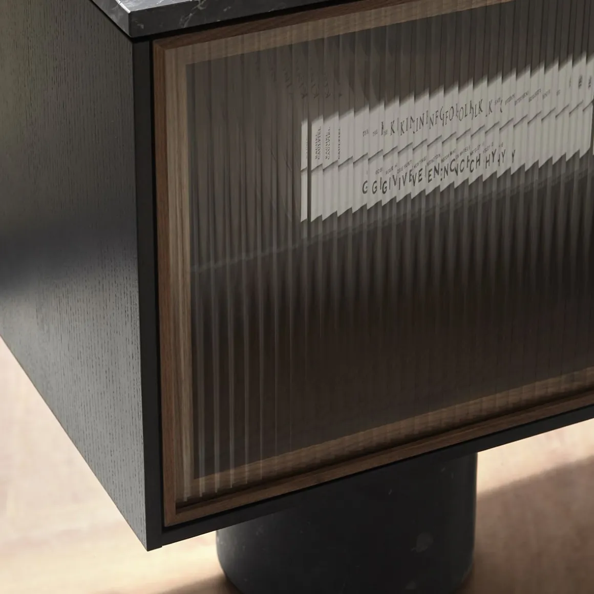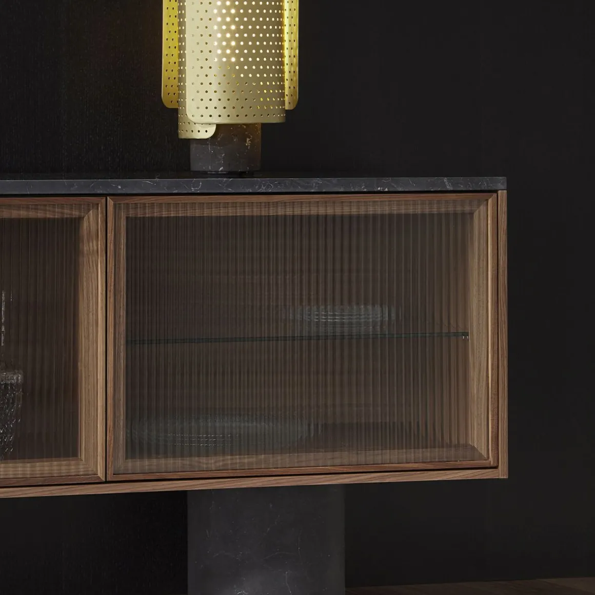 Matériaux : Noyer, marbre Marquina et Verre trempé ondulé