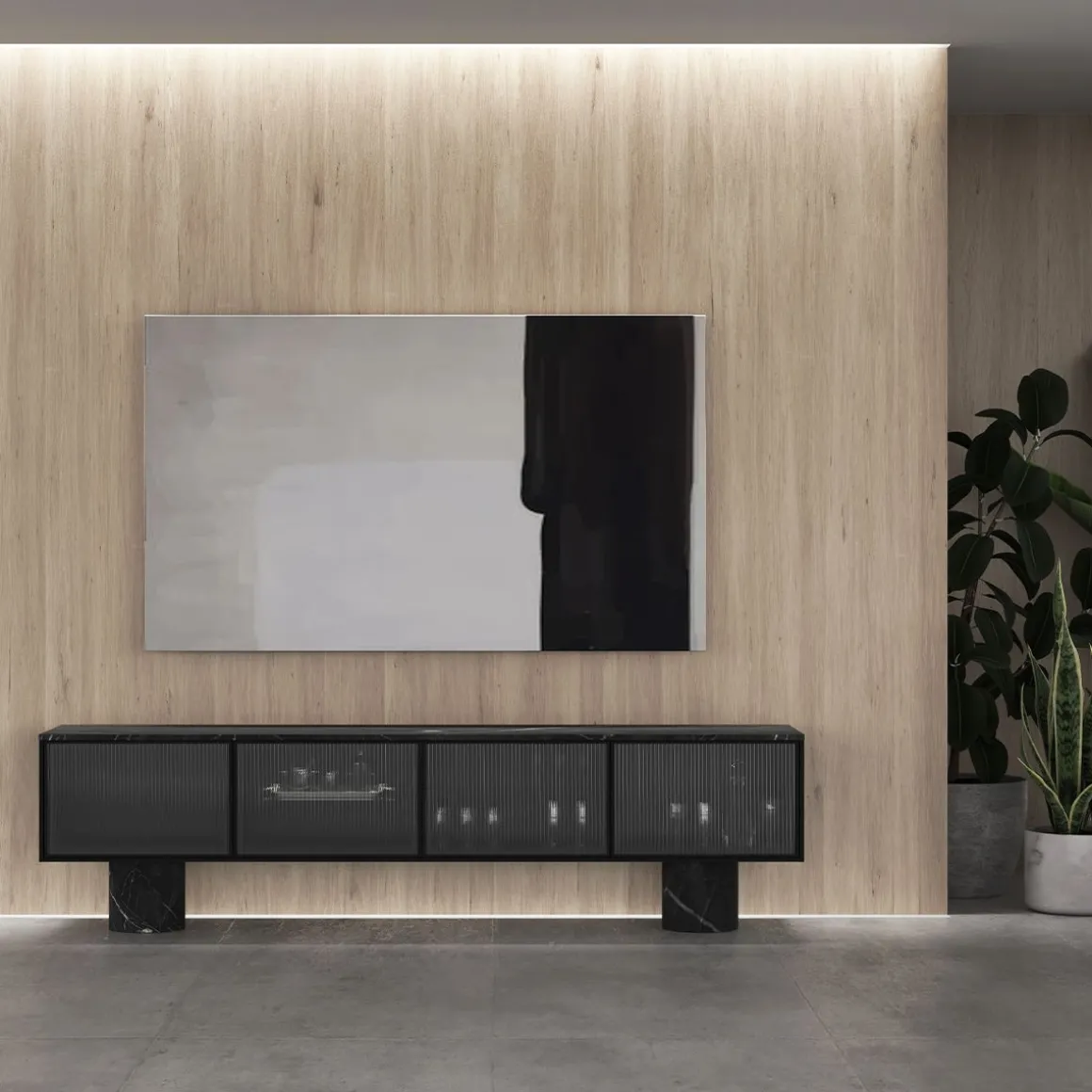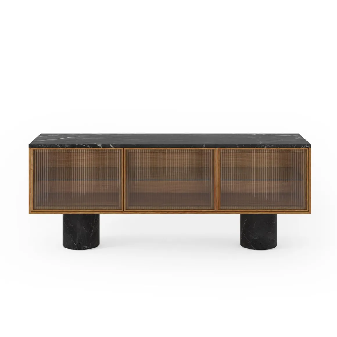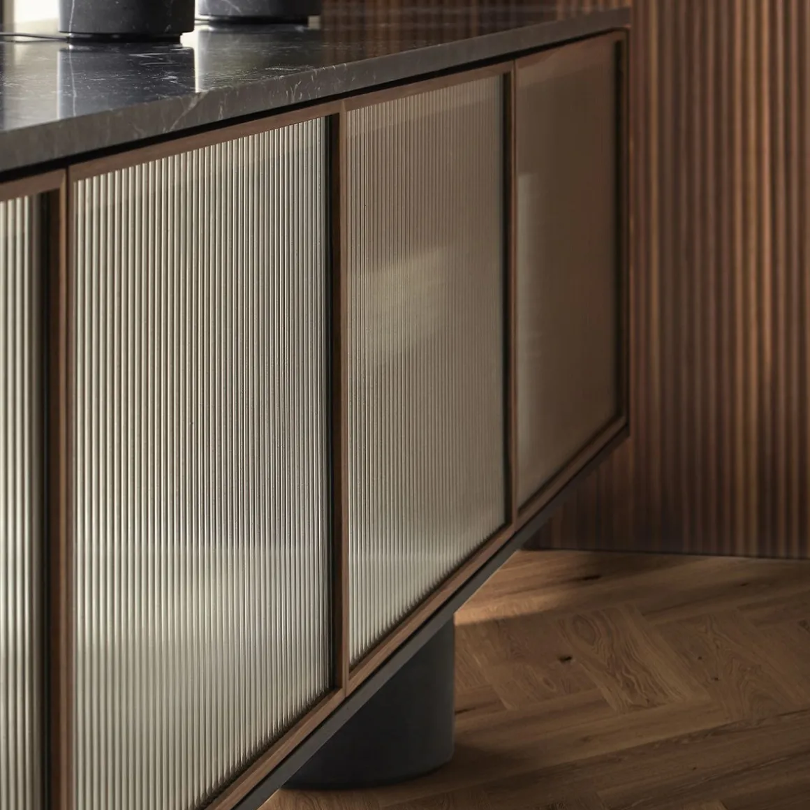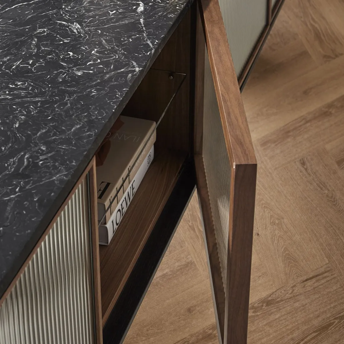 Matériaux : Noyer, marbre Marquina et Verre trempé ondulé