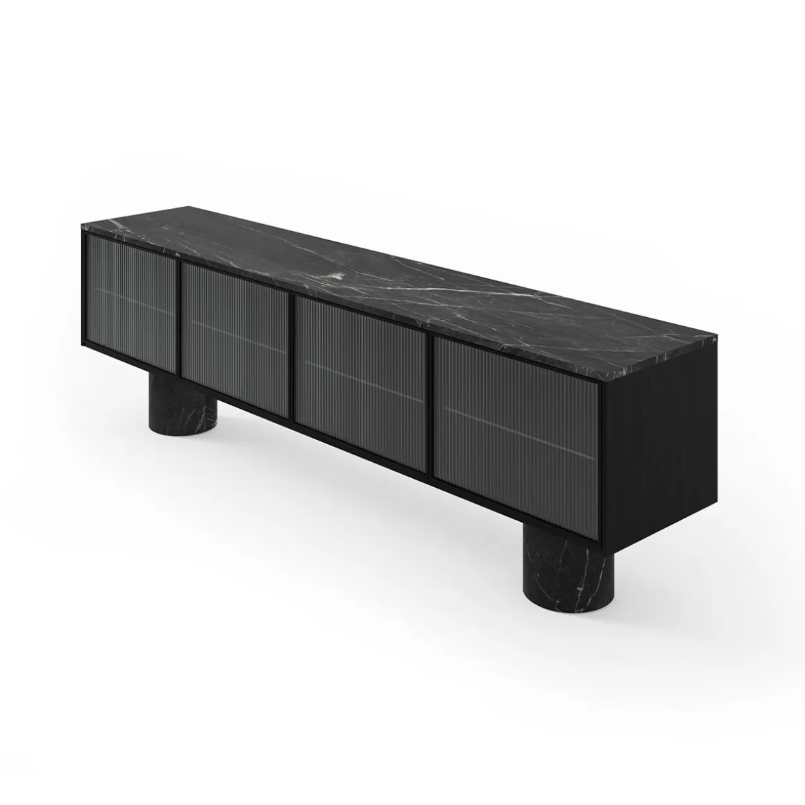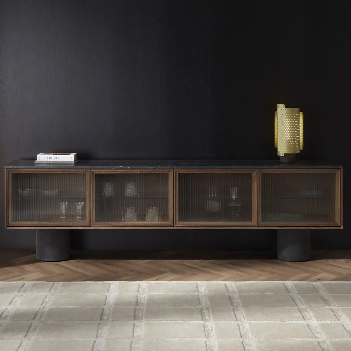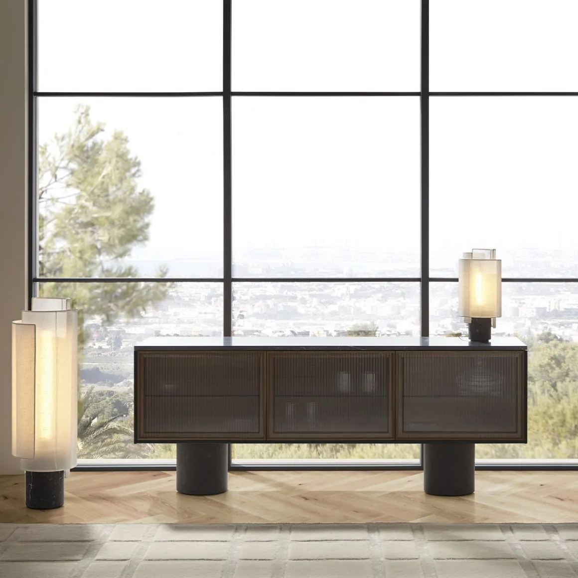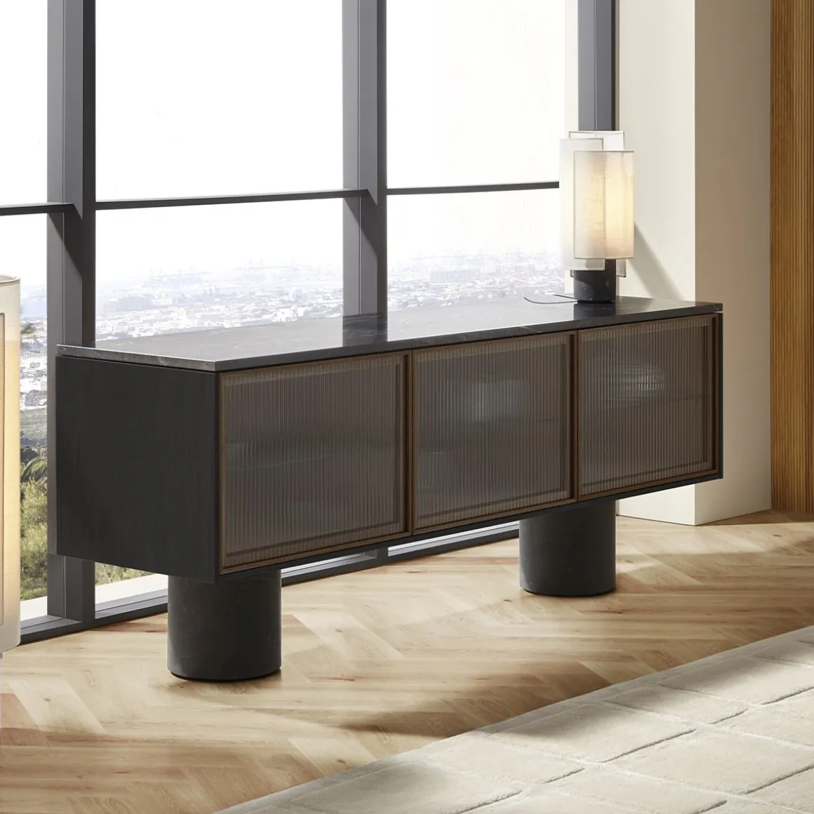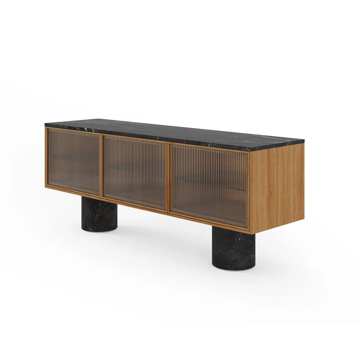 La collection Rio s’appuie sur mon langage de conception fondamental en travaillant avec des matériaux honnêtes et des artisans locaux pour réaliser des designs uniques. Rio c’est l’équilibre des matériaux et l’équilibre des proportions. Les buffets Rio ont en commun d’être tous posés sur des cylindres en marbre massif. Ils offrent stabilité et grandeur contrairement aux armoires précises et finement conçues sur le dessus. Les cadres en bois minces et les portes push-to-open avec différentes incrustations comme le bois structuré sont une sorte de pont entre les deux socles. Le dialogue entre tous les composants crée un caractère sophistiqué.