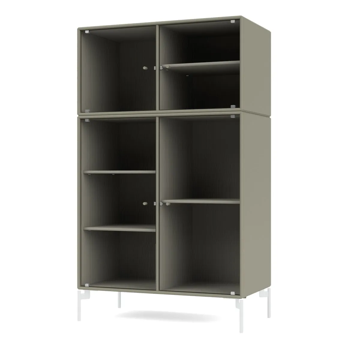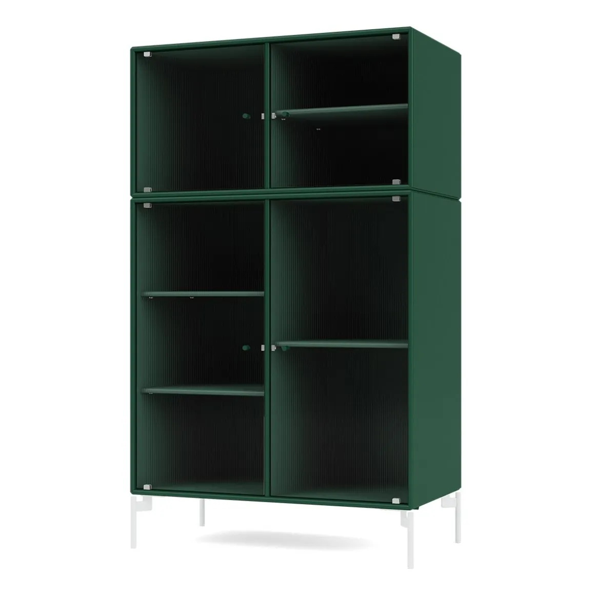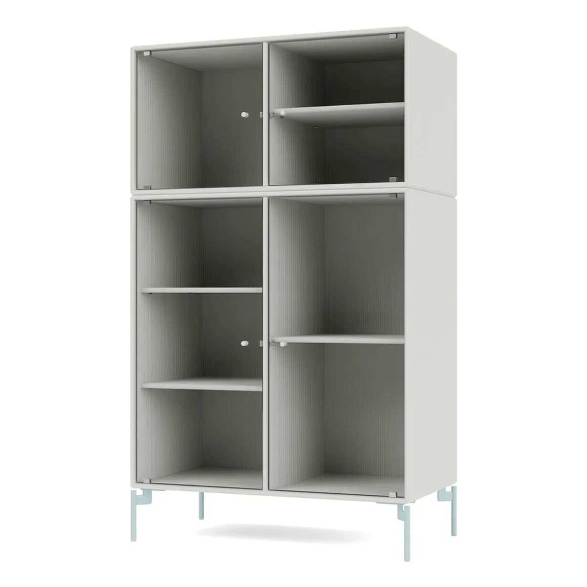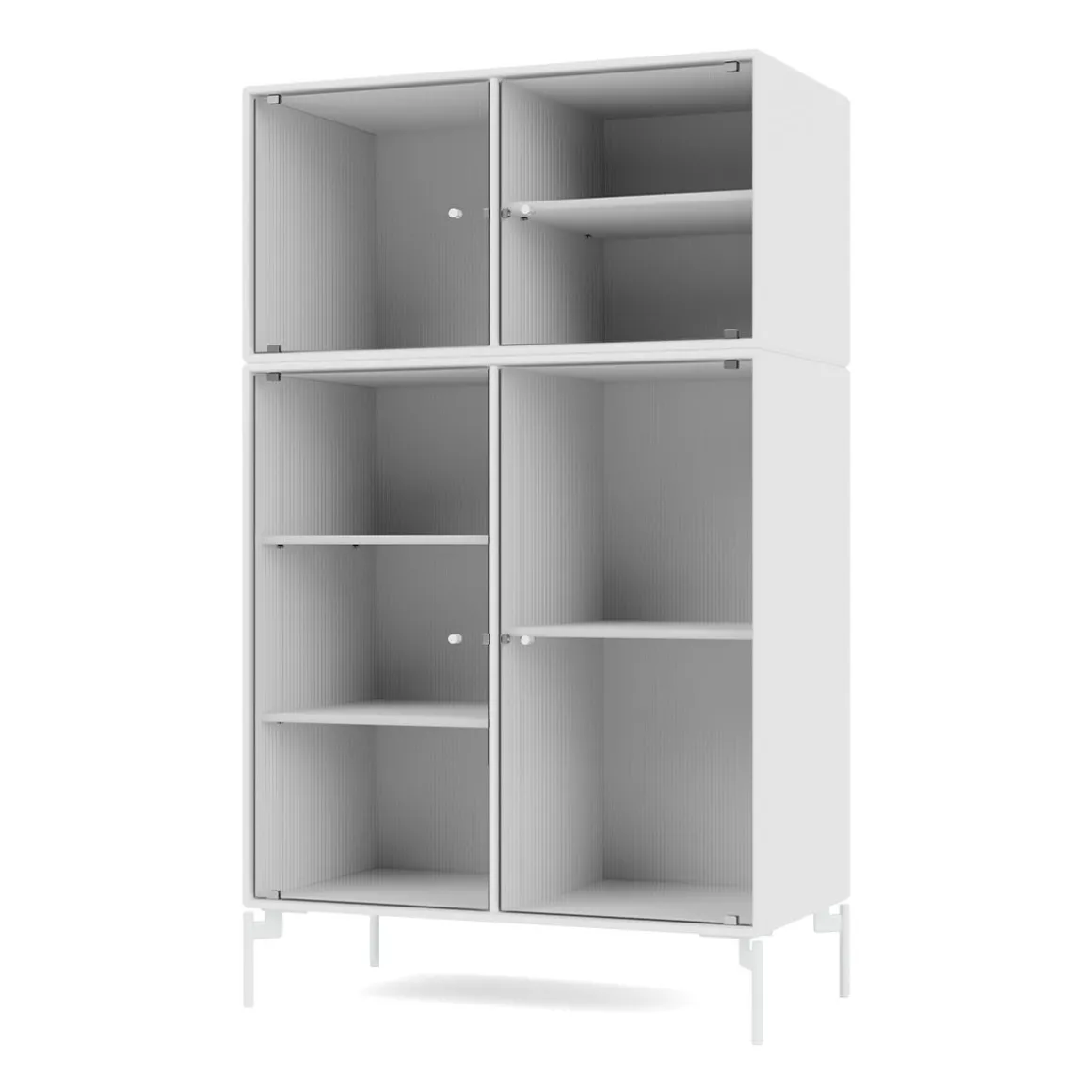RIPPLE III est une vitrine de taille moyenne avec 4 portes en verre ondulé. Elle est disponible avec des pieds, un socle ou des rails de suspension pour le montage sur un mur. L’armoire peut être utilisée comme buffet haut dans le salon ou pour exposer de la vaisselle dans la cuisine ou la salle à manger. La hauteur de 105 cm fait du dessus de l’armoire une surface d’exposition idéale pour les lampes, les vases et autres objets décoratifs. L’armoire dispose de 4 étagères mobiles avec des supports qui permettent de les organiser et de les réorganiser facilement selon les besoins