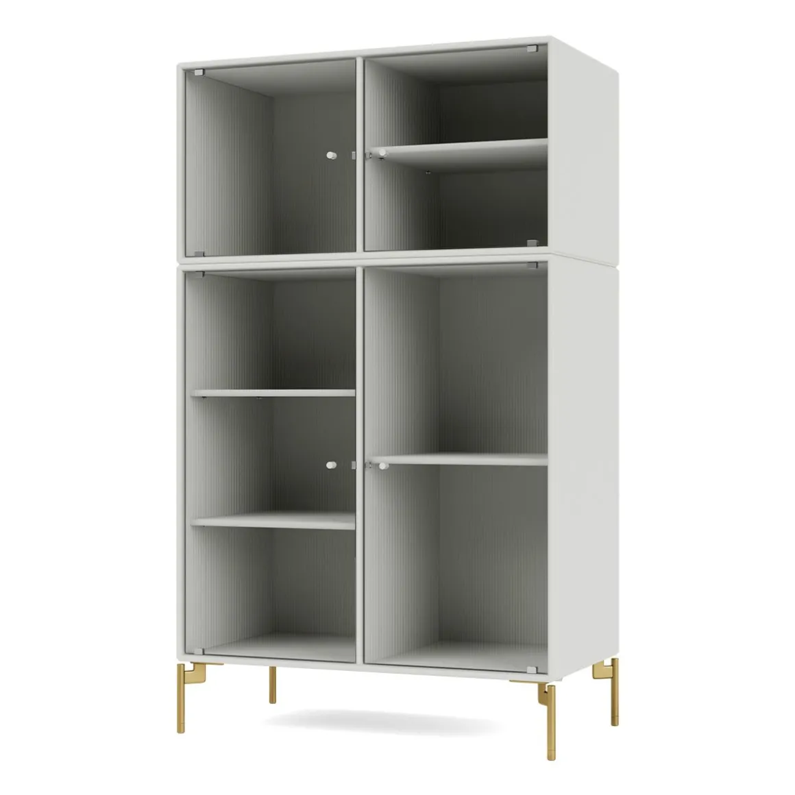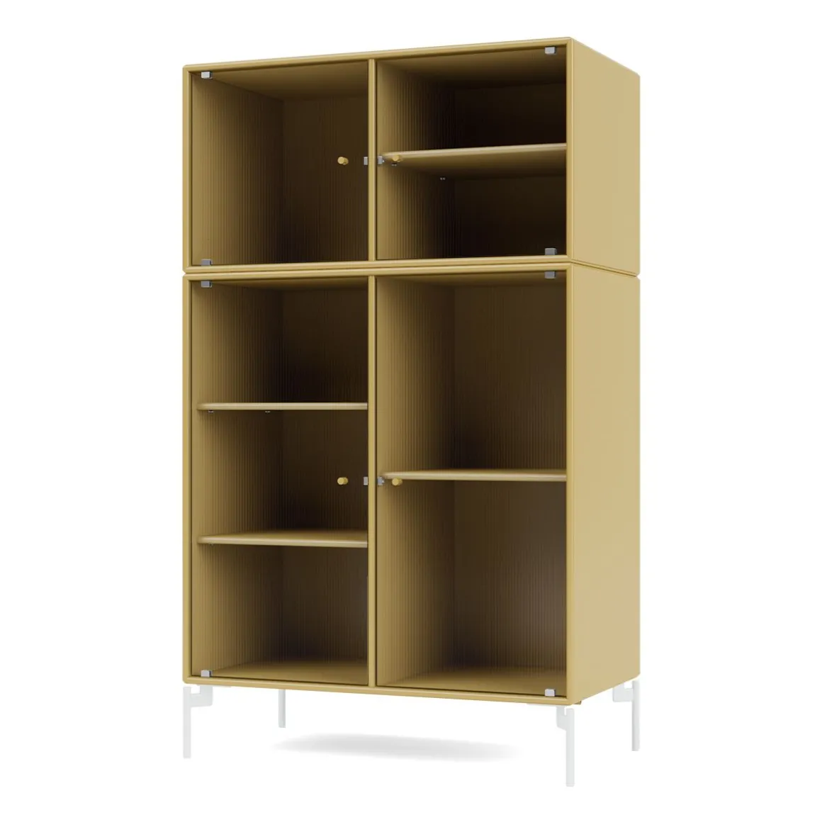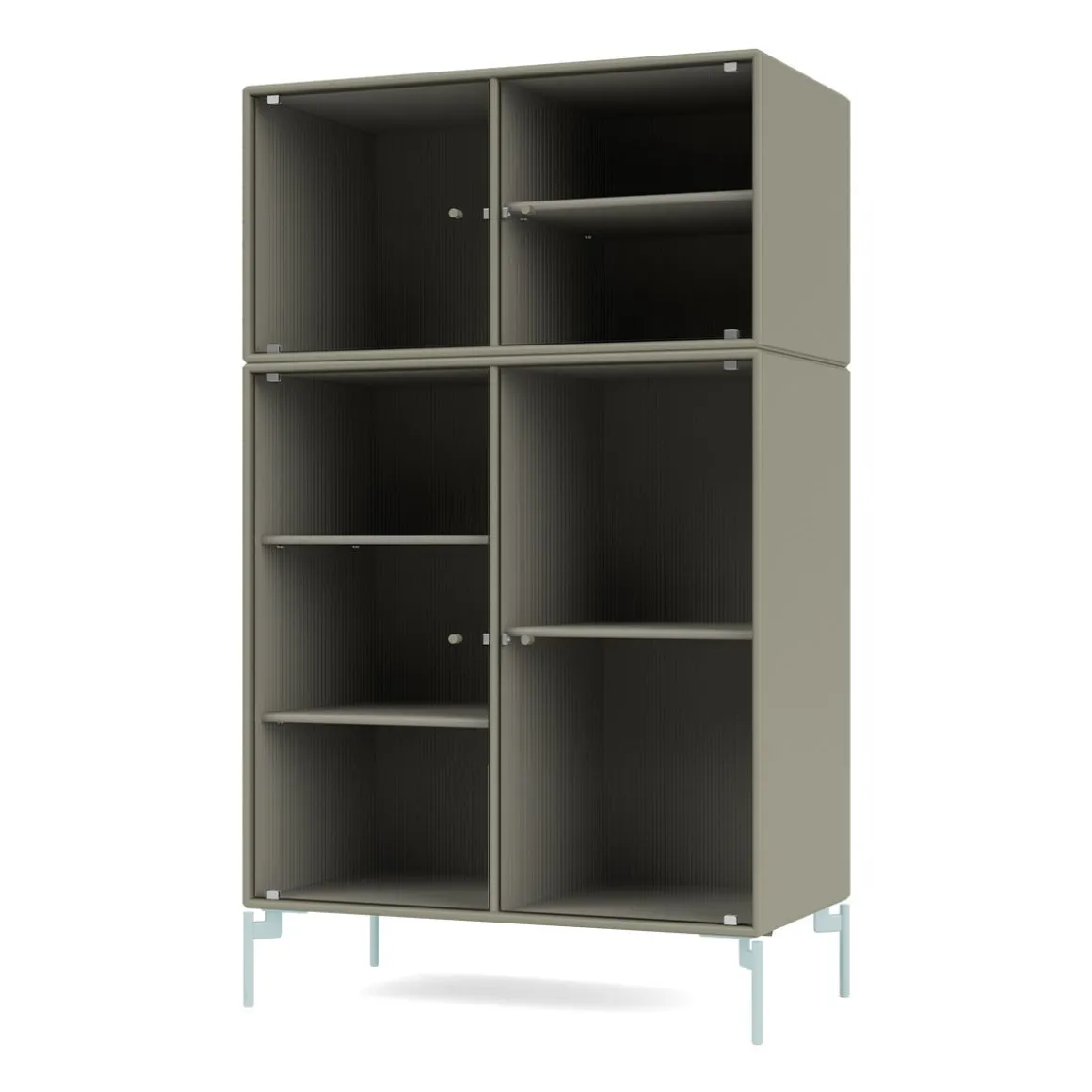 RIPPLE III est une vitrine de taille moyenne avec 4 portes en verre ondulé. Elle est disponible avec des pieds, un socle ou des rails de suspension pour le montage sur un mur. L’armoire peut être utilisée comme buffet haut dans le salon ou pour exposer de la vaisselle dans la cuisine ou la salle à manger. La hauteur de 105 cm fait du dessus de l’armoire une surface d’exposition idéale pour les lampes, les vases et autres objets décoratifs. L’armoire dispose de 4 étagères mobiles avec des supports qui permettent de les organiser et de les réorganiser facilement selon les besoins