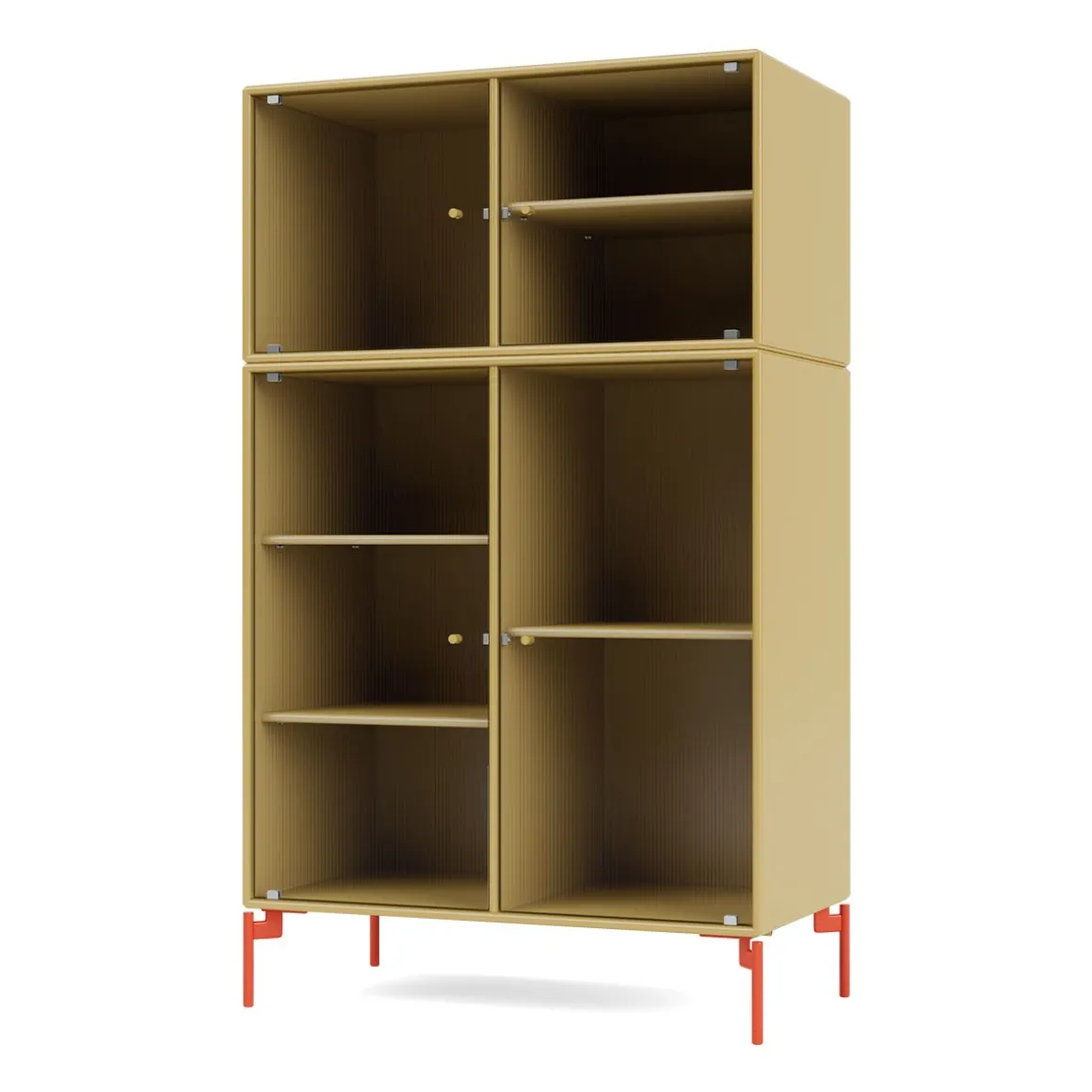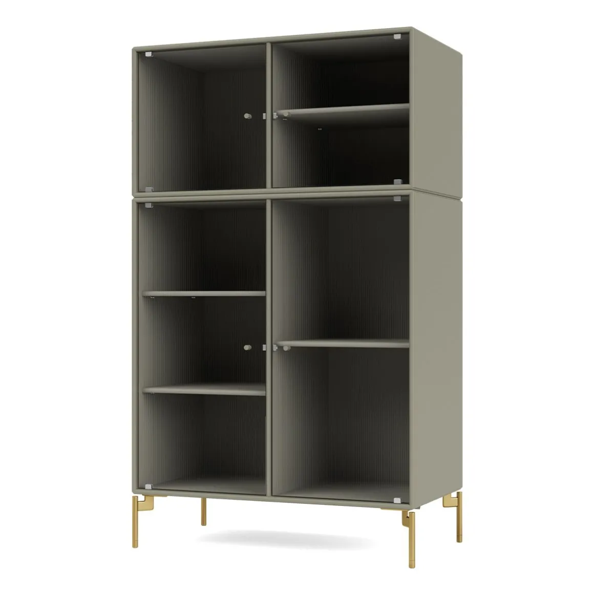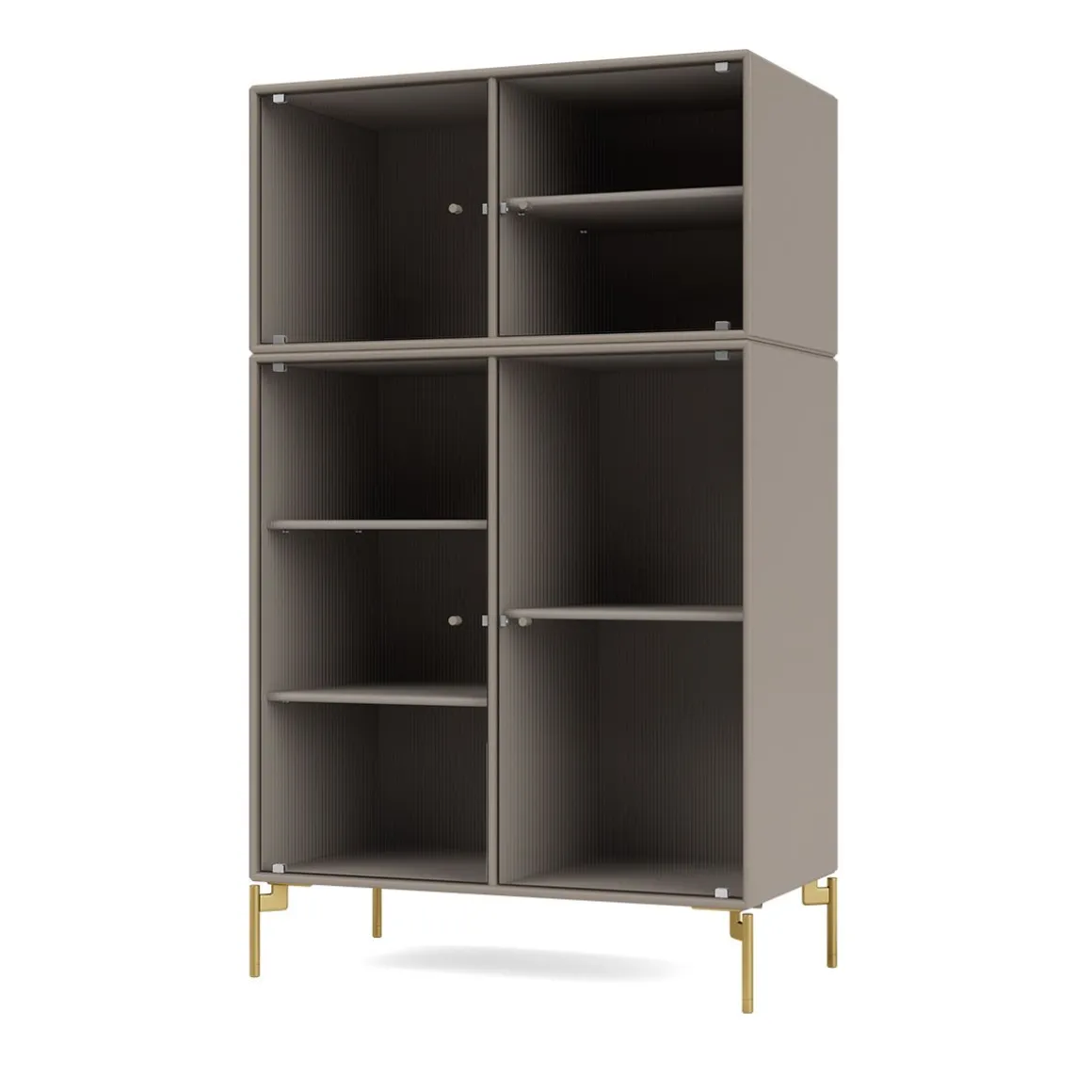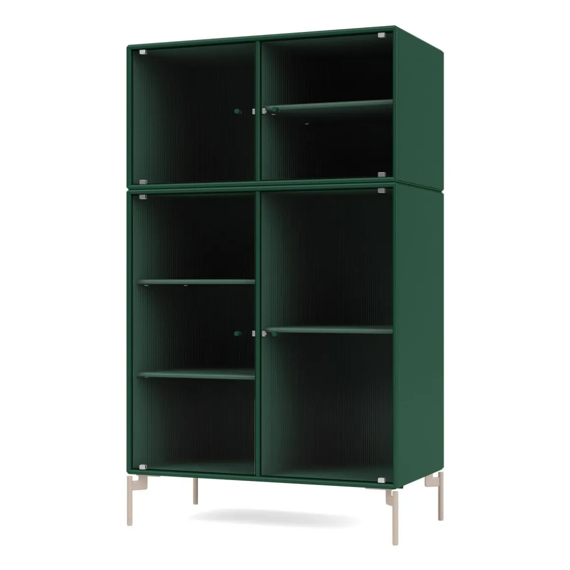 RIPPLE III est une vitrine de taille moyenne avec 4 portes en verre ondulé. Elle est disponible avec des pieds, un socle ou des rails de suspension pour le montage sur un mur. L’armoire peut être utilisée comme buffet haut dans le salon ou pour exposer de la vaisselle dans la cuisine ou la salle à manger. La hauteur de 105 cm fait du dessus de l’armoire une surface d’exposition idéale pour les lampes, les vases et autres objets décoratifs. L’armoire dispose de 4 étagères mobiles avec des supports qui permettent de les organiser et de les réorganiser facilement selon les besoins