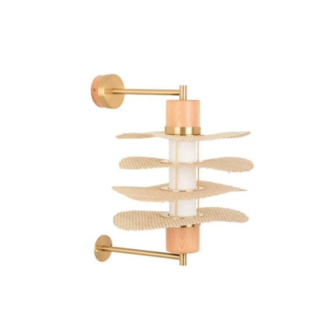 Applique 1 lumière. Superposition de 4 abat-jour en matière Varian®. Patère déportée en chêne clair et métal finition laiton brossé. Diffuseur tube en verre opale.