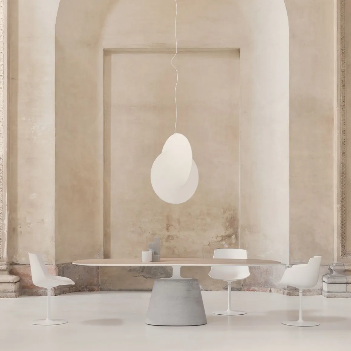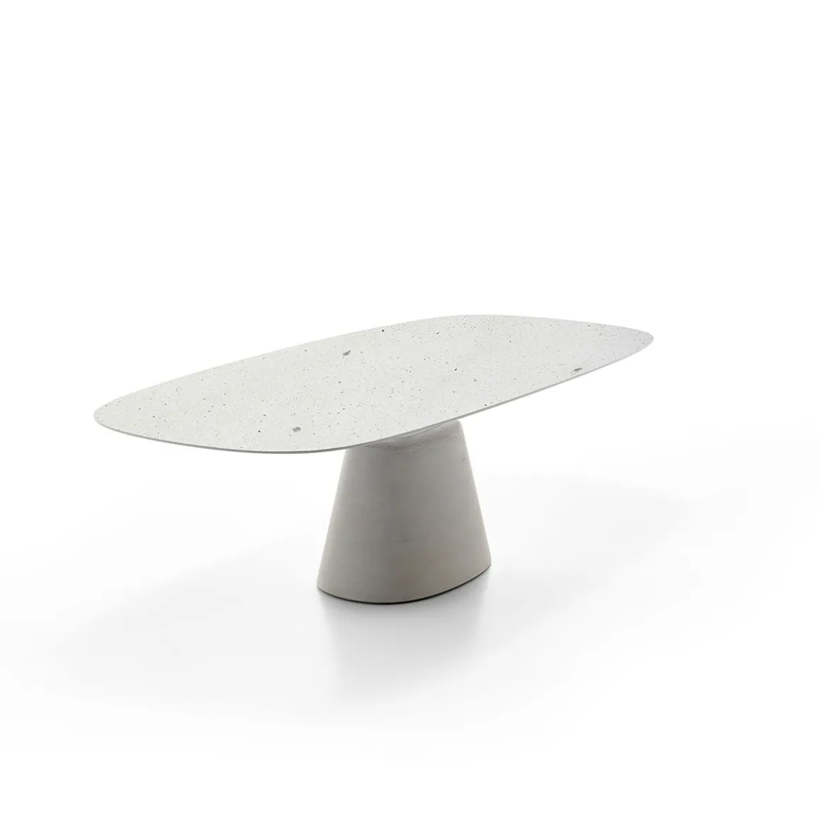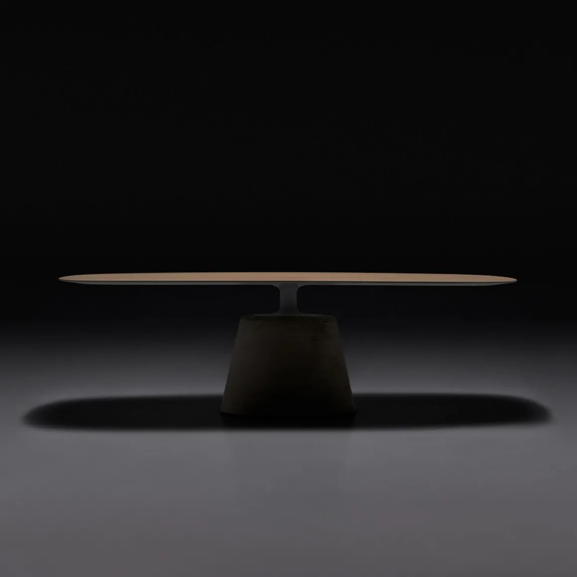 Rock Table est une famille de tables d’intérieur et d’extérieur à la silhouette élégante et fluide, caractérisée par une solide base conique centrale et un plateau fin qui semble flotter. Le nouveau modèle présente un plateau avec une forme inhabituelle et intéressante : un rectangle aux coins arrondis avec une physionomie qui favorise une relation directe entre ceux qui sont assis autour de la table, facilitant l’interaction et le dialogue. La base en béton allégé supporte un nouveau plateau en bois léger en chêne blanchi et teinté foncé et en noyer Canaletto. Un style qui allie radicalité et sensualité, douceur et audace, et qui complète les environnements domestiques modernes ainsi que les salons, bureaux, salles de réception ou de réunion, où il laisse sa marque unique et audacieuse.