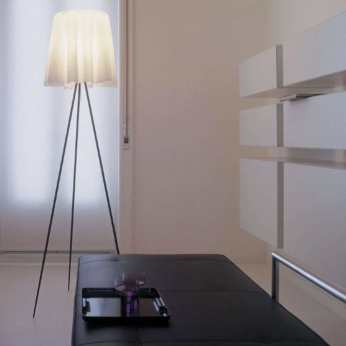 Créé en 1994 par Philippe Starck, le lampadaire Rosy Angelis associe une apparence à la fois minimaliste, poétique et humoristique : le diffuseur en tissu spécial ultra-léger est associé à un jupon…la lumière est sous le jupon… Le diffuseur vient se poser sur un support à trois branches, disponible en acier verni gris.