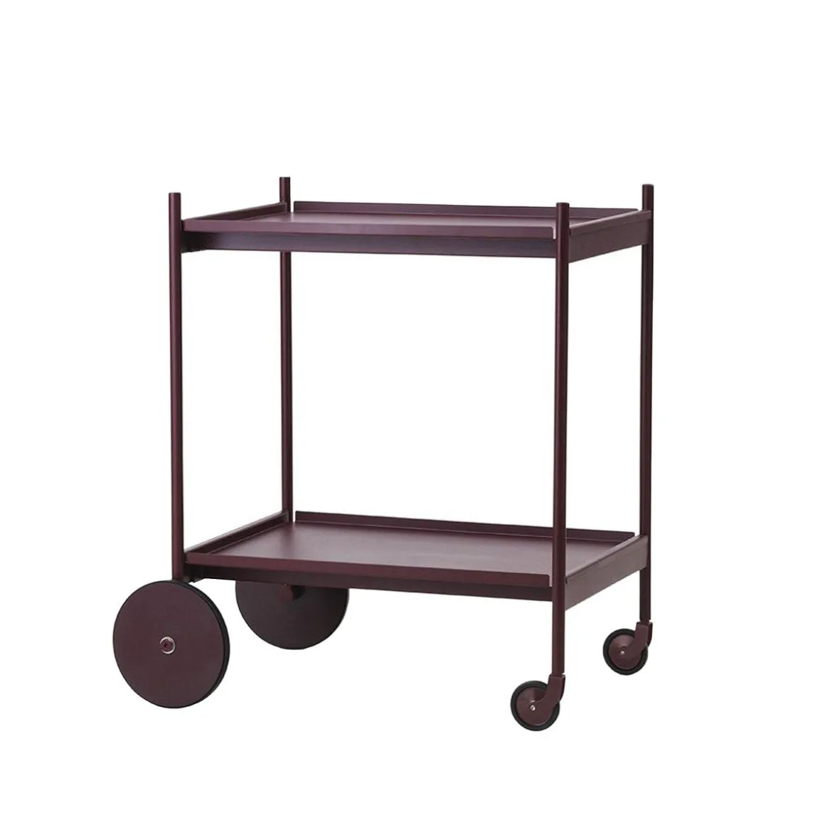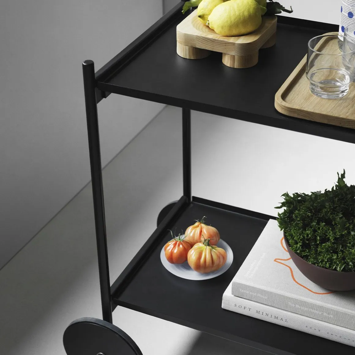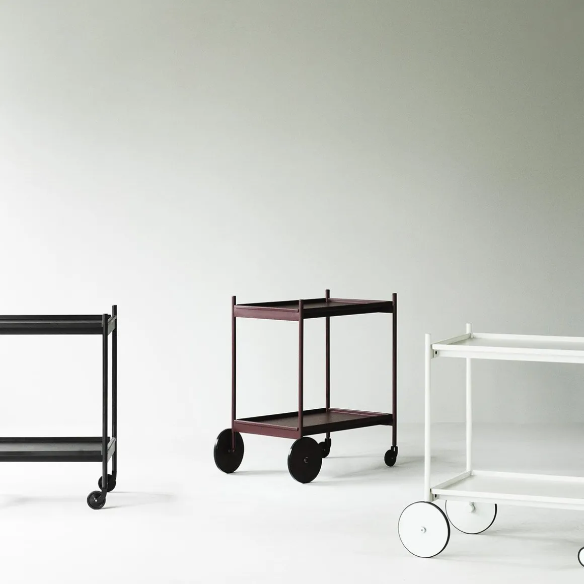 Rul trolley de Normann Copenhagen par Simon Legald. Rul est un chariot élégant et minimaliste, fabriqué en acier thermolaqué durable. Son cadre fin lui confère une silhouette élégante, complétée par quatre roues : deux plus petites pour une maniabilité à 360° et deux plus grandes pour la stabilité. Il est équipé de deux plateaux amovibles, pour un service aisé et adaptable aux différents besoins du quotidien.
