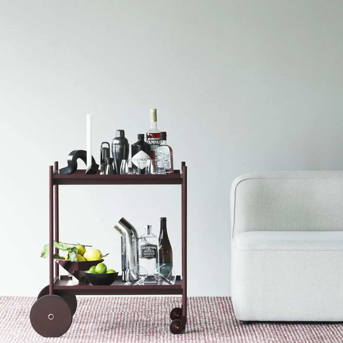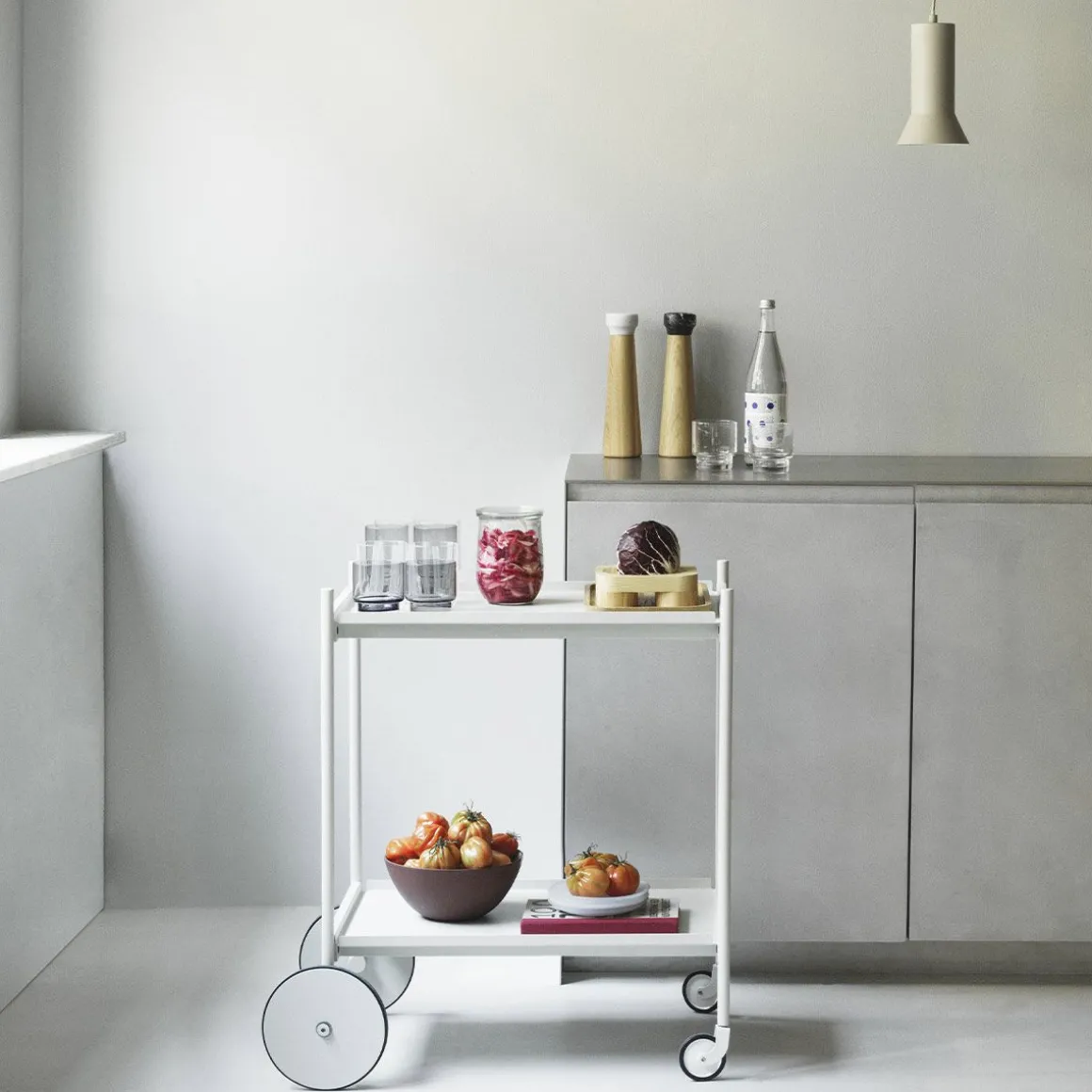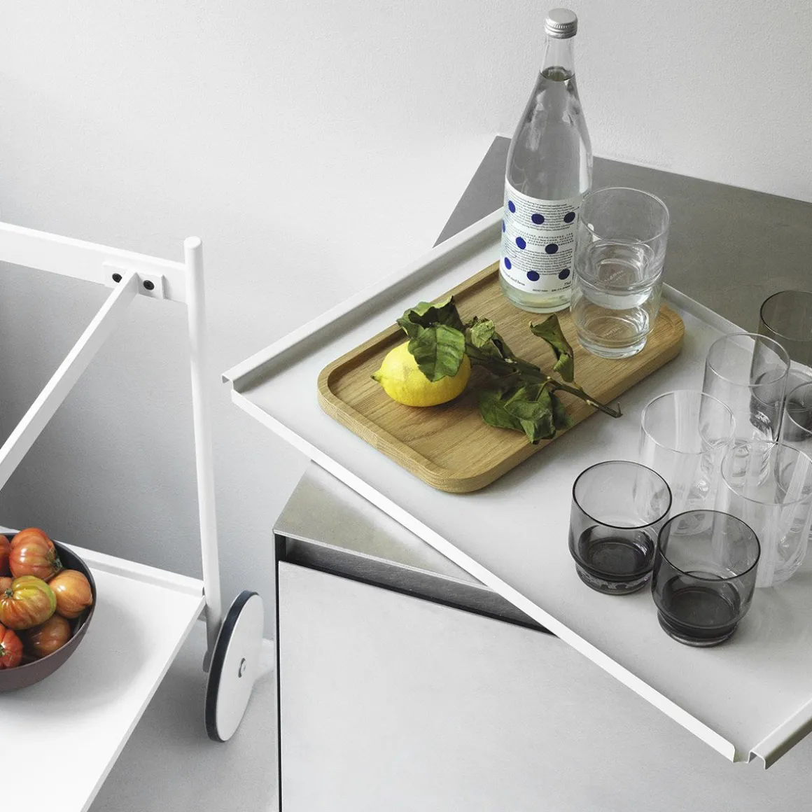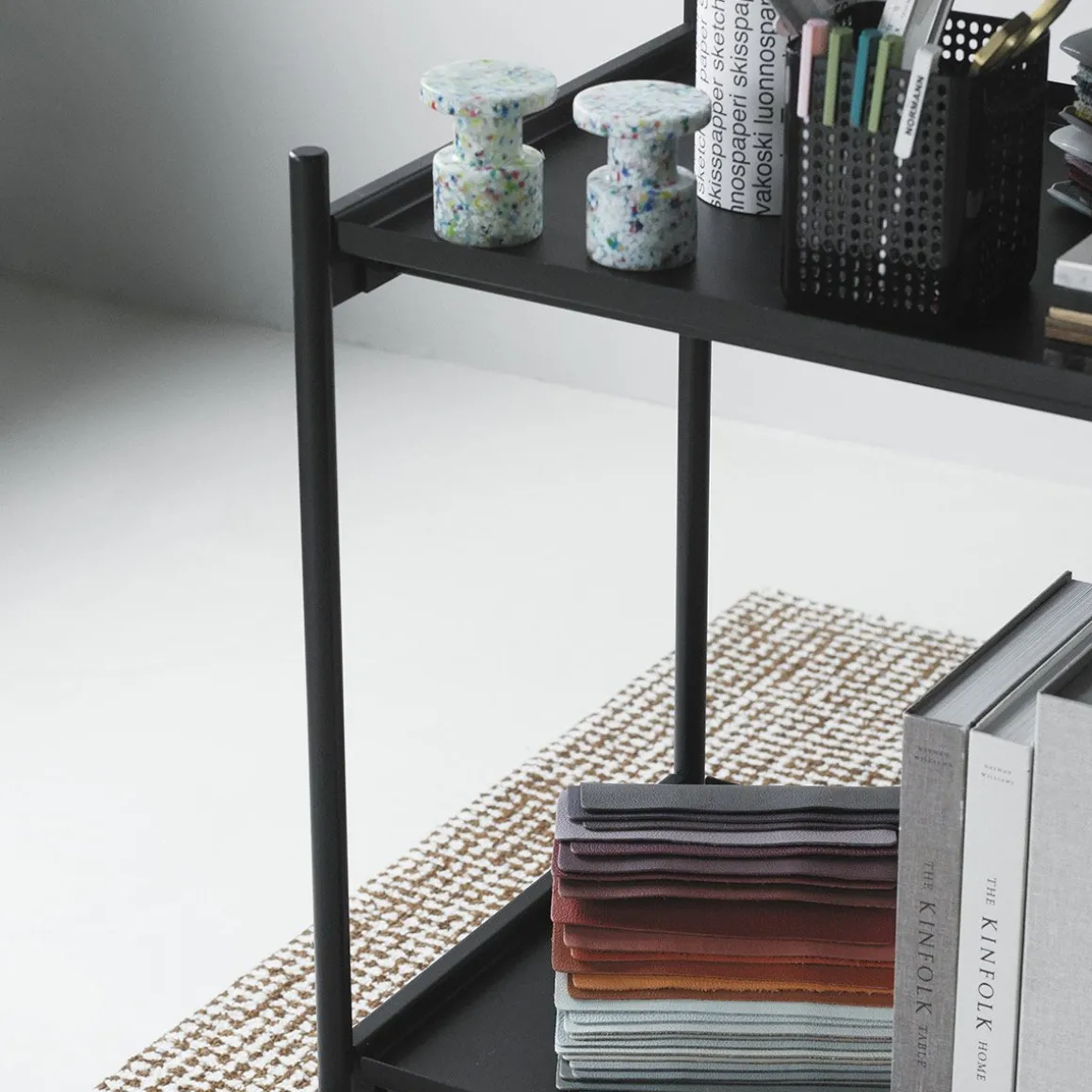 Rul trolley de Normann Copenhagen par Simon Legald. Rul est un chariot élégant et minimaliste, fabriqué en acier thermolaqué durable. Son cadre fin lui confère une silhouette élégante, complétée par quatre roues : deux plus petites pour une maniabilité à 360° et deux plus grandes pour la stabilité. Il est équipé de deux plateaux amovibles, pour un service aisé et adaptable aux différents besoins du quotidien.