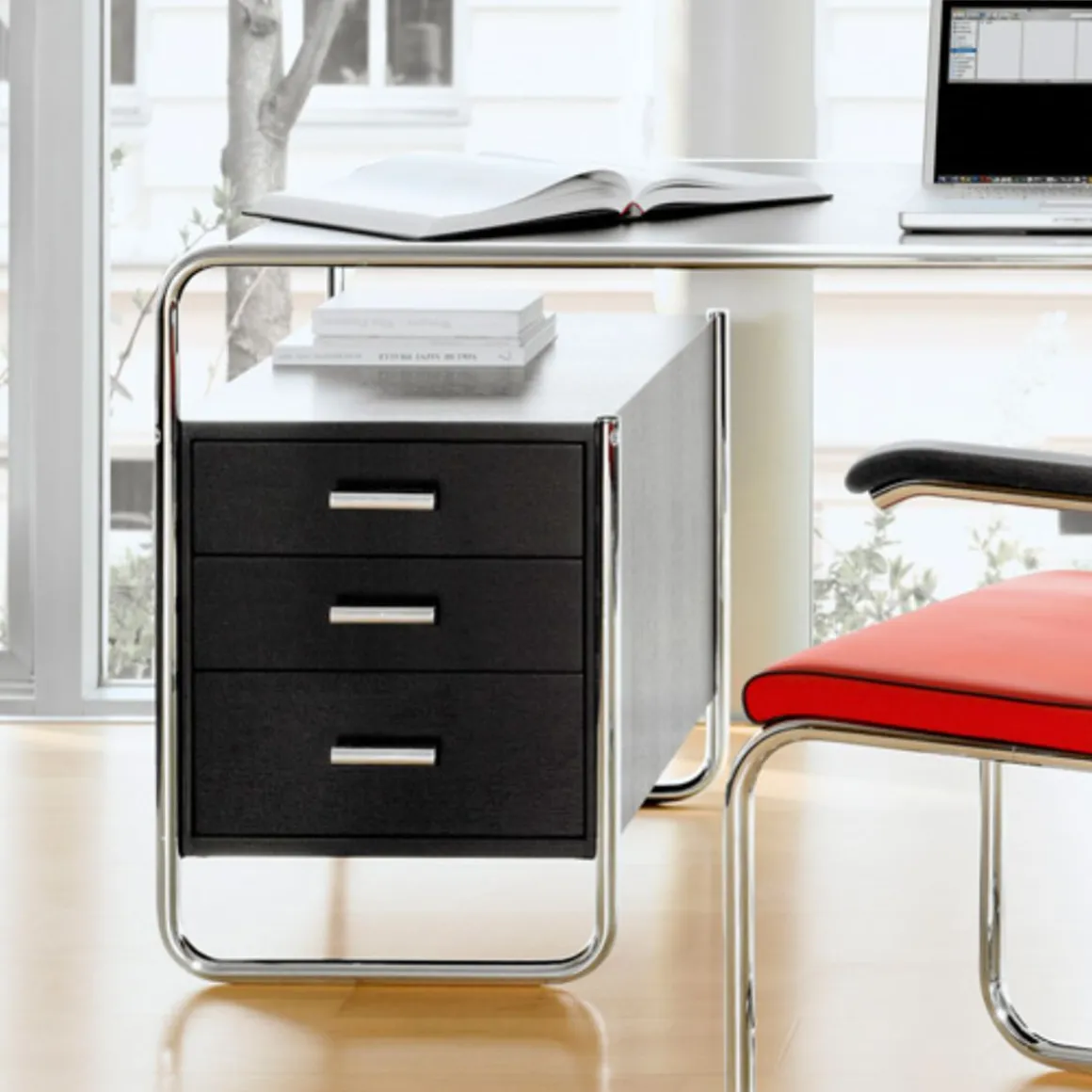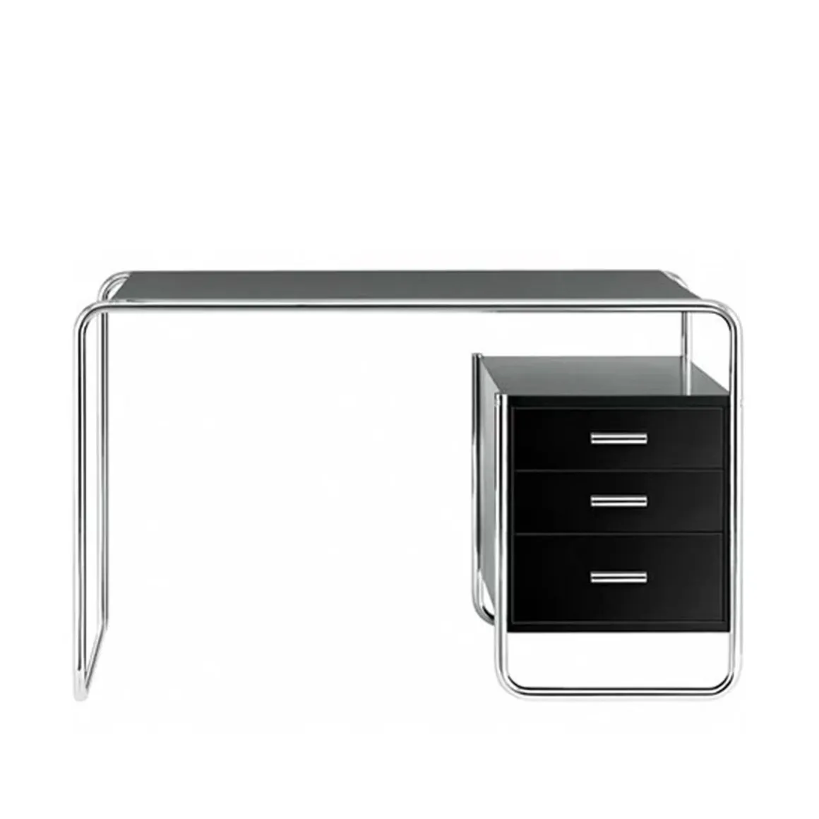 C’est comme si Marcel Breuer avait anticipé les bureaux à domicile et les ordinateurs mobiles d’aujourd’hui : le bureau compact en tube d’acier S 285 qu’il a conçu est un compagnon élégant pour le style de vie et le travail modernes. Le bureau en acier tubulaire S 285 de Marcel Breuer pour Thonet est un exemple réussi de la revendication programmatique du Bauhaus de combiner l’art et la technologie dans une nouvelle entité