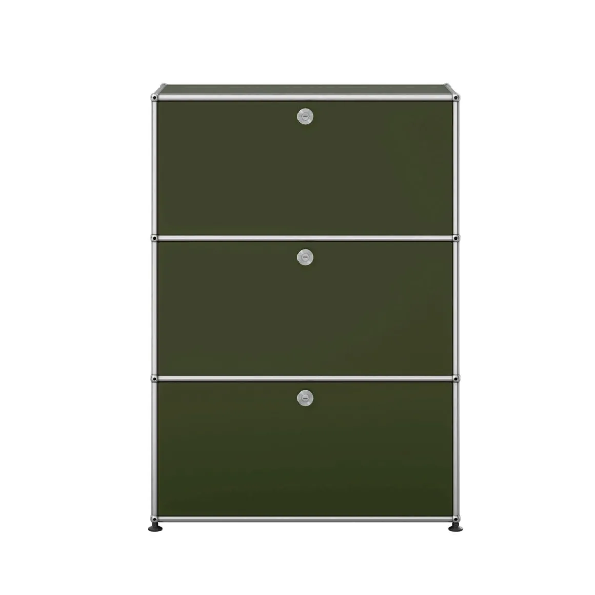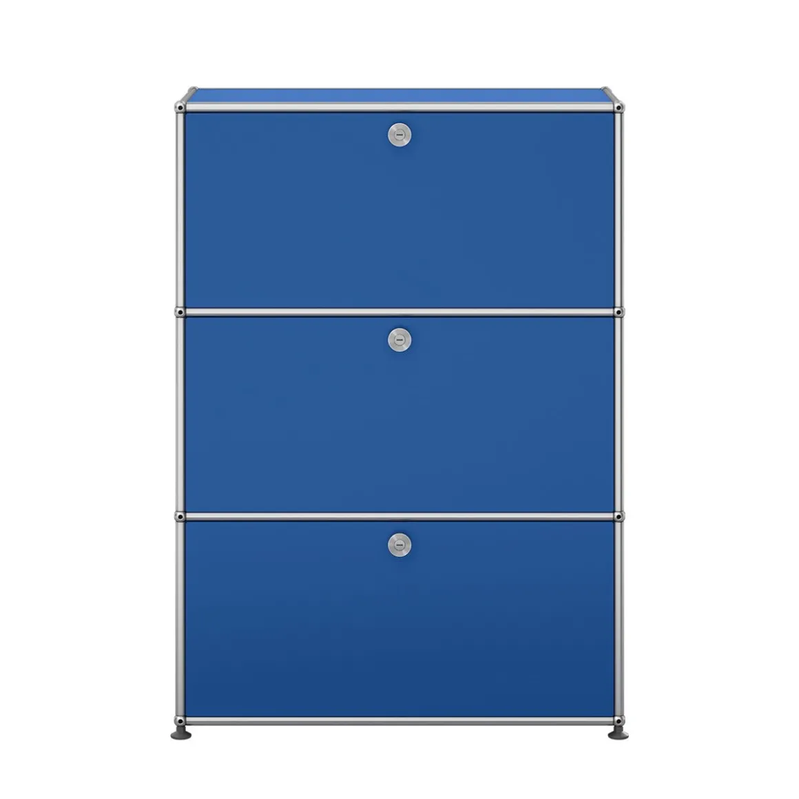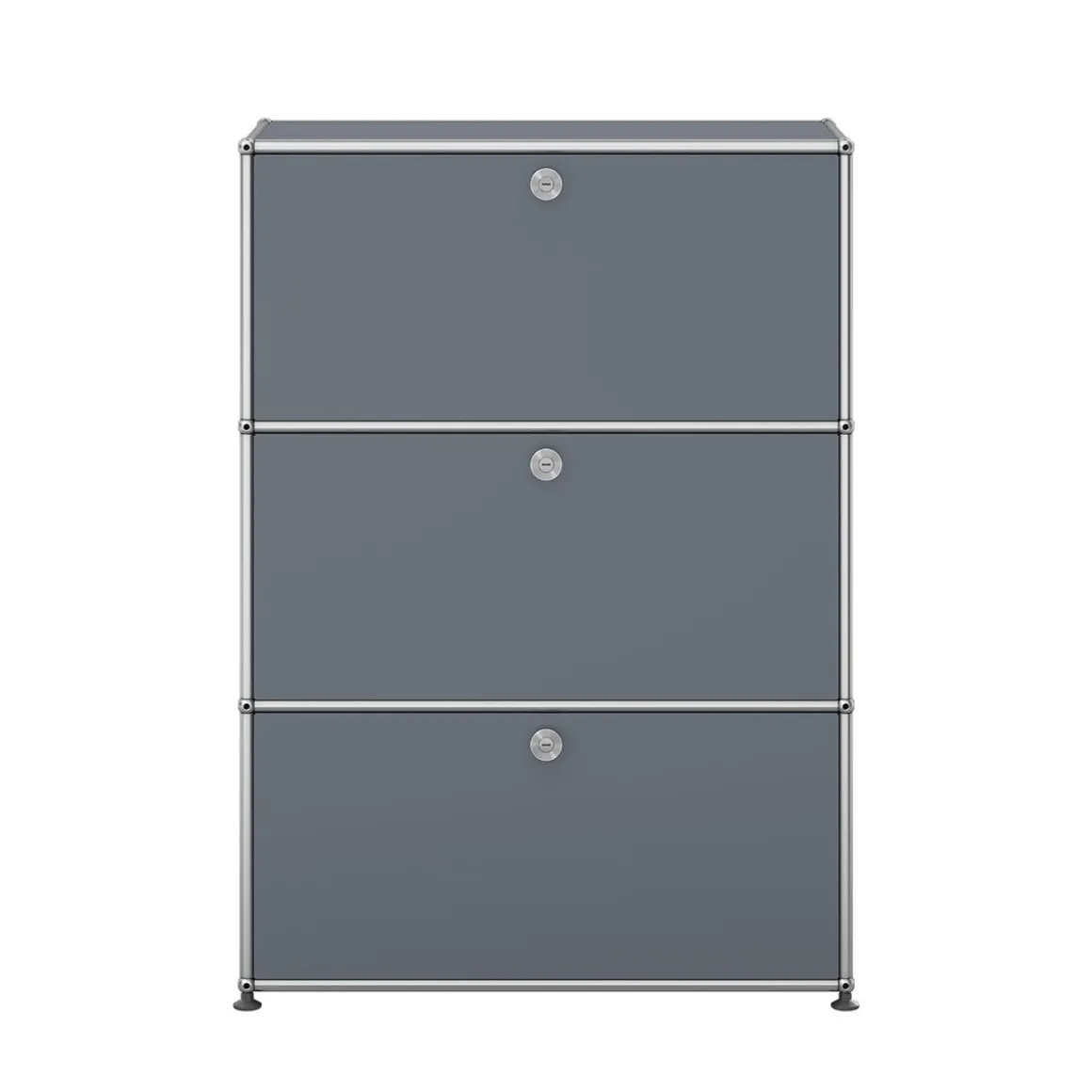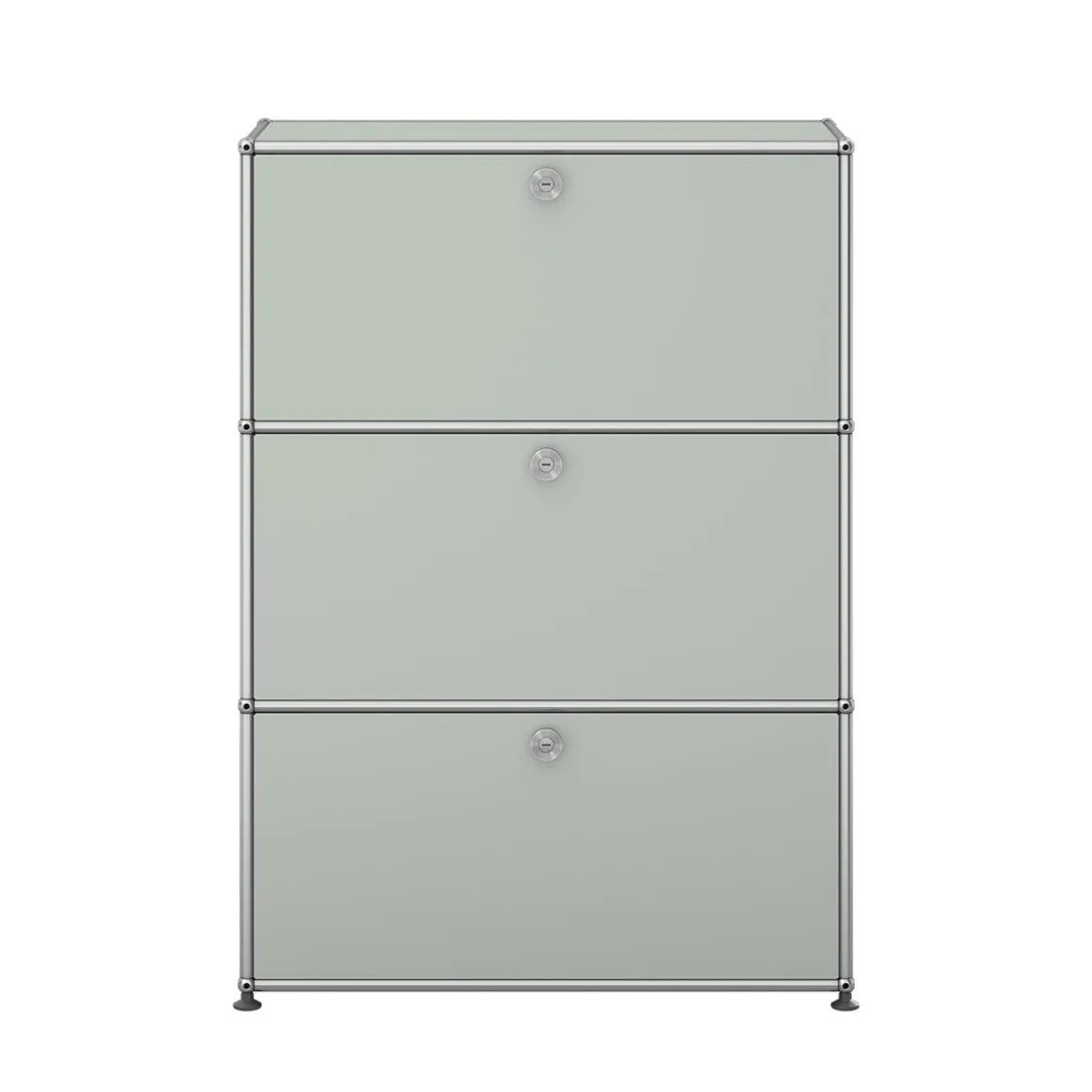 Meuble de rangement composé de 3 modules équipés de portes abattantes (poignées sans serrure).