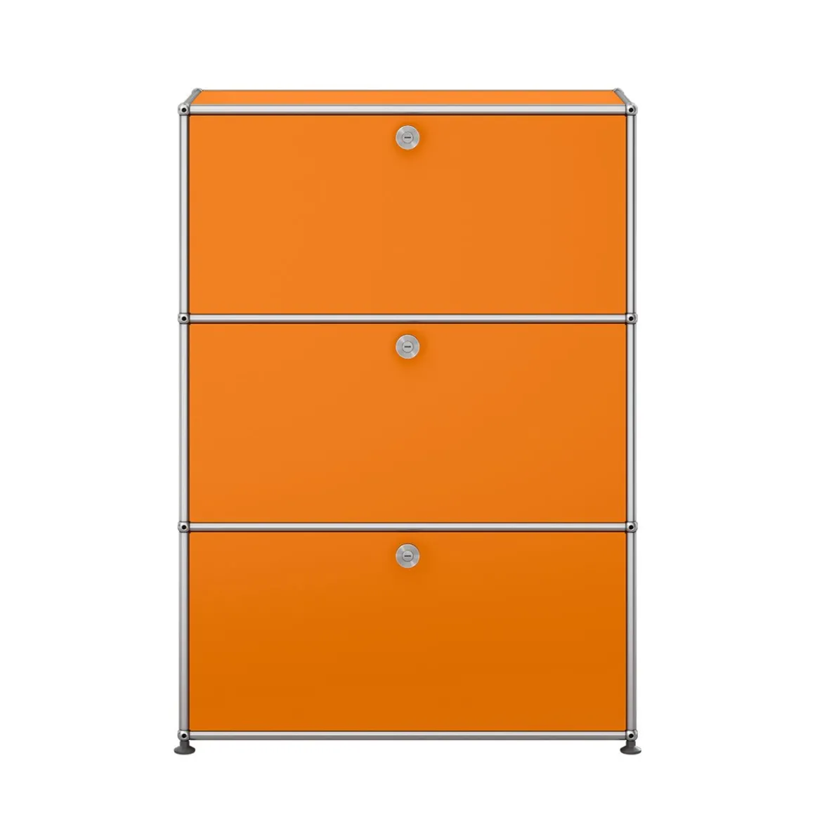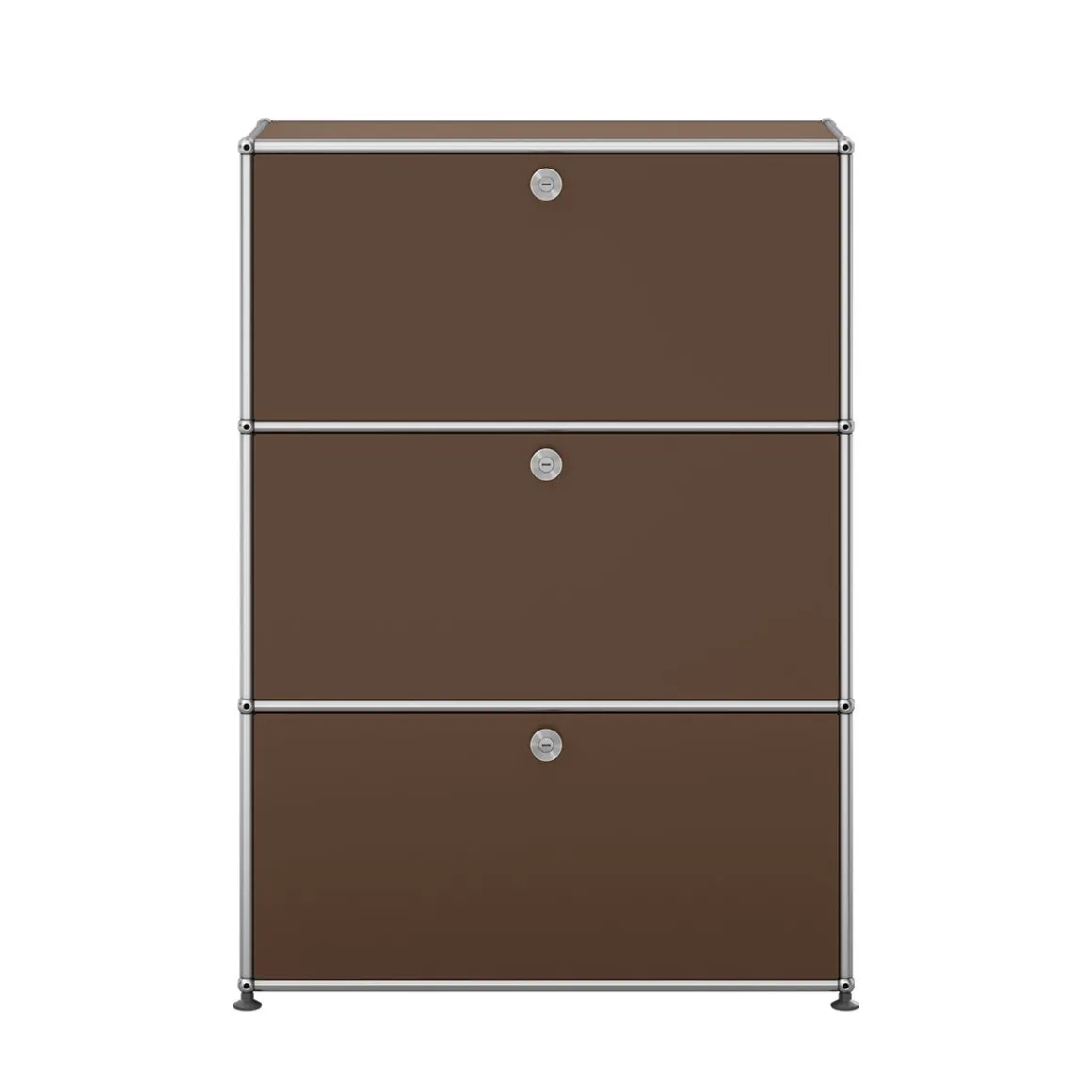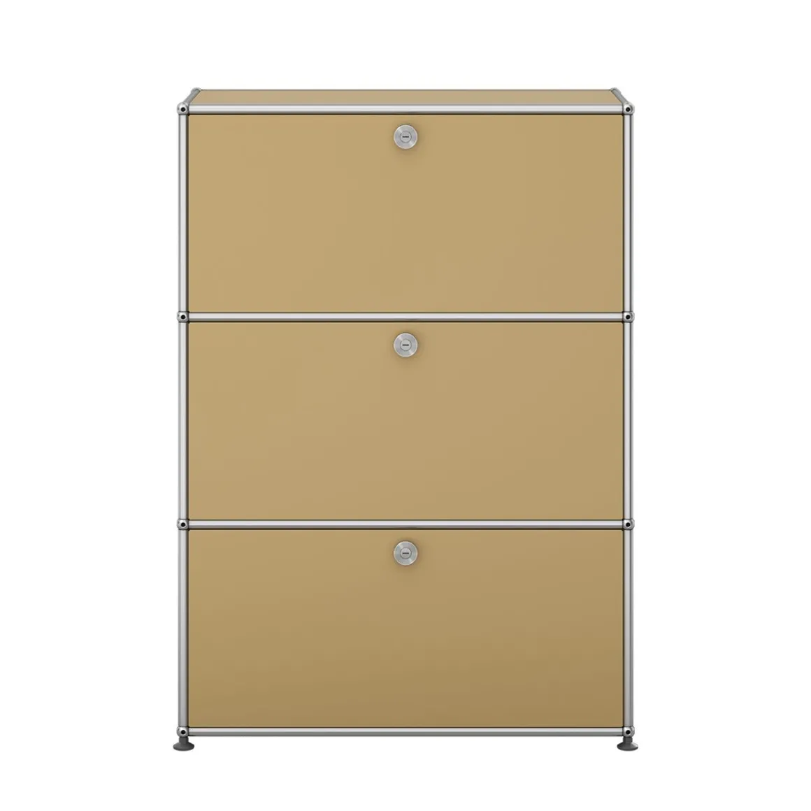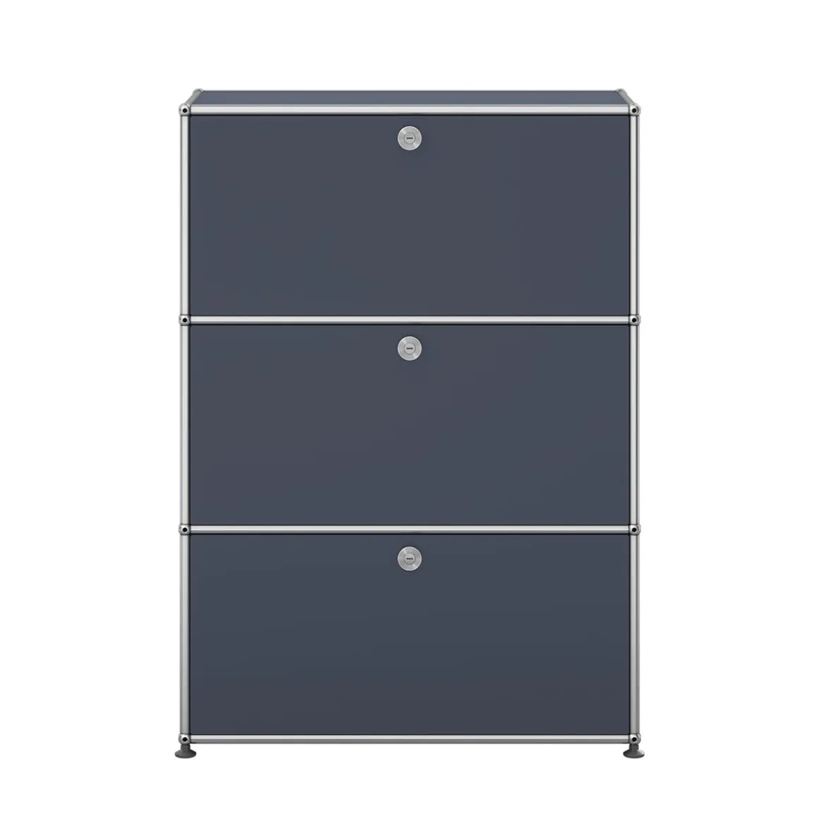 Meuble de rangement composé de 3 modules équipés de portes abattantes (poignées sans serrure).