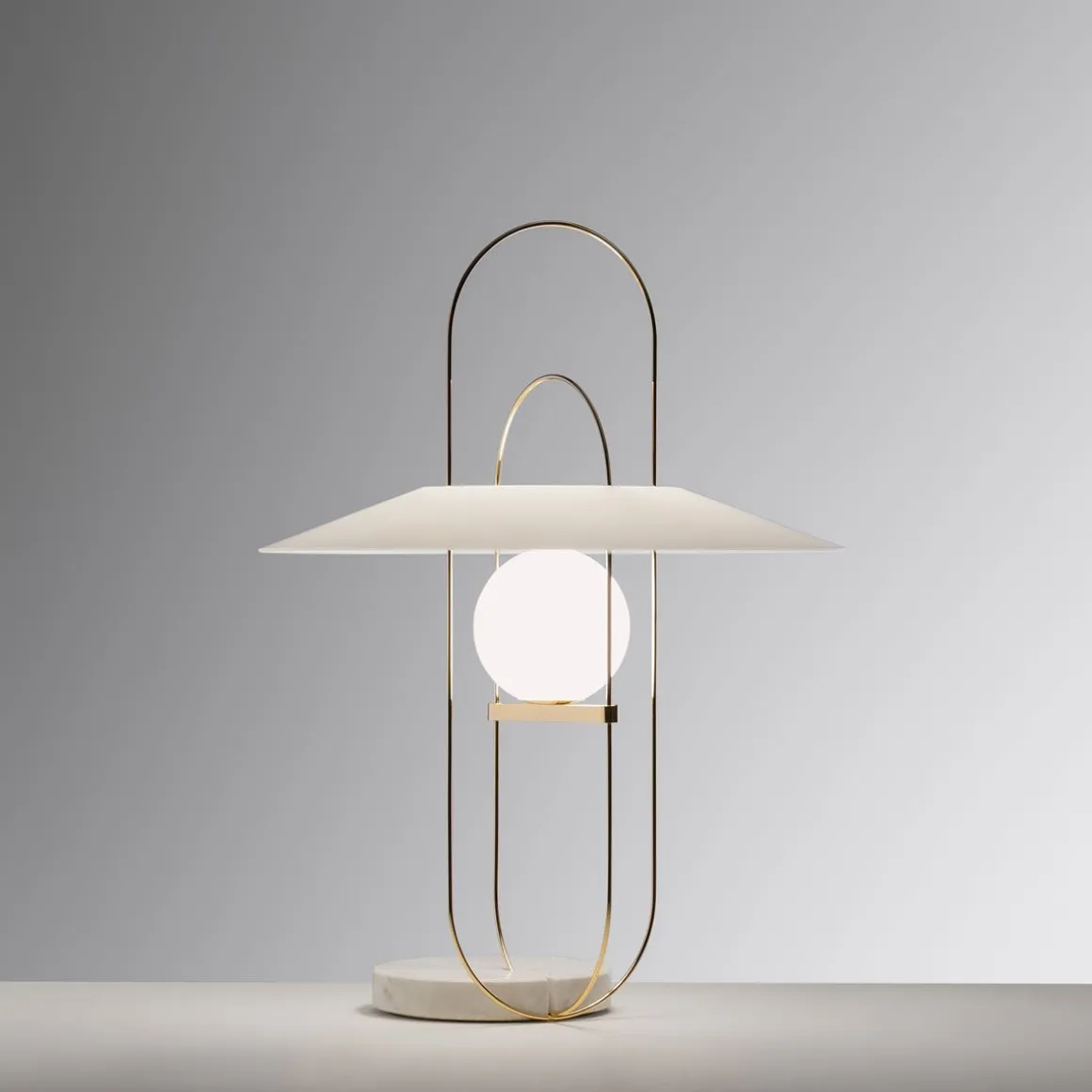 Matériaux : cadre en métal galvanisé, socle en marbre de Carrare, diffuseur sphérique en verre soufflé opalin satiné et diffuseur évasé peint en satin