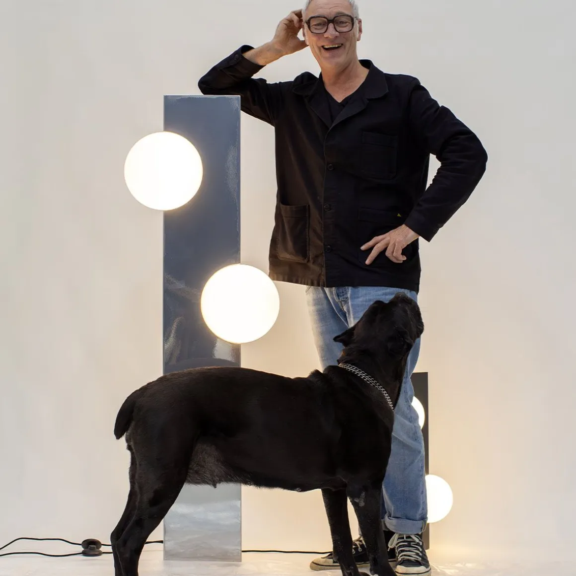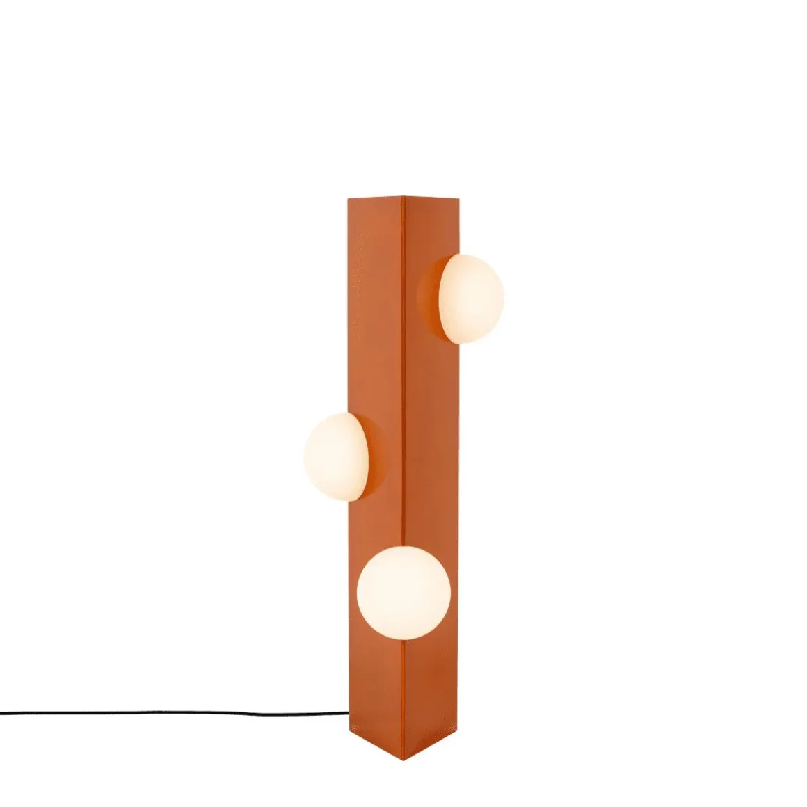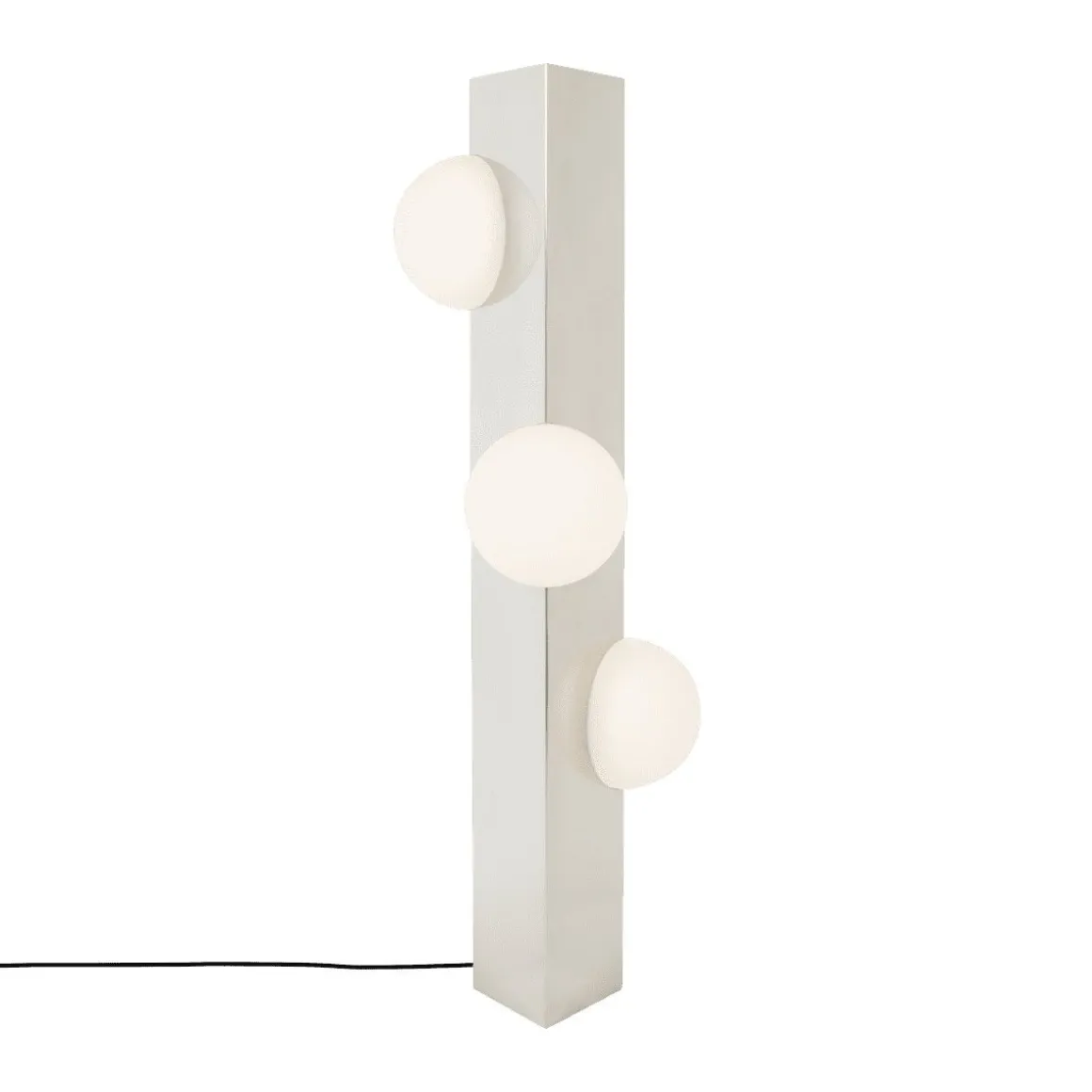 Sfera de Pulpo par Victoria Wilmotte. La lampe Sfera se distingue par son cadre triangulaire en acier, disponible en plusieurs finitions. Trois globes soufflés à la main diffusent une lumière vive et sculpturale, créant une ambiance austère et artistique, incarnant parfaitement l’univers archaïque et avant-gardiste de Victoria Wilmotte.