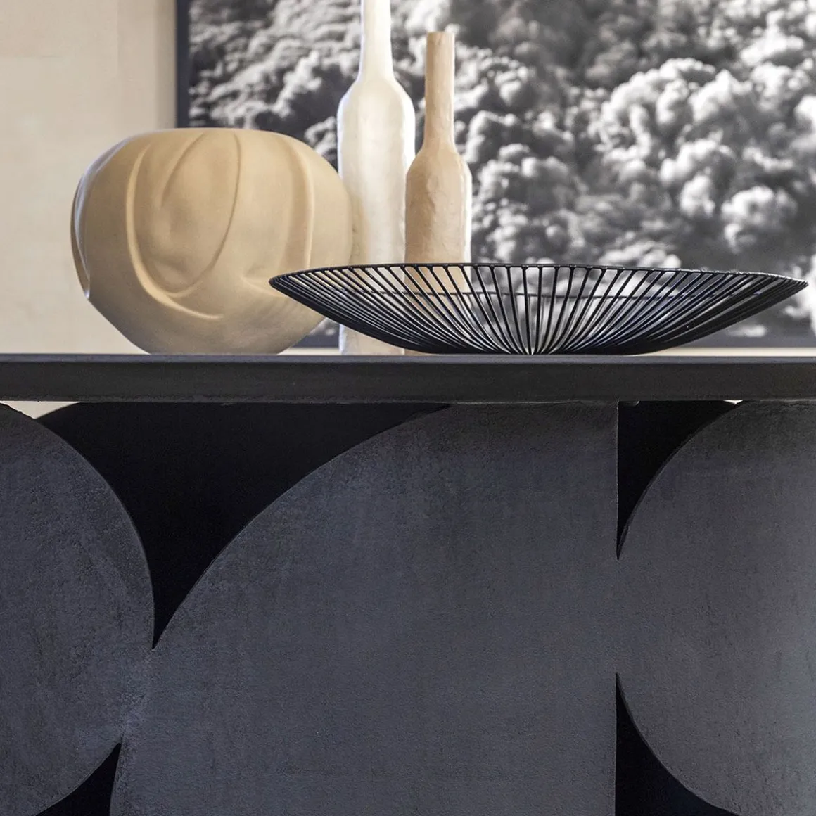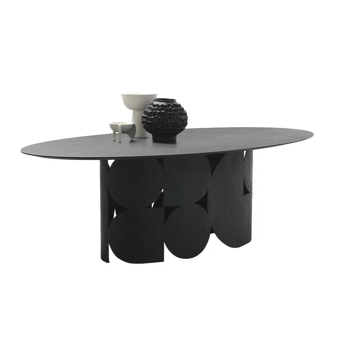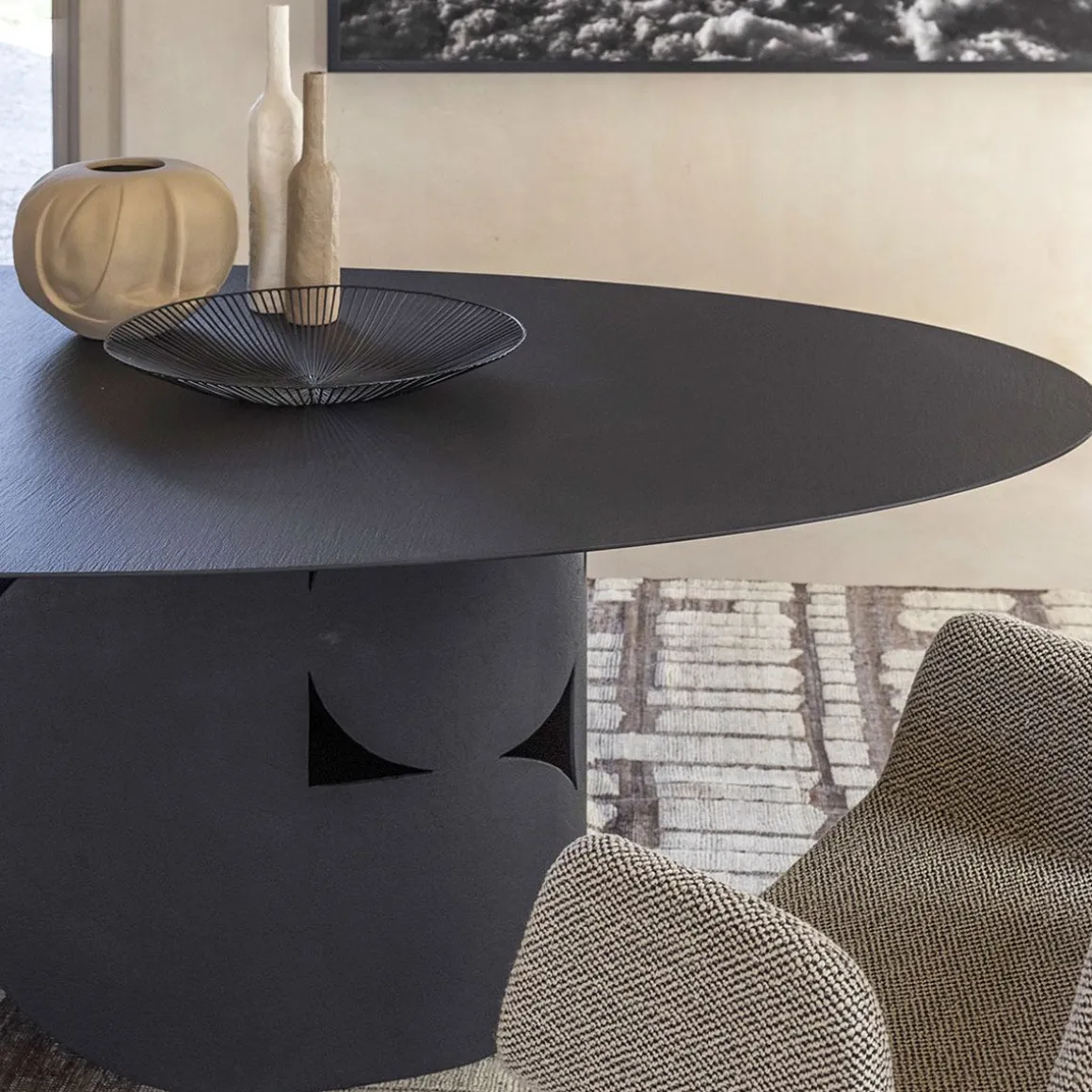 Table avec base en métal perforé et plateau en bois. Disponible dans les finitions : laquée mate ou brillante dans toutes les couleurs selon les échantillons ou texturée brossée à la main dans les couleurs selon les échantillons. L’équilibre esthétique entre le plateau et le pied central au salon une forte personnalité.