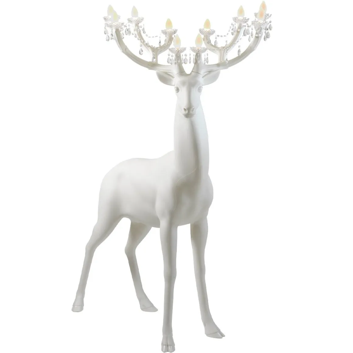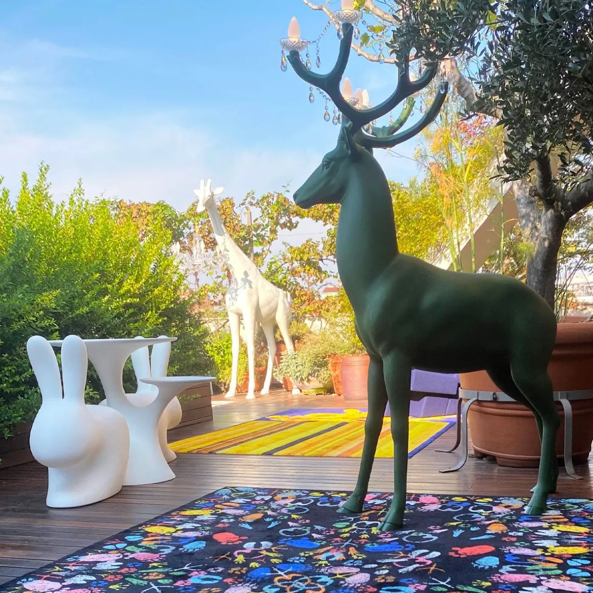 Sherwood de Qeeboo par Marcantonio. Sherwood est un impressionnant cerf de 2 mètres de haut dont les bois deviennent des lustres décorés de cristaux et de pampilles. La forte énergie naturelle de l’animal est immortalisée par Marcantonio qui imagine le cerf se déplaçant fièrement dans une forêt créant, grâce à ses puissantes cornes lumineuses, des lueurs magiques dans la nuit, comme s’il était un guide à suivre. Dans cet univers onirique entre fantaisie et réalité, Sherwood devient le protagoniste des espaces intérieurs et extérieurs.