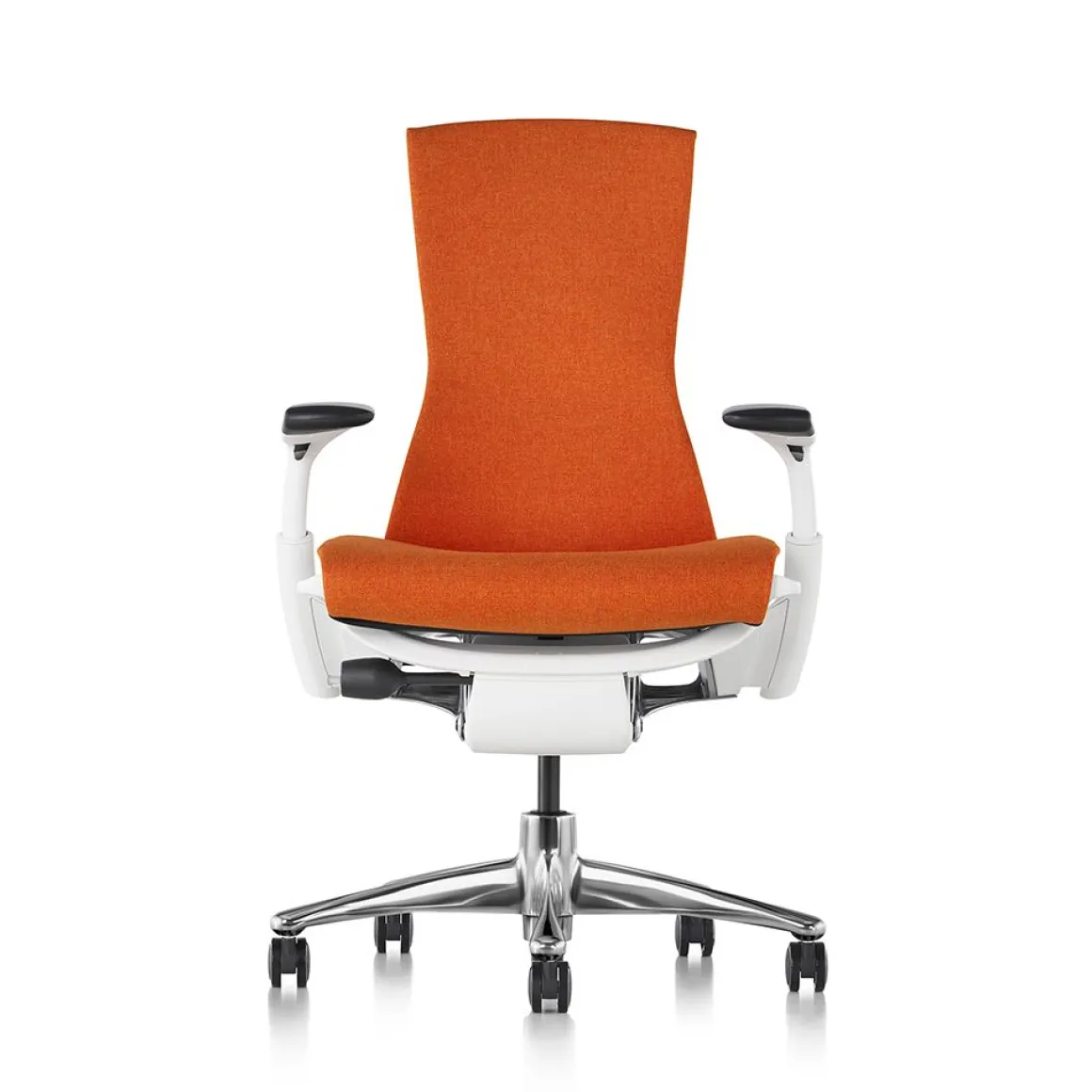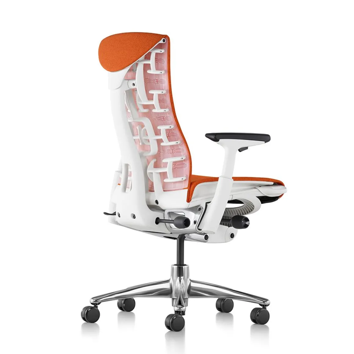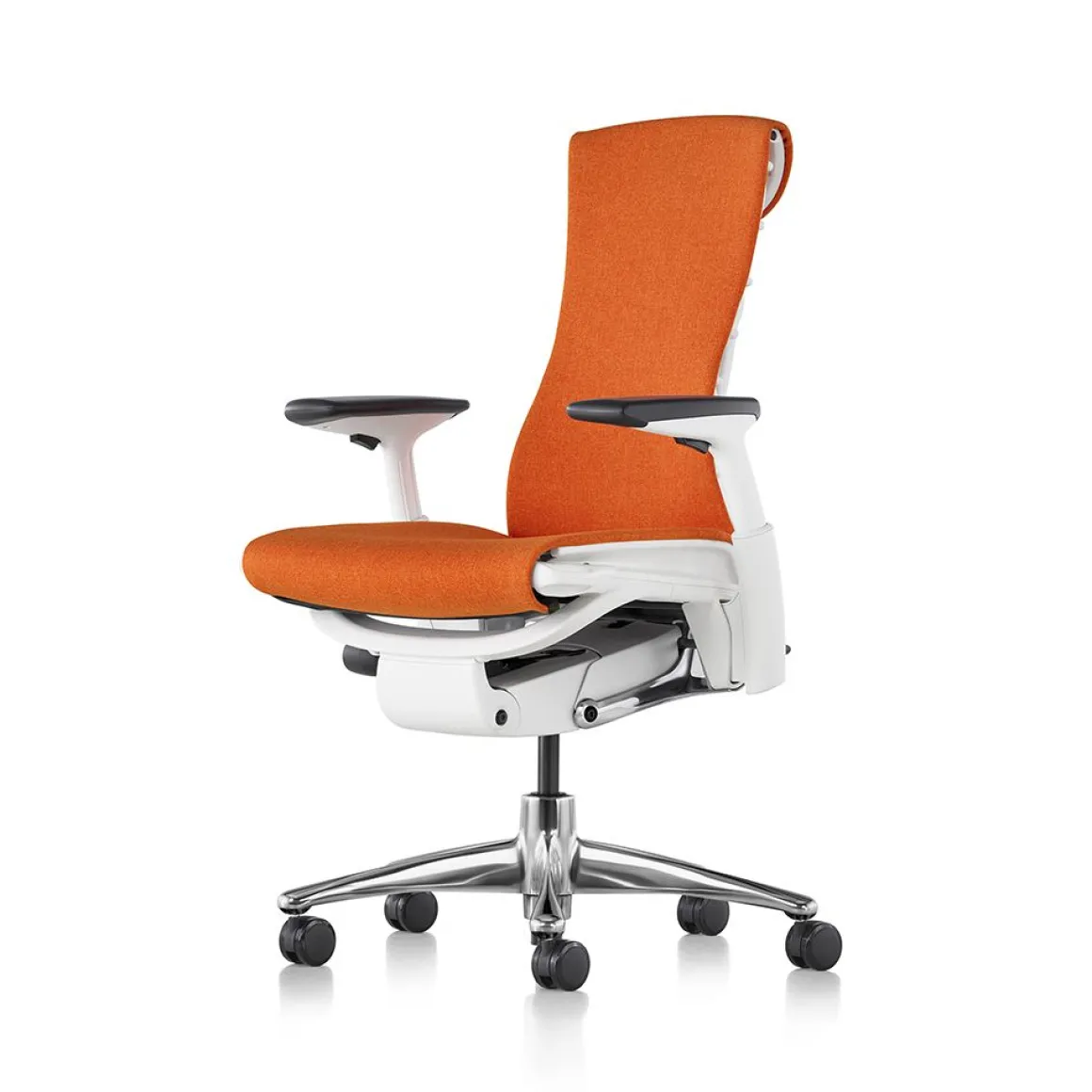 Le siège Embody est né de l’identification d’un problème non résolu : le manque d’harmonie physique entre l’homme et l’ordinateur. Passer trop de temps sur nos divers appareils et ne rien bouger d’autre que nos doigts peut provoquer un état de fatigue et de raideur car le corps est fait pour être en mouvement. Avec le siège Embody, les designers Bill Stumpf et Jeff Weber ont souhaité apporter une solution créative à ce problème. Embody adopte une taille unique pour s’adapter à la population active européenne. Il est complet avec son limiteur d’inclinaison, son siège réglable en profondeur et son appui arrière thoracique. Le limiteur d’inclinaison permet 3 étapes d’inclinaison pendant que le support thoracique Backfit fournit un appui total à l’arrière, aux lombaires au thorax et à toute la région de la colonne vertébrale. Une partie flexible au sommet du dossier appelé le Kicker permet une libre circulation en arrière, toute inclinaison en position vérouillée pour fournir encore plus de confort. Les accoudoirs bougent indépendamment de haut en bas, ainsi que vers l’intérieur et vers l’extérieur entre 165 et 292 mm pour la hauteur et 304 et 503 mm pour la largeur. Embody a été testé pour les utilisateurs jusqu’à 136 kg et est livré avec la garantie standard de 12 abs Herman Miller.