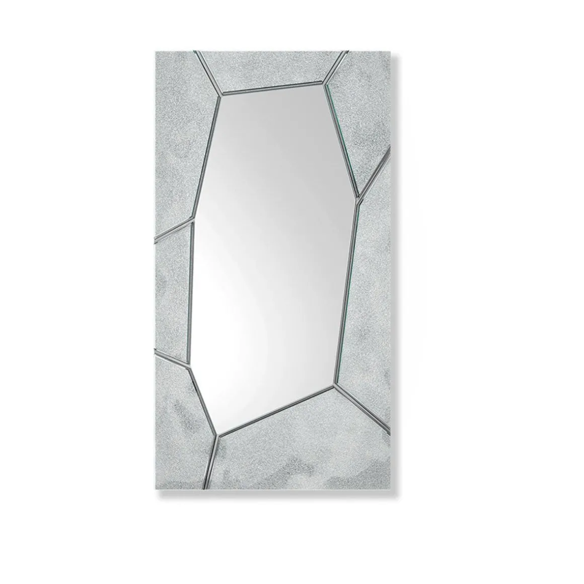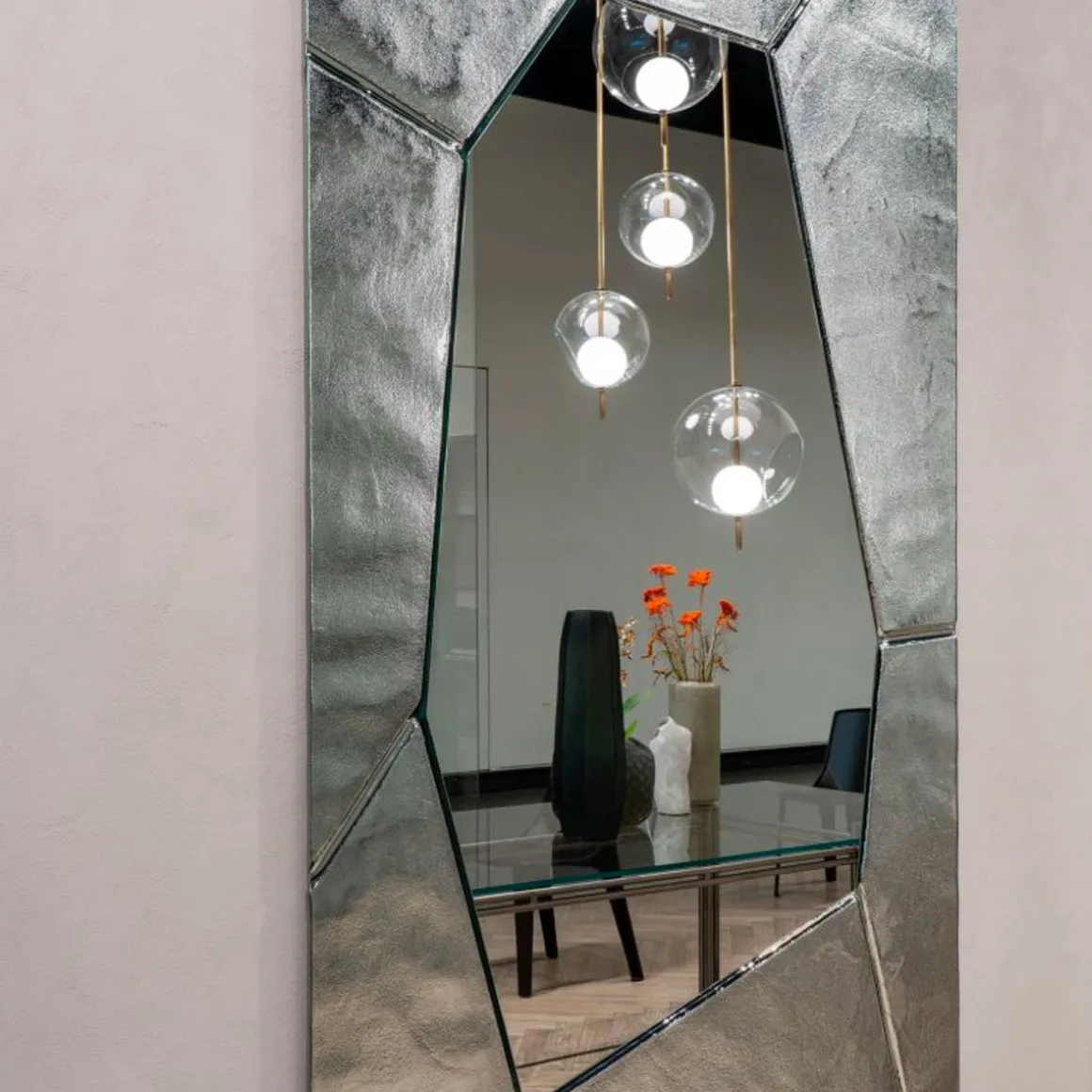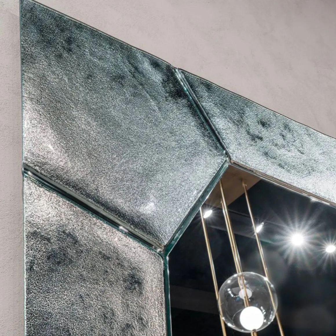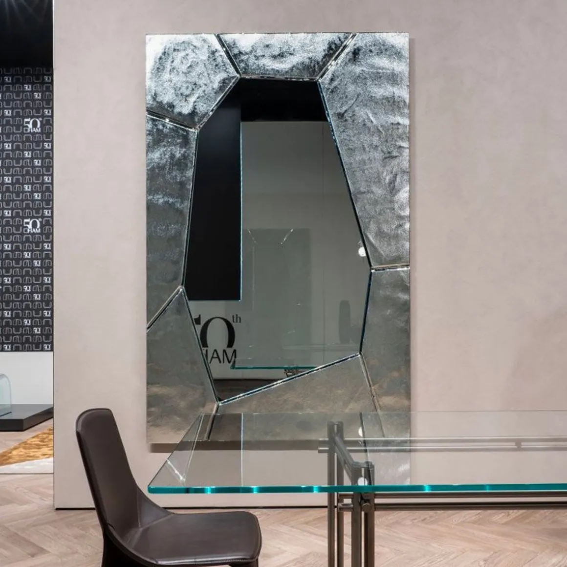 Silica de Fiam par Arik Levy. Miroir appuyant au sol ou accrochable avec cadre en verre en fusion argenté dessous de 6mm, texturé et décoré à la main. Miroir plat de 5mm. Cadre arrière en métal verni. Possibilité d’accrochage en vertical ou en horizontal.