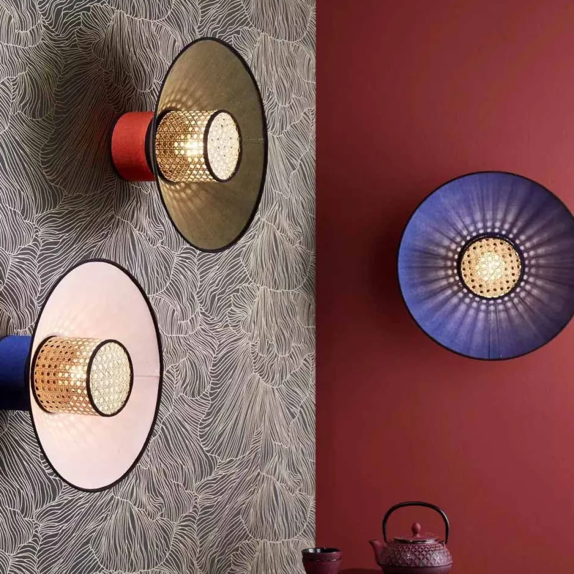 L’applique Singapour de Market Set est un empilement de 3 abat-jours en lin lavé et cannage. Le luminaire est équipé d’un cordon textile et d’un pavillon en métal adaptable DCL.