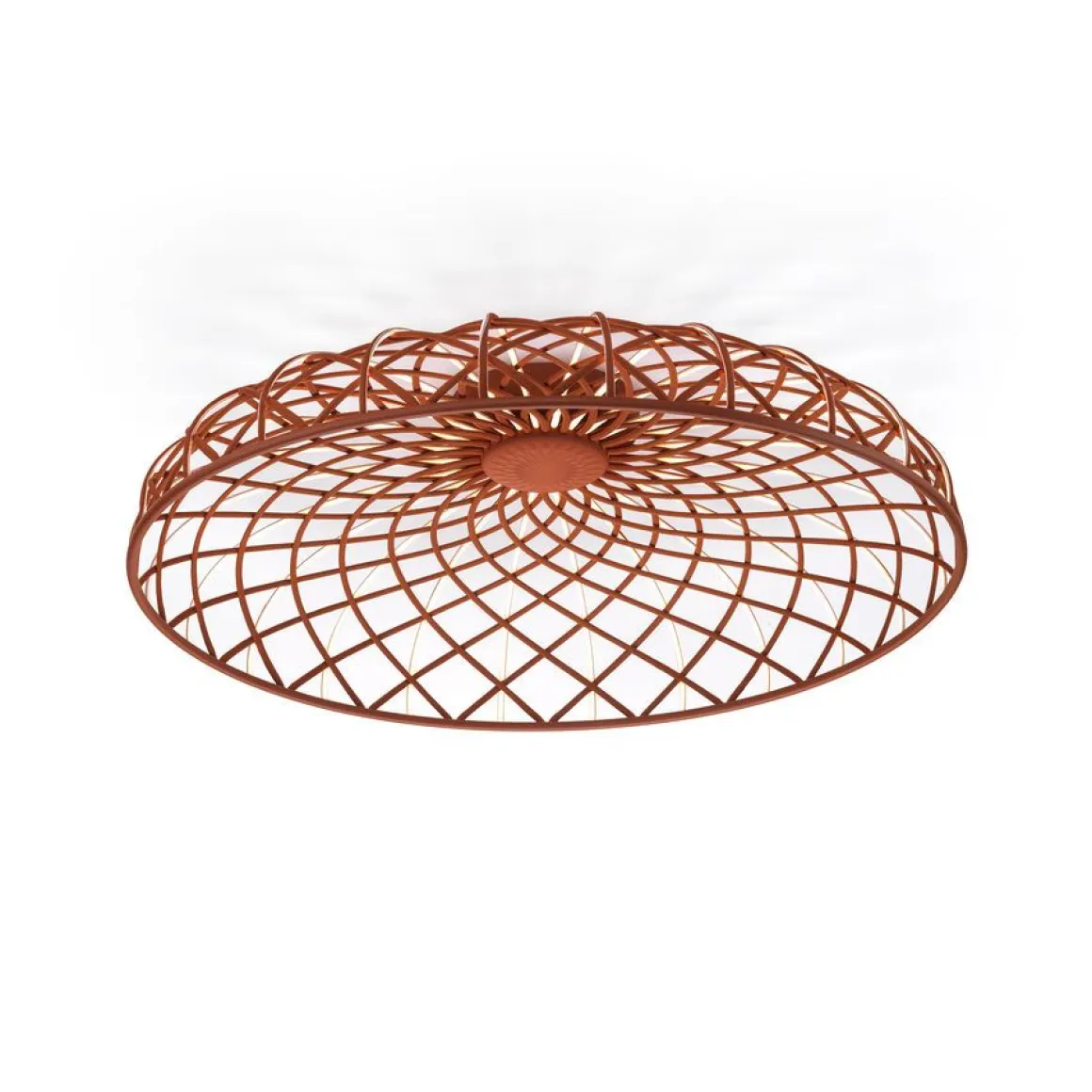Plafonnier Skynest à éclairage diffus. Le dôme est une combinaison d’éléments lumineux et sombres disposés en réseau et formé de structures centrales recouvertes d’une fine maille tubulaire colorée entrelacée en tissu recyclé et recyclable produit à partir de polyester. Chaque élément lumineux est alimenté par des micro-connecteurs spéciaux situés au sommet du dôme et est recouvert d’un maillage bicolore, tandis que le côté faisant face à l’intérieur du dôme est toujours blanc afin de permettre une émission lumineuse optimale du Module LED. L’appareil est équipé d’un système d’équilibrage intégré au sommet du dôme qui permet d’ajuster son équilibre, le rendant parfaitement stable. Le bas du dôme est complété par un anneau en aluminium qui maintient toute la structure du réseau des dômes en place grâce à un simple système d’encliquetage. Le produit est assemblé sans aucune colle, il peut donc être entièrement séparé pour être recyclé à l’avenir et en cas de réparation ou de remplacement. Finitions de lampe disponibles : Bleu Tourmaline, Amande, Anthracite ou Rouge Brique. Équipé d’une électronique intégrée qui permet l’utilisation de différents systèmes de gradation : 0-10V / 1-10V / DALI / PUSH. »