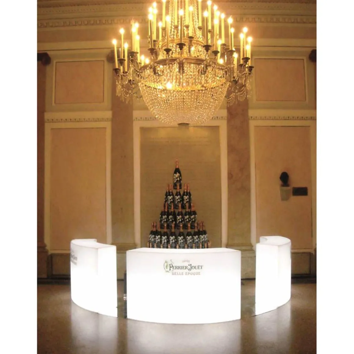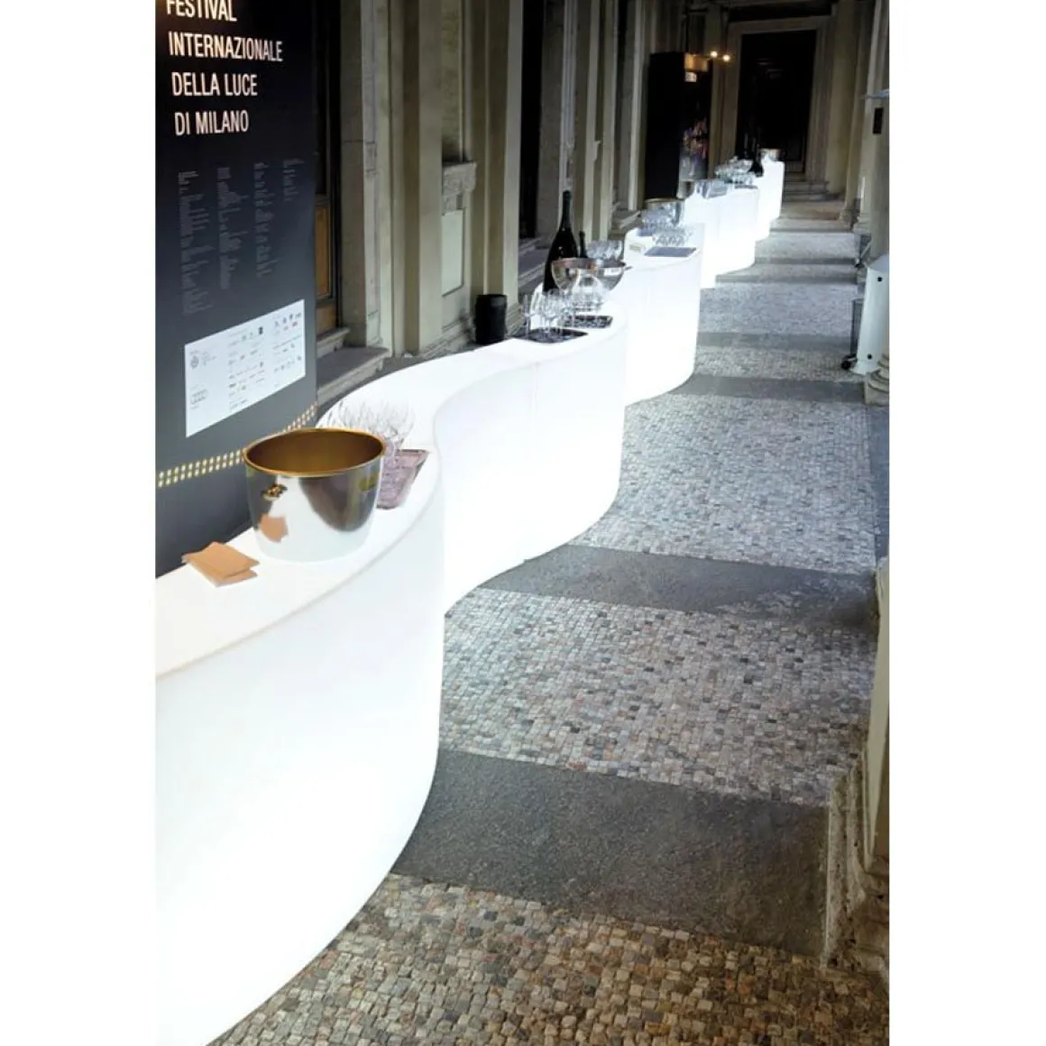 Snack, de Slide, est un bar modulaire et lumineux, tout en courbes, réalisé en polyéthylène blanc. Ce bar lumineux suit la philosophie SLIDE, de combiner parfaitement la fonction avec la forme. Il dessine les intérieurs et se prête parfaitement aux espaces en plein air allant des jardins privatifs aux locaux tendance. Des volumes de lumière et de matière, un heureux mariage esthétique et fonctionnel. Snack bar n’est qu’une table utile, mais aussi un élément de déco avec un fort impact visuel et esthétique.