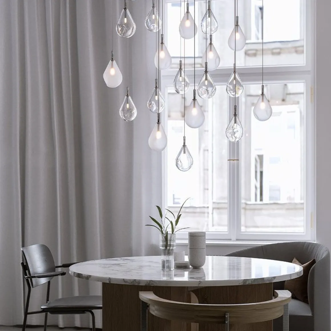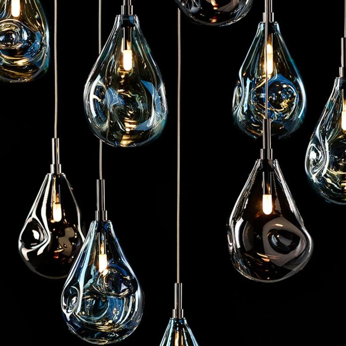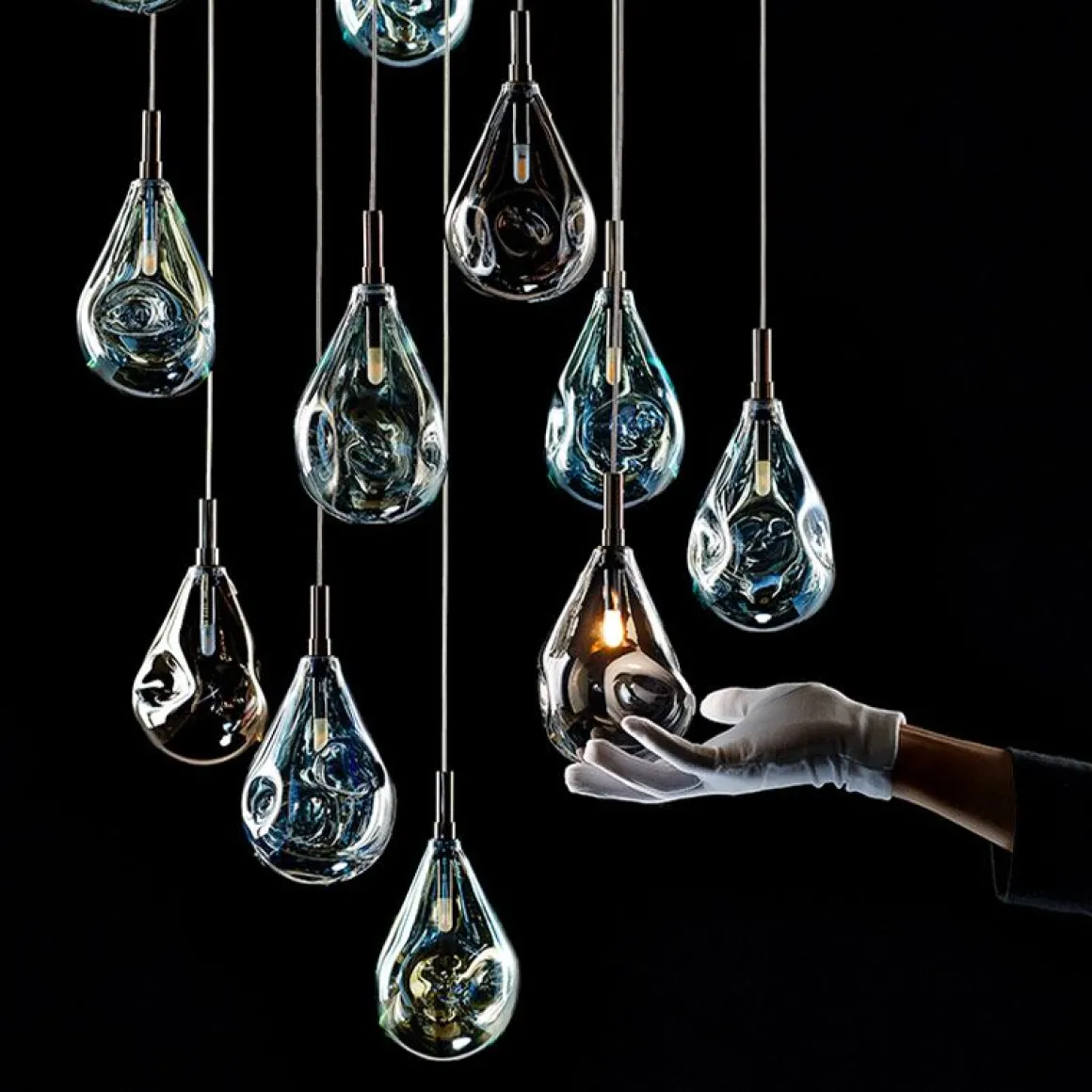 Des couleurs variées, de la transparence et des formes en constante évolution – les caractéristiques des bulles de savon – ont inspiré cette collection BOMMA. Lorsqu’il est allumé, l’éclat métallique de sa surface se transforme en irisé et translucide, exposant son caractère cristallin. Toute la collection est réalisée selon la technique du soufflage à la main sans forme. La gouttelette de verre en fusion apparemment parfaite reçoit une forme unique ainsi qu’un spectre de couleurs unique. La collection Soap Mini offre un espace illimité pour votre créativité, avec la possibilité de créer autant de grands groupes de gouttes de cristal que vous le souhaitez, des plus petites compositions aux vastes constellations de lumière.