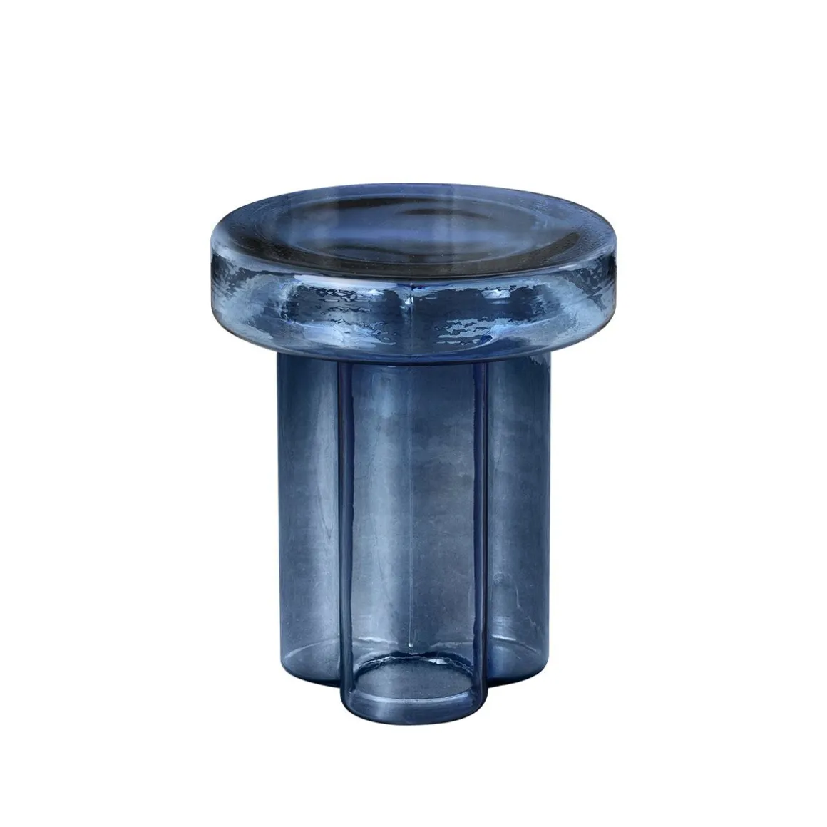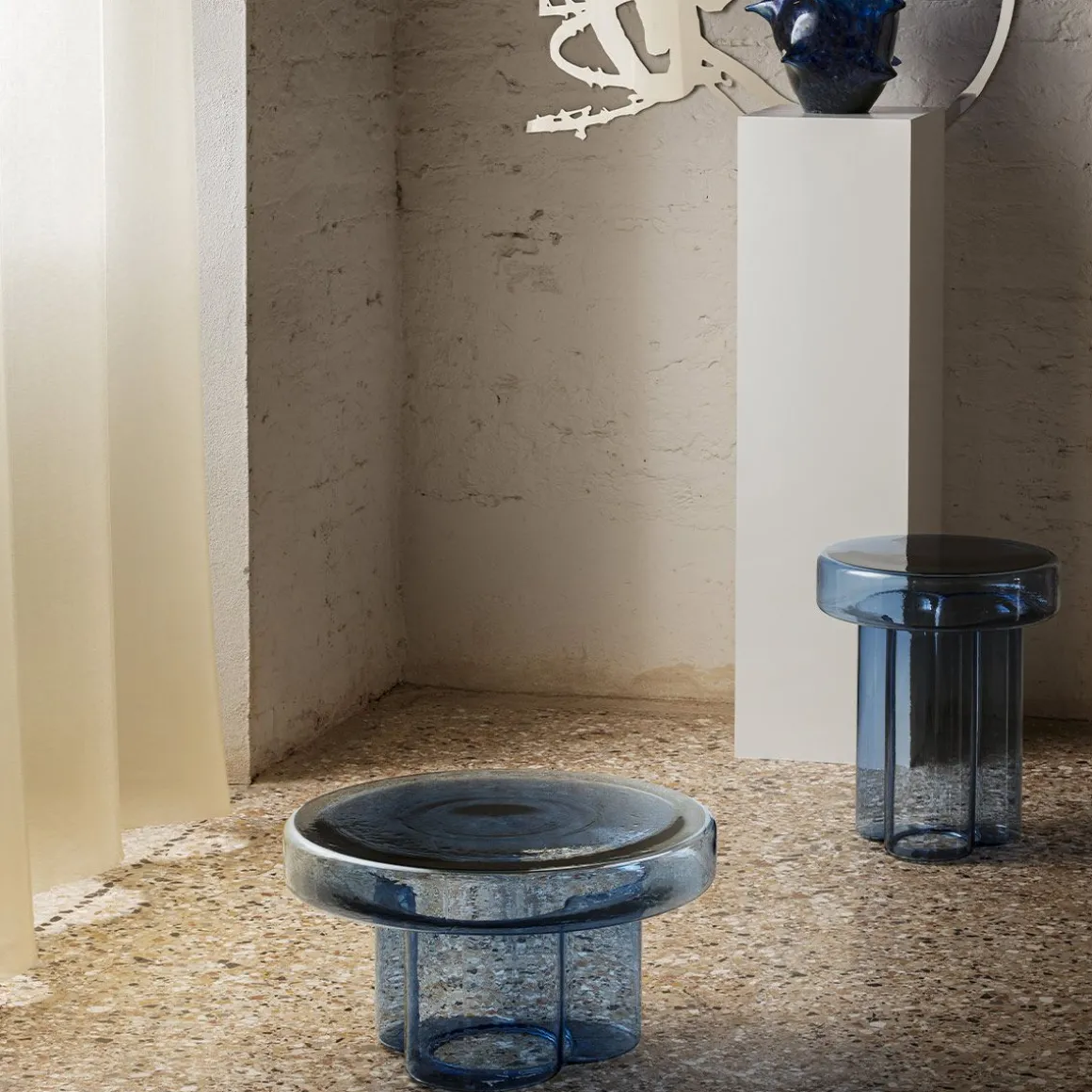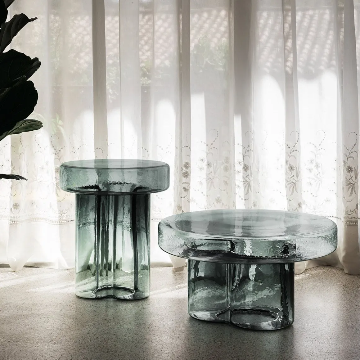 Soda de Miniforms par Yiannis Ghikas. Soda naît la tête en bas, d’un souffle. Elle pèse 20 kilos et est soufflée, démoulée et façonnée par trois maîtres-verriers. Le résultat est un volume unique de verre où trois grandes pétales dessinent le corps central. Dans Soda, la matière vibre : l’enveloppe dure et martelée du verre en fragmente la transparence en lui donnant une esthétique primitive. C’est la valeur artistique accordée au produit industriel. Soda est une table basse pas un tabouret. Ne vous asseyez pas dessus ! Soda s’intègre parfaitement à la maison comme à tout espace public.
