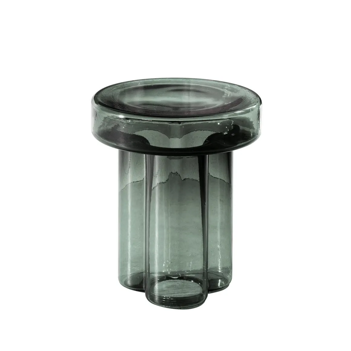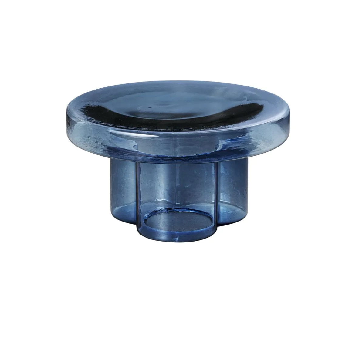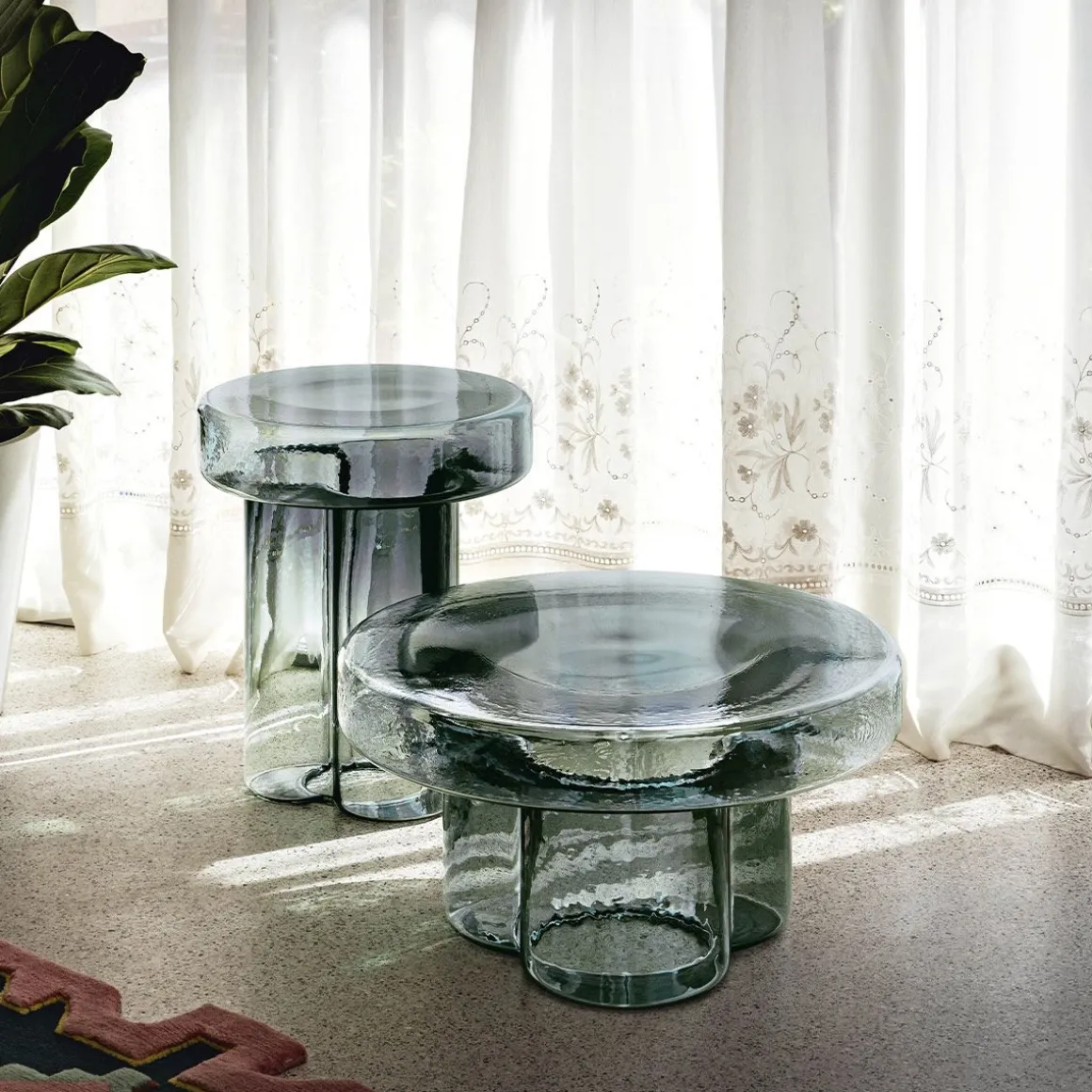 Soda de Miniforms par Yiannis Ghikas. Soda naît la tête en bas, d’un souffle. Elle pèse 20 kilos et est soufflée, démoulée et façonnée par trois maîtres-verriers. Le résultat est un volume unique de verre où trois grandes pétales dessinent le corps central. Dans Soda, la matière vibre : l’enveloppe dure et martelée du verre en fragmente la transparence en lui donnant une esthétique primitive. C’est la valeur artistique accordée au produit industriel. Soda est une table basse pas un tabouret. Ne vous asseyez pas dessus ! Soda s’intègre parfaitement à la maison comme à tout espace public.