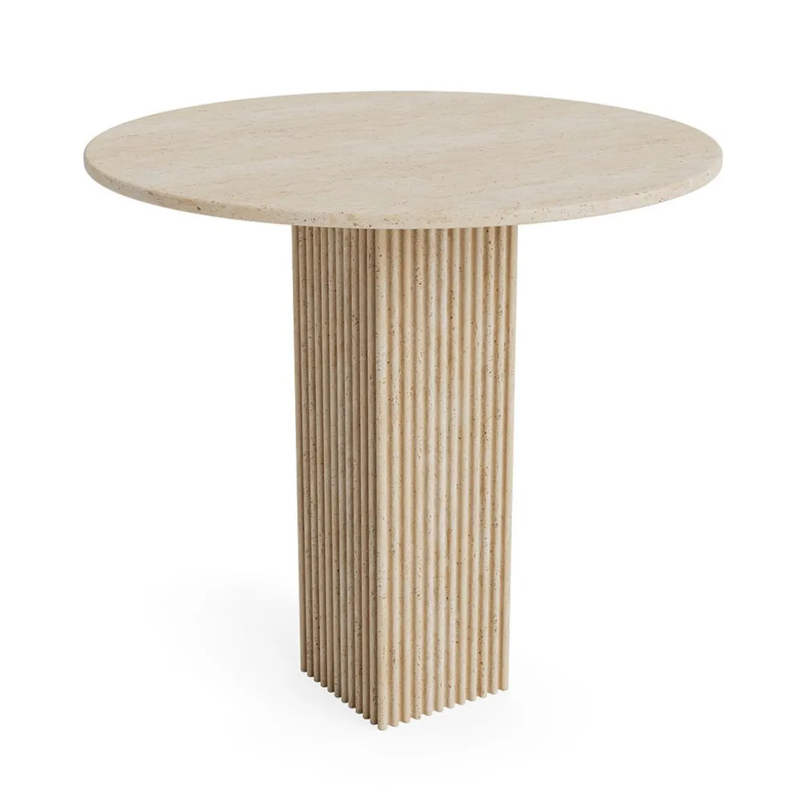 Matériaux : Plateau de table en travertin, pied de table en dalles de travertin avec noyau en pierre artificielle.