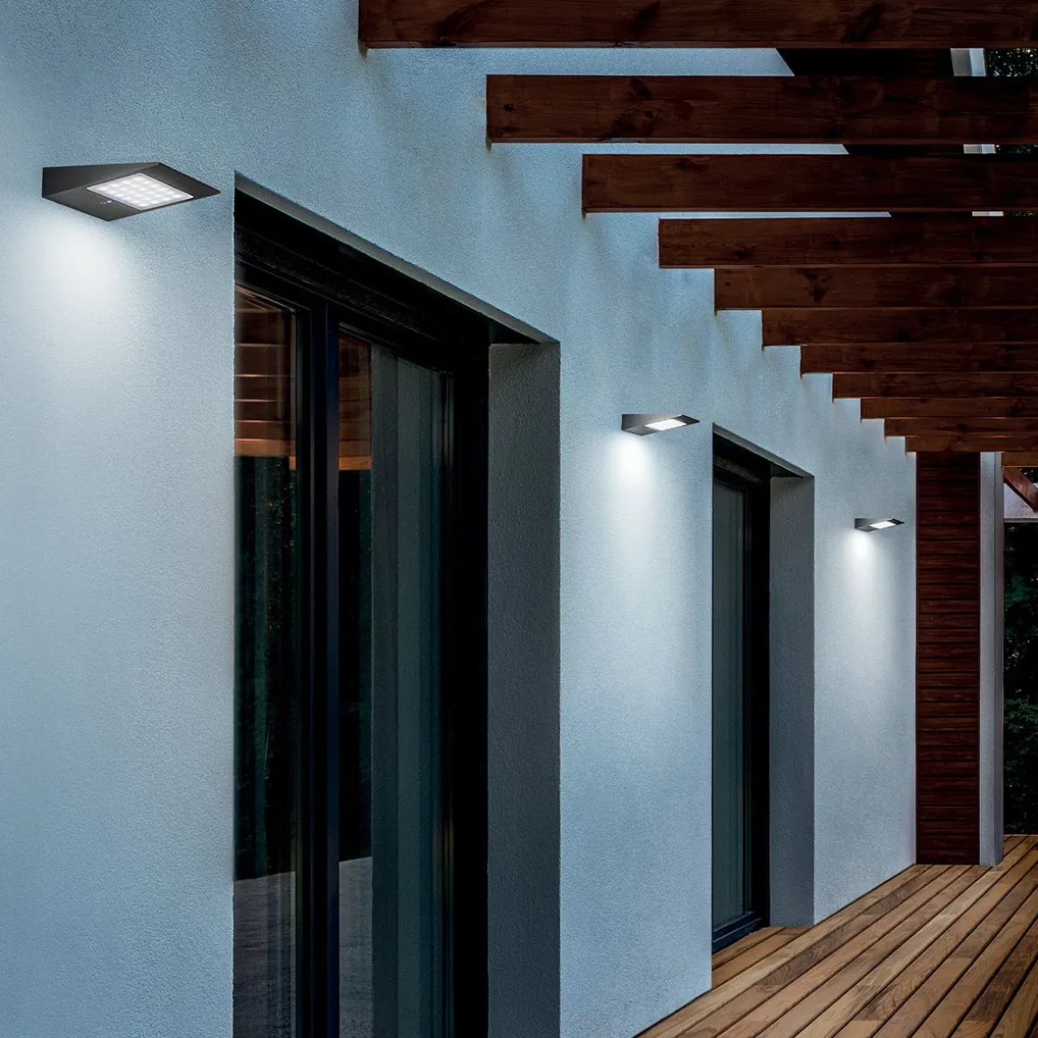 Applique, borne et spot orientable en aluminium moulé sous pression, peint en gris foncé, avec diffuseur en polycarbonate. Conçu pour utilisation en extérieur, les lampes Solaires sont équipées avec un panneau solaire qui charge la batterie (remplaçable) et ont un indice IP élevé (IP54 pour l’applique et la borne ; IP65 pour le spot orientable). Les capteurs de la borne sont pilotés par deux interrupteurs : lorsque le capteur crépusculaire est actif et détecte une température ambiante luminosité inférieure à 150 Lux, la lampe s’allume à 50% de son intensité ; quand le capteur de mouvement est également actif ( ) et détecte un mouvement, la lampe s’allume à pleine puissance, puis réduit son intensité à dix%. L’applique est équipée d’un crépusculaire capteur qui active la lampe en « énergie » mode économie » (30 lm, 0,33 W) ; c’est aussi équipé d’un capteur de mouvement qui active le mode pleine puissance lorsque un mouvement est détecté (la lumière revient à mode économie d’énergie après 60″). Le mouvement Le capteur peut être désactivé, auquel cas le la lampe émet toujours 50% du flux lumineux.
