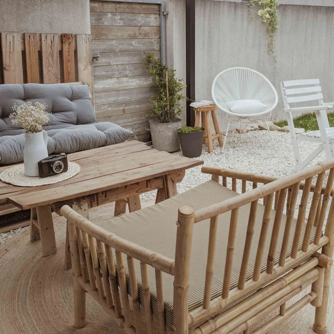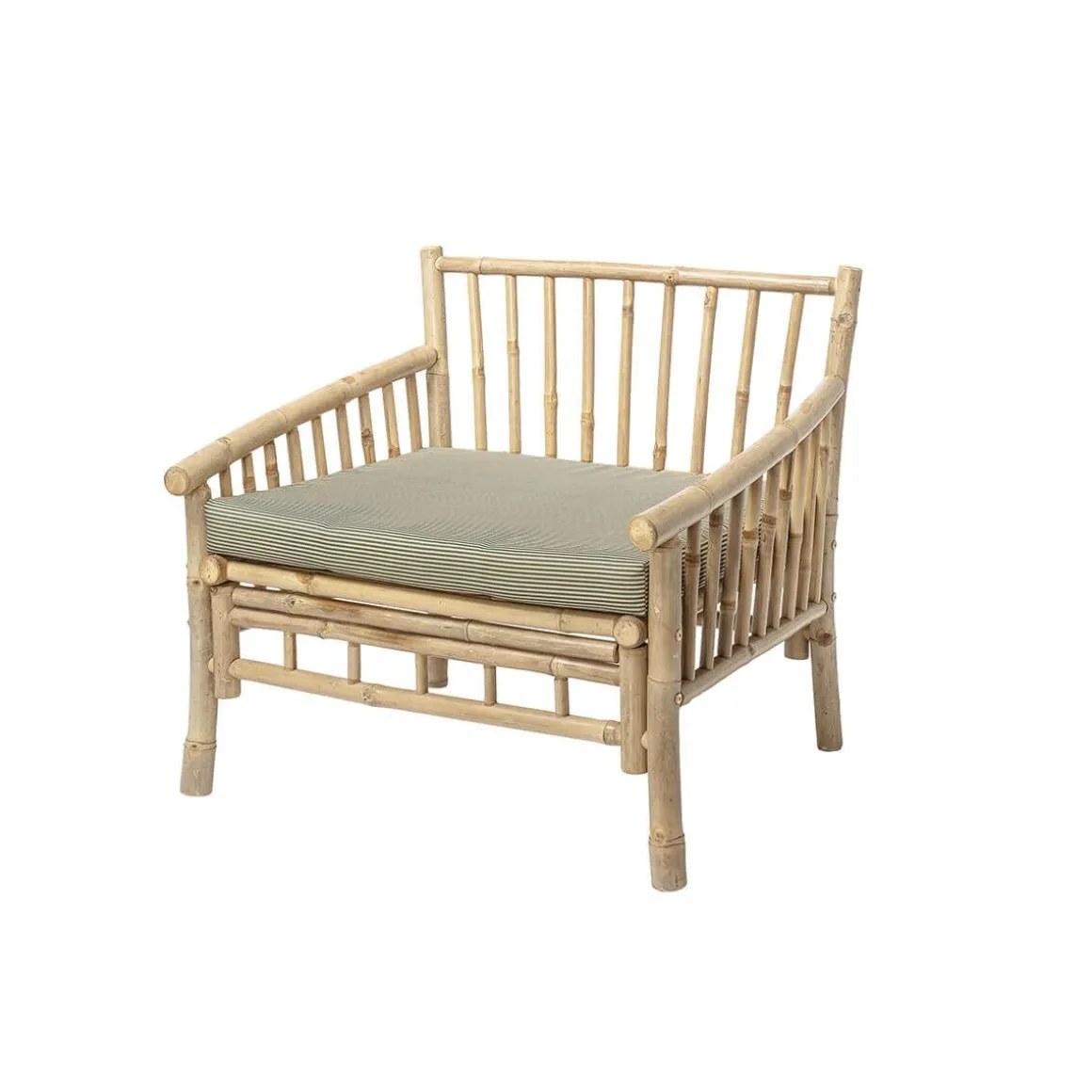 Matériaux : tronçons de bambou et assise en lattes de bambou, tissu et rembourrage en polyester