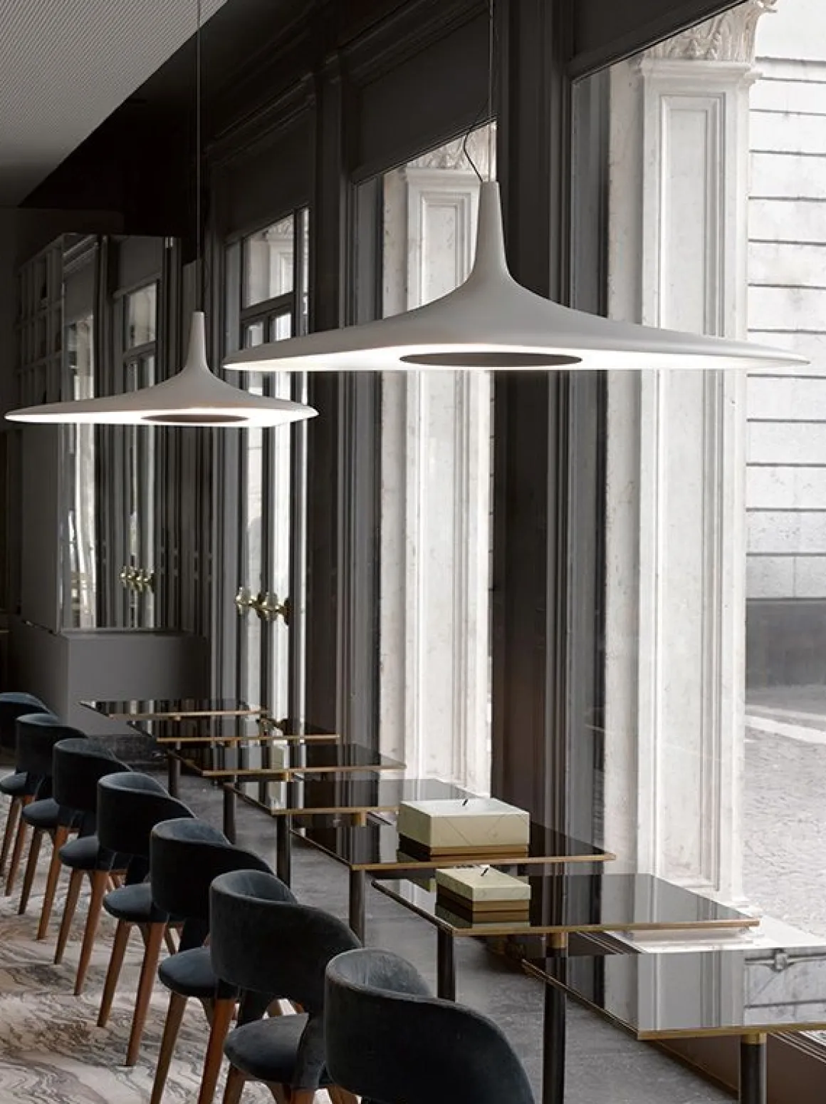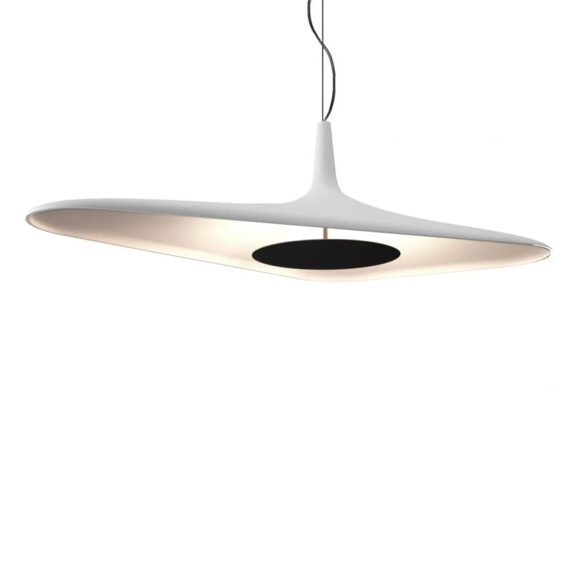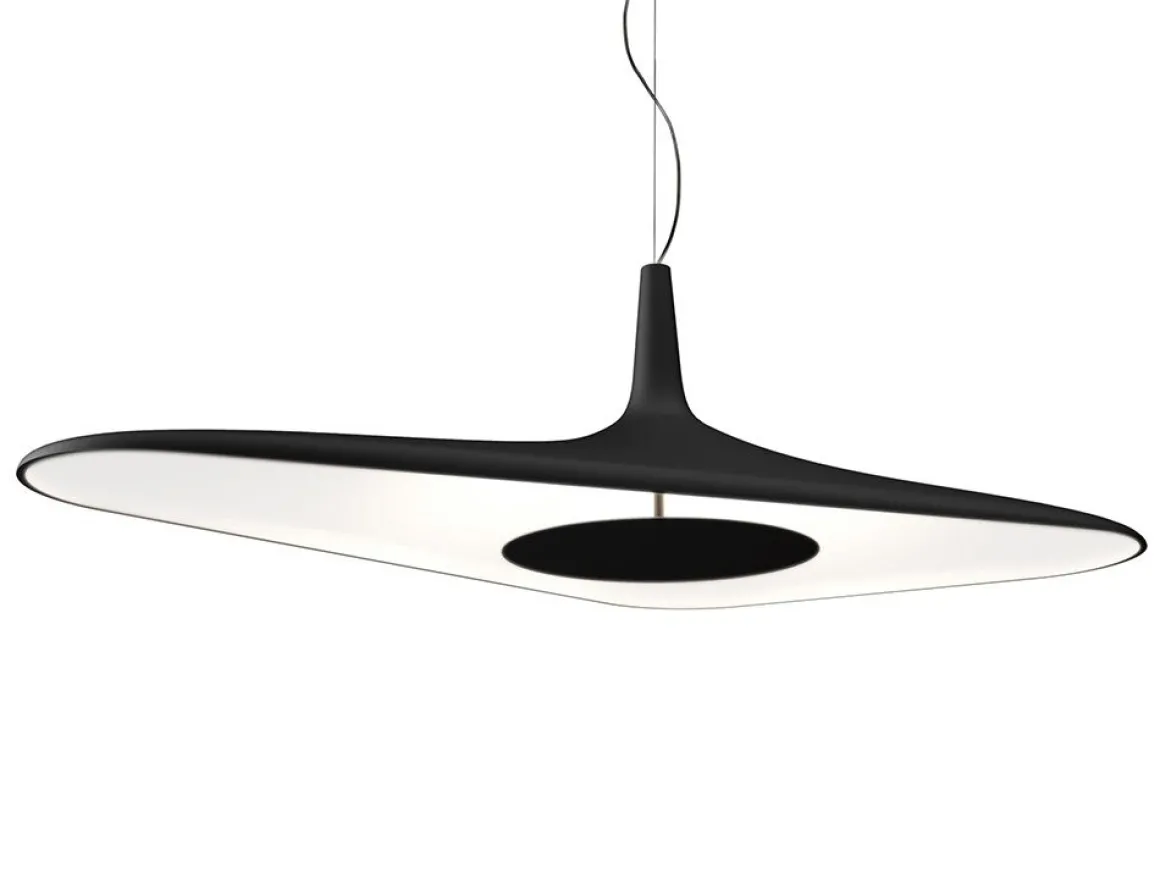 Technologique et futuriste, Soleil Noir créé par Odile Decq est une suspension et un plafonnier avec une forme organique en mousse de polyuréthane moulée. La source de lumière LED est caché à l’intérieur d’un disque qui diffuse un éclairage indirect homogène. Soutenu par un câble asymétrique unique, il maintient son équilibre grâce à l’épaisseur du corps, fonctionnant comme un élément d’éclairage mince, aérienne qui transporte la luminosité avec discrétion et élégance. Il est équipé d’ un système optique d’avant-garde pour garantir l’écoulement uniforme de la lumière sur le diffuseur. Un objet qui défie les lois de la physique, grâce à la technologie qui permet une conception en bordure de l’impossible.