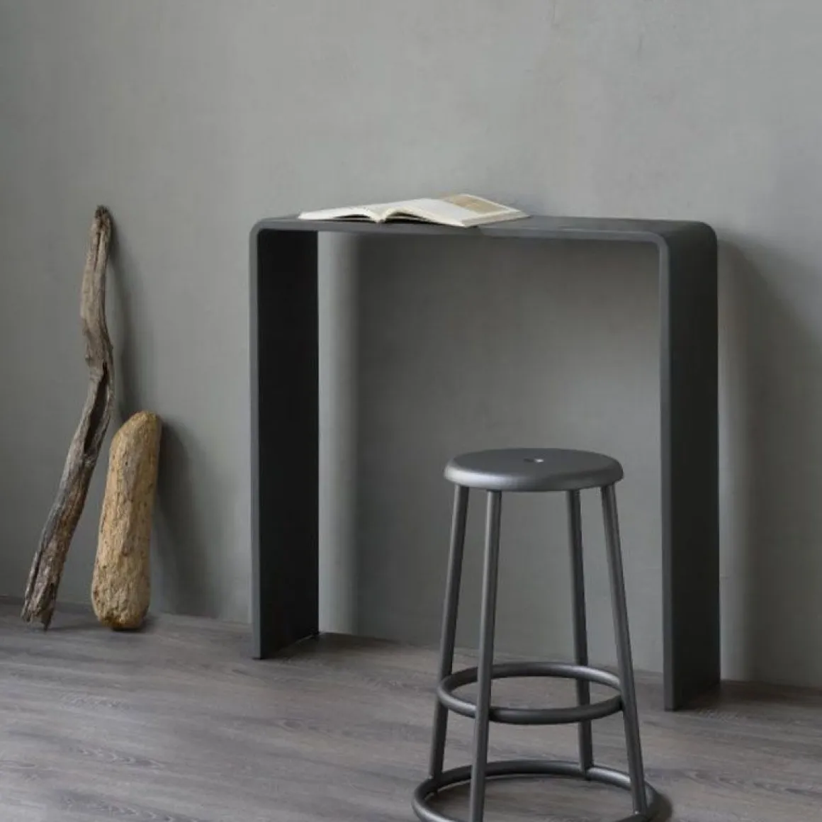 Haute console, structure avec double paroi, épaisseur 23mm, avec angles arrondis en tôle d’acier naturelle découpée et courbée.