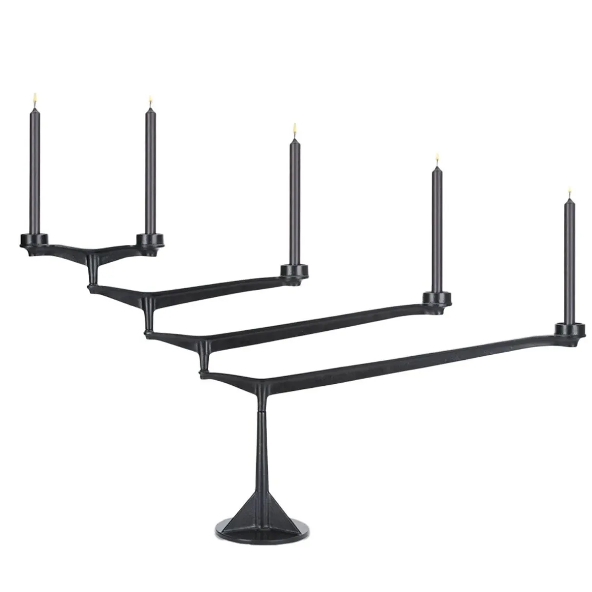 Spin de Tom Dixon. Le candélabre Spin est une pièce d’ingénierie dynamique. Conçu pour servir de pièce maîtresse de table cinétique, il permet de créer une infinité de compositions pour présenter des bougies. Pouvant accueillir avec la même élégance bougies chauffe-plat et bougies coniques, ce candélabre en fonte s’inspire des lourds mécanismes cantilever des grues portuaires et de l’élégance mécanique des mobiles des années 1950.