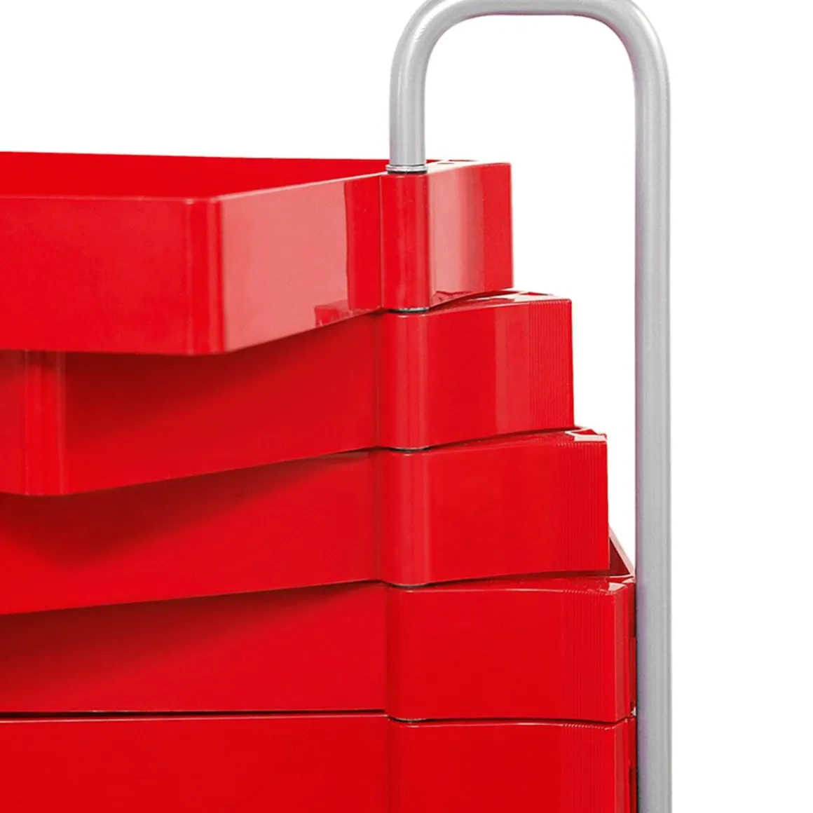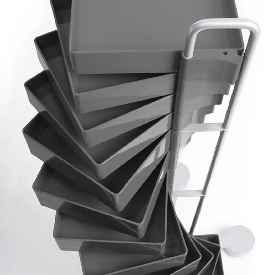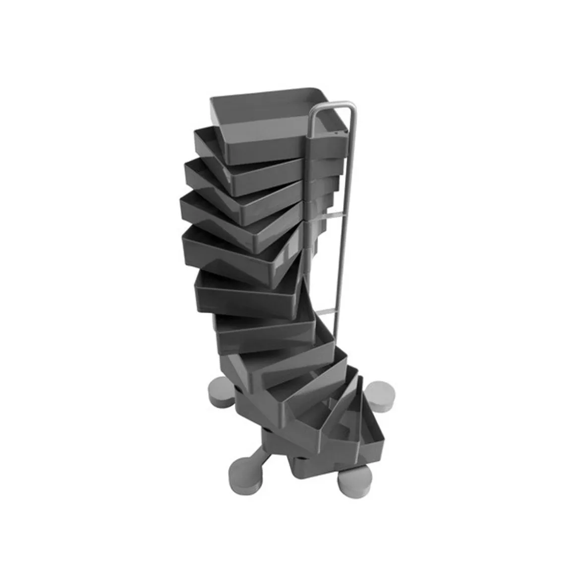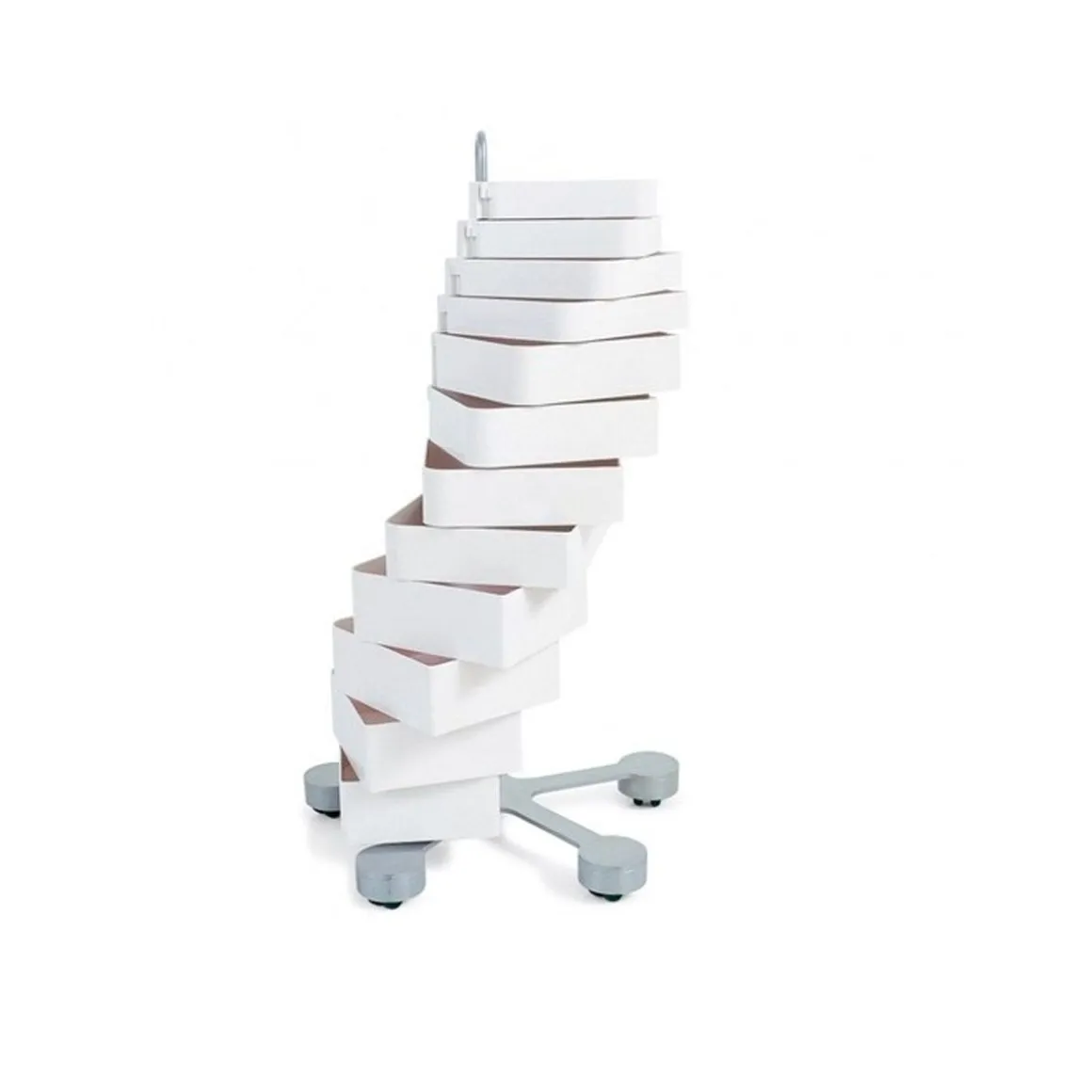 Spinny est un meuble à tiroirs exceptionnellement polyvalent composé d’une série de tiroirs en plastique ABS moulé par injection qui pivotent jusqu’à 180°. La structure est équipée de roulettes pivotantes en polypropylène et comme la base est en acier peint.