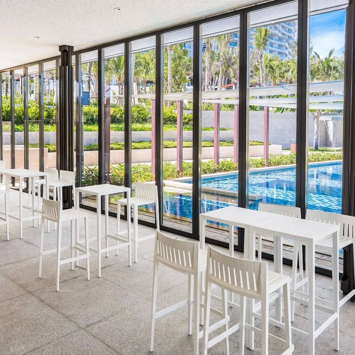 Dans votre restaurant, dans votre cuisine extérieure ou tout simplement au bord de la piscine, vous trouverez l’endroit parfait pour votre table de bar Spritz. Avec son choix de couleurs et ses chaises assorties, vous avez le choix pour vous satisfaire.