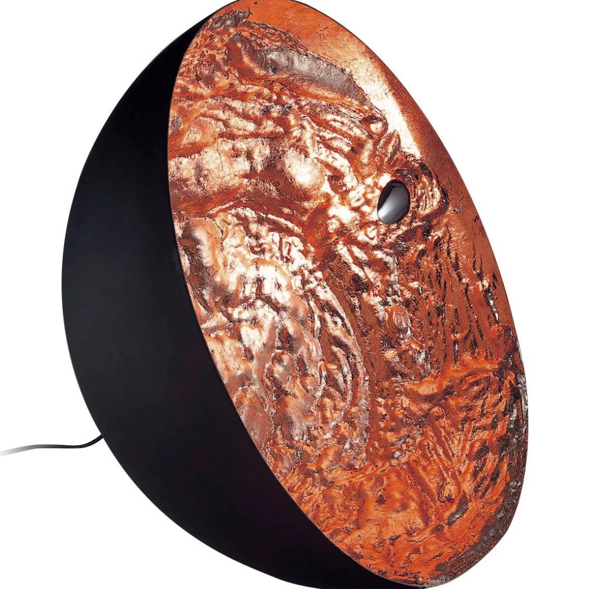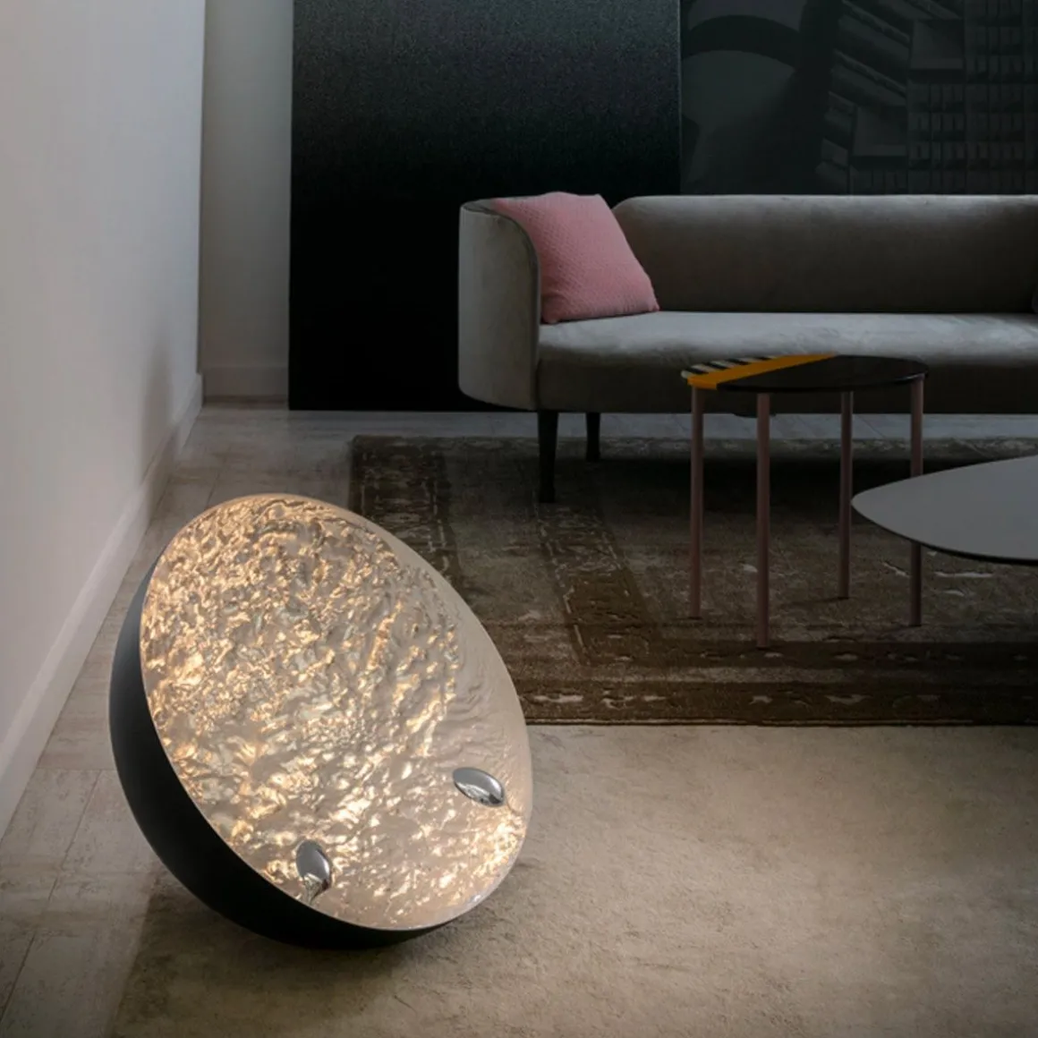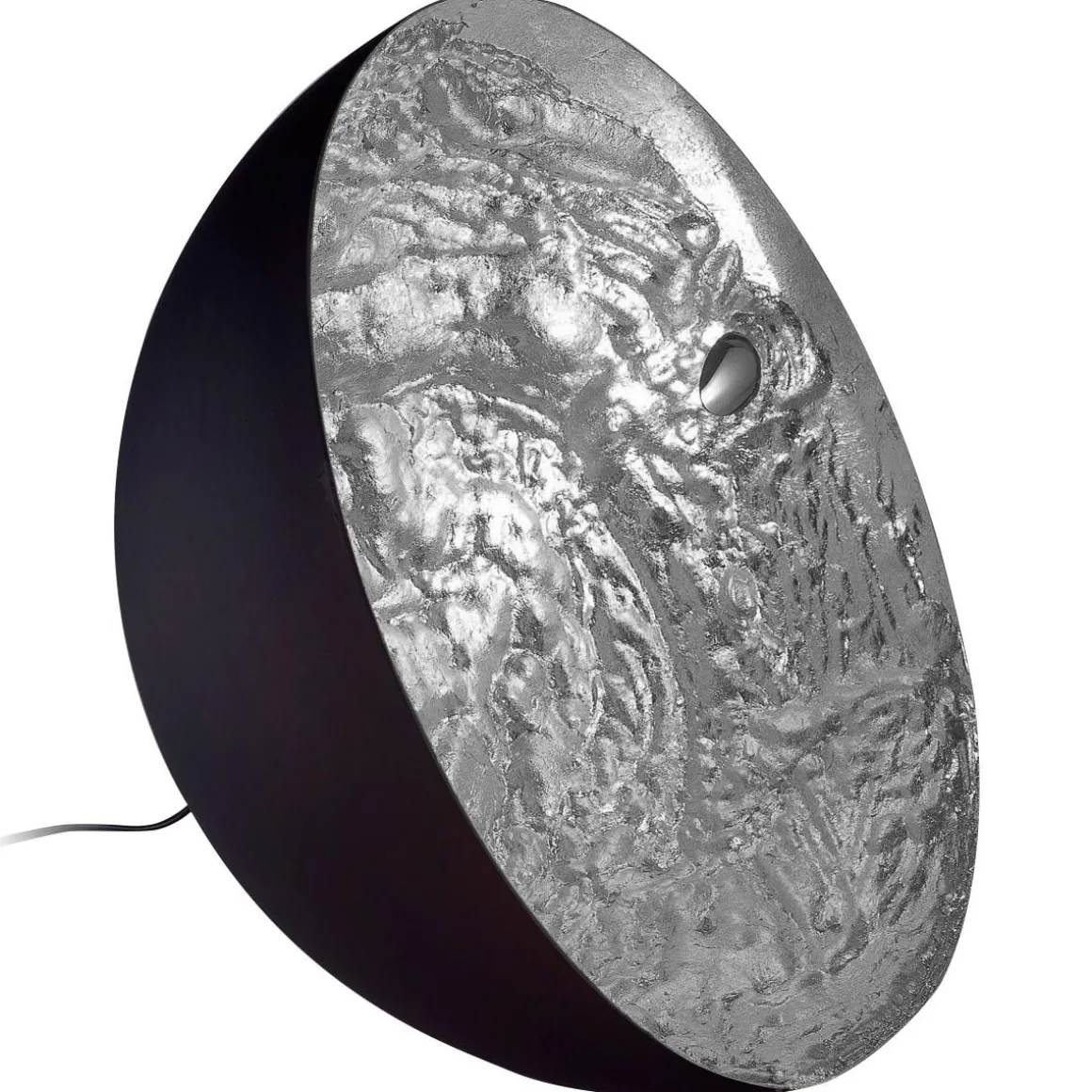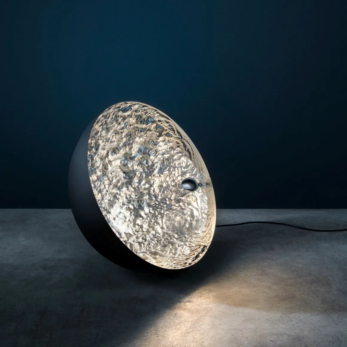 Stchu Moon 1 est une lampe à poser en forme de demi-sphère en aluminium, satiné noir mat à l’extérieur. L’intérieur est composé d’une surface irréguliere à effet de feuille d’argent ou d’or. On apprécie la surface en relief qui surprend tous ceux qui la regardent par une réflexion extraordinaire de la lumière.