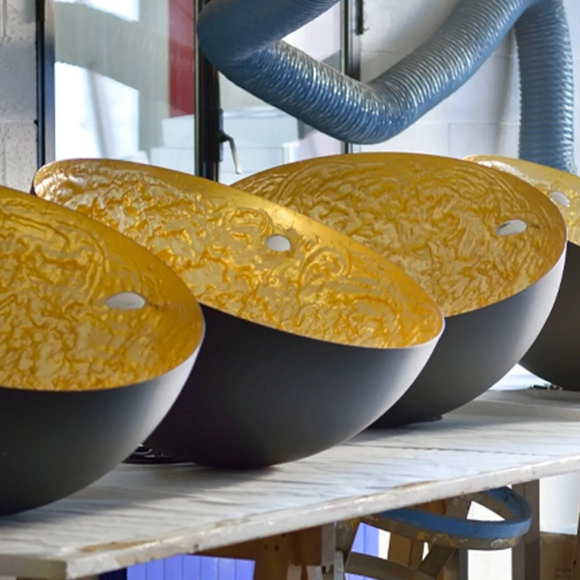 Matériaux : sphére en aluminium ou en fibre de verre en différents diamètres / Surface interne irrégulière doublée de feuilles en argent, or ou cuivre / Extérieur noir mat, porte lampe en acier