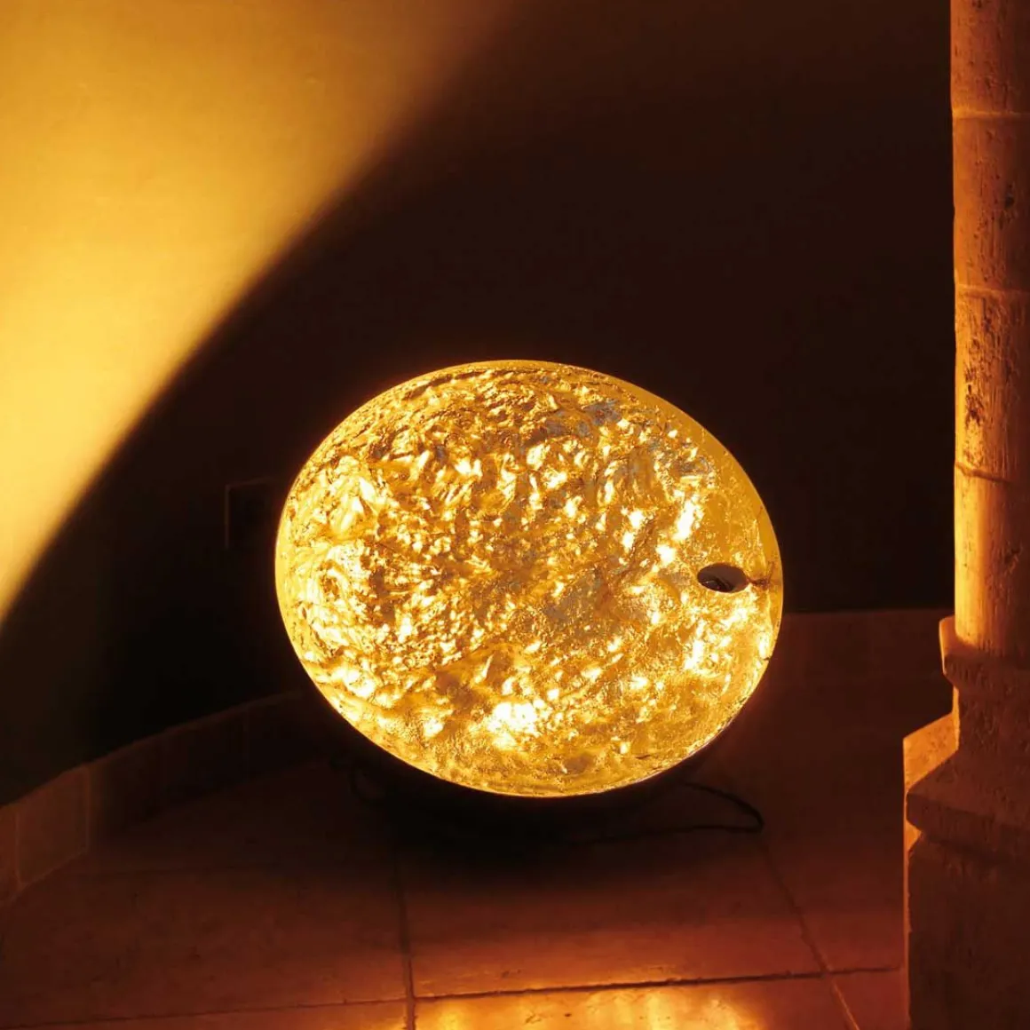 Stchu-Moon sépare la source de lumière de la lampe, ce qui prend sa propre valeur esthétique en conséquence. Ces objets sont tous fabriqués par des artisans spécialisés et sont donc des pièces totalement uniques. La réfraction de la lumière joint des forces avec des surfaces intentionnellement irrégulières qui multiplient la qualité de la lumière et rendent l’objet lui-même tout léger. Les surfaces irrégulières sont bordées de feuilles dorées, argentées et cuivrées.