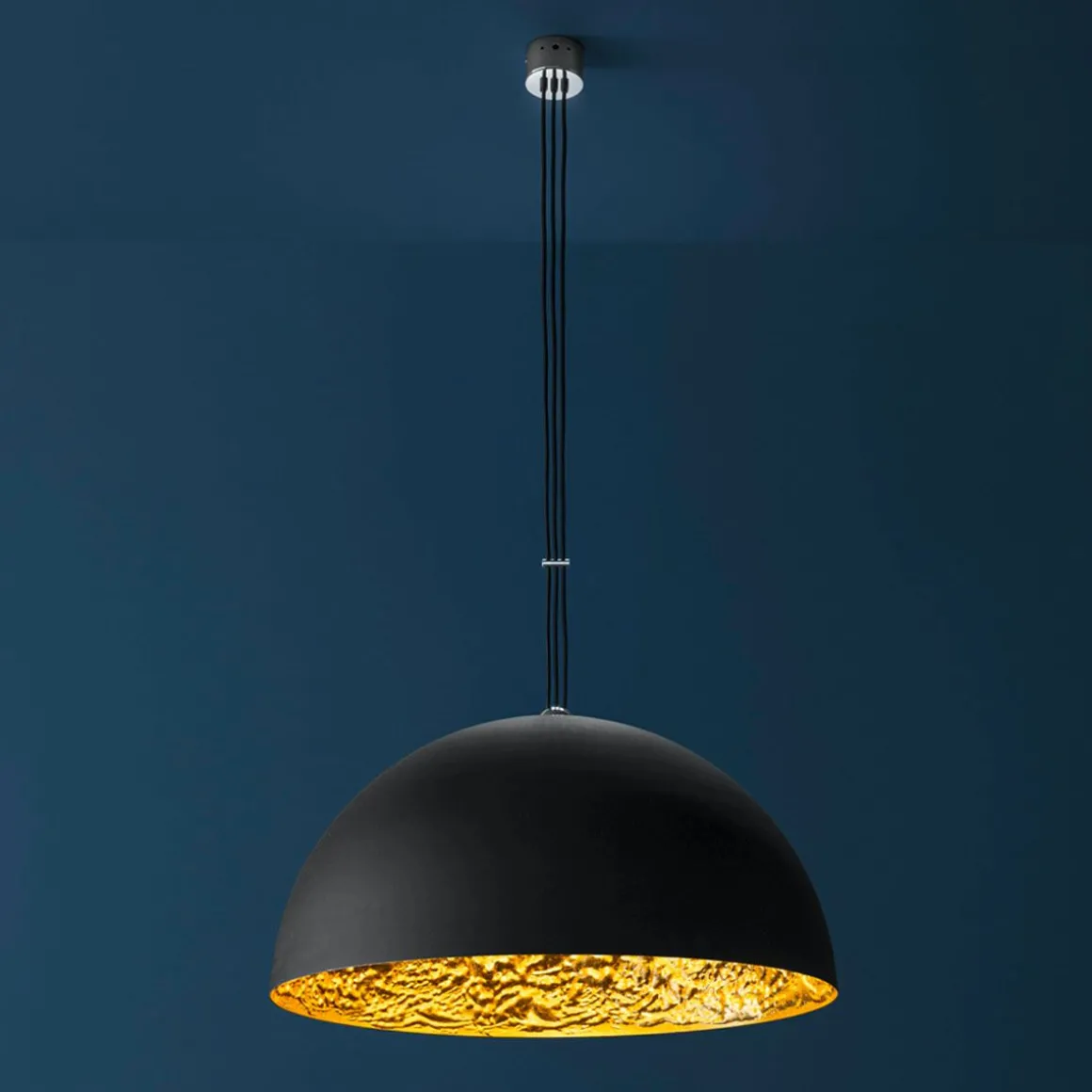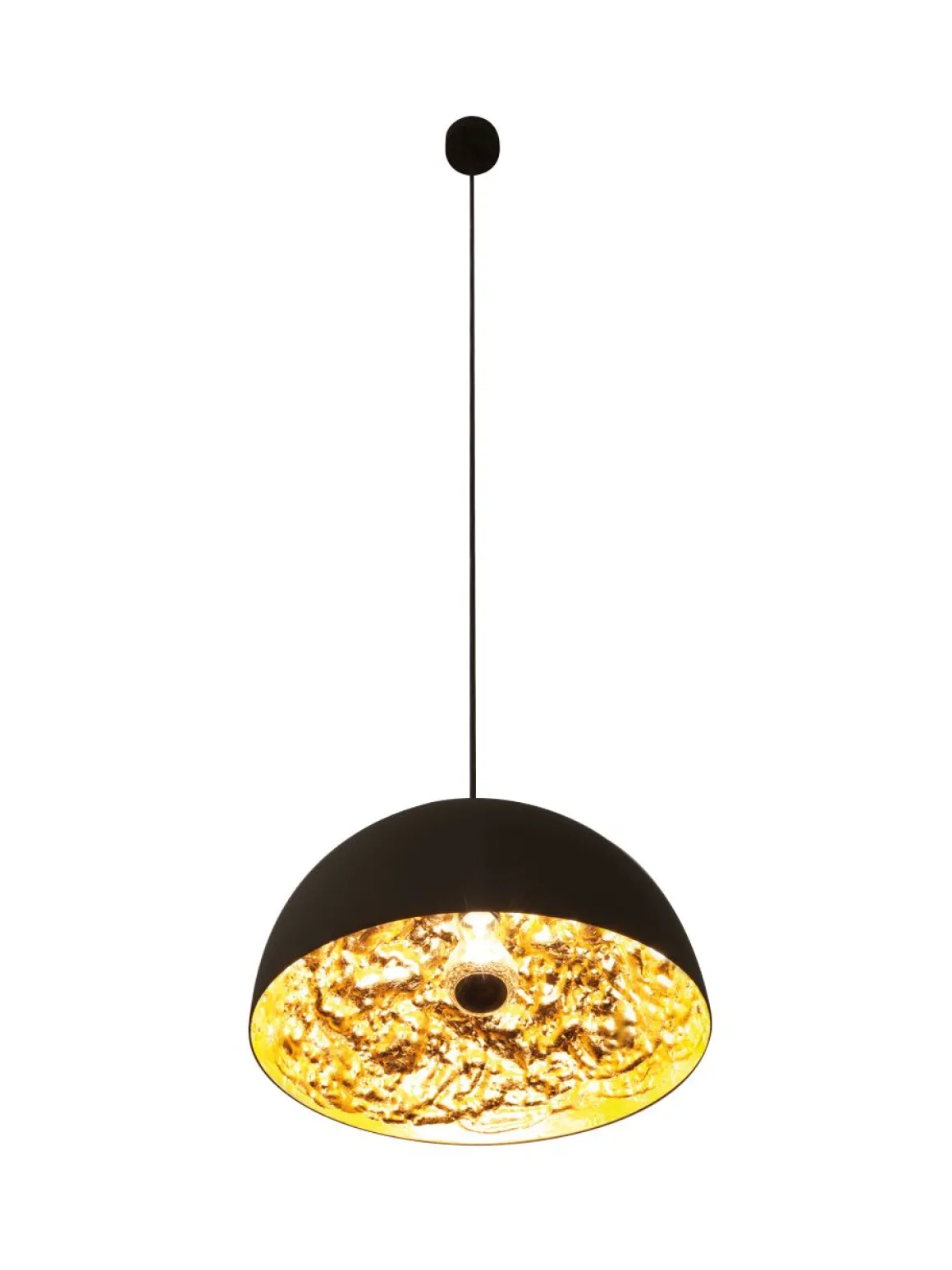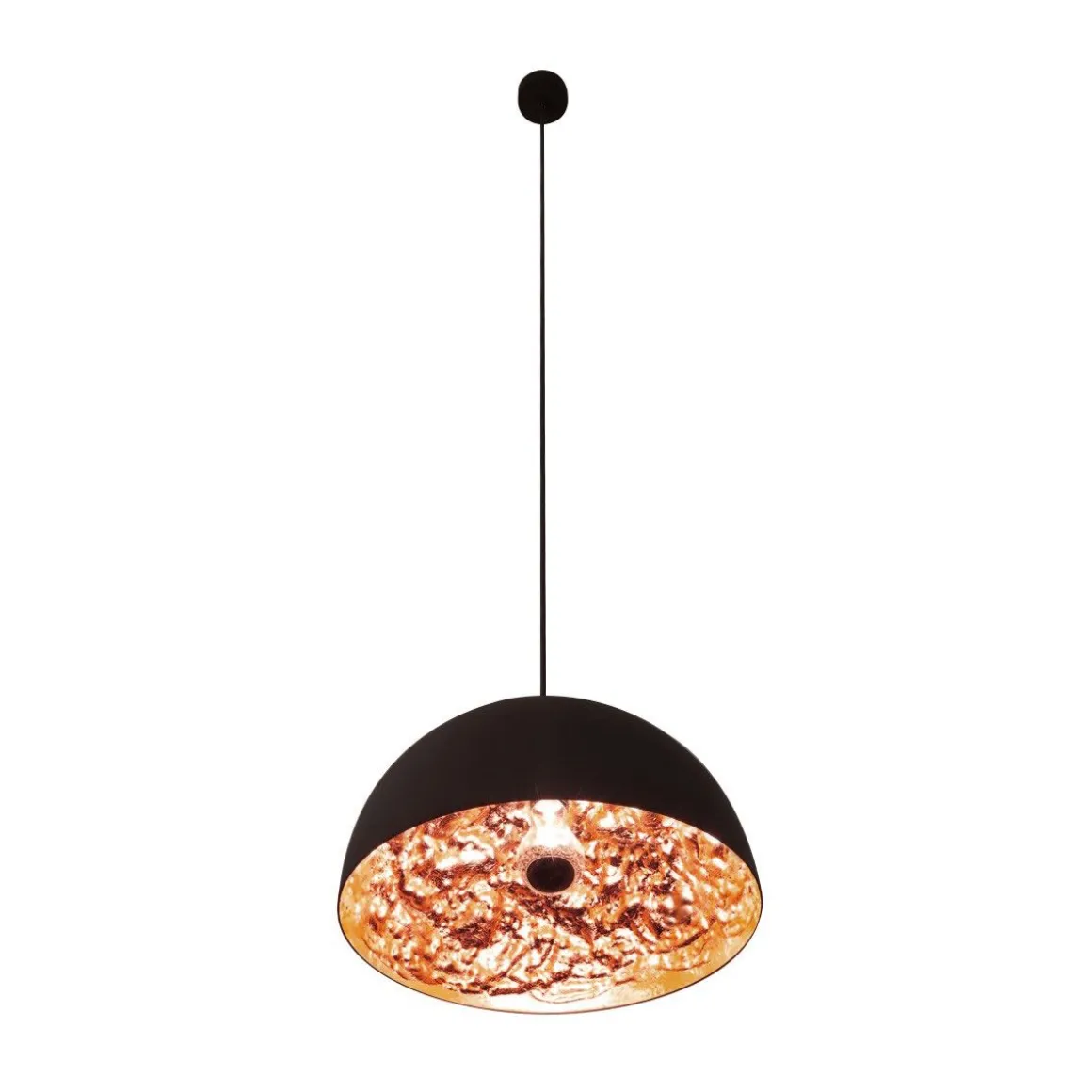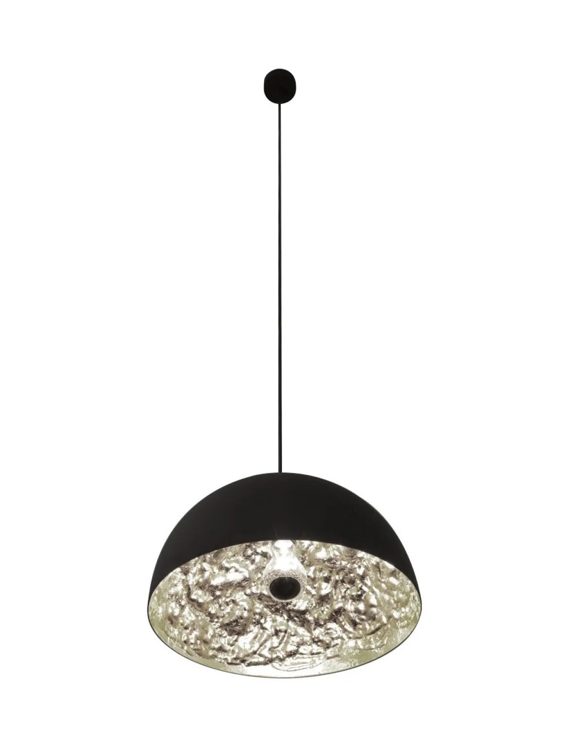 Matériaux : Sphère en aluminum ou en fibre de verre en différents diamètres / Surface interne irrégulière doublée de feuilles en argent, or ou cuivre / Extérieur noir mat, porte lampe en acier.