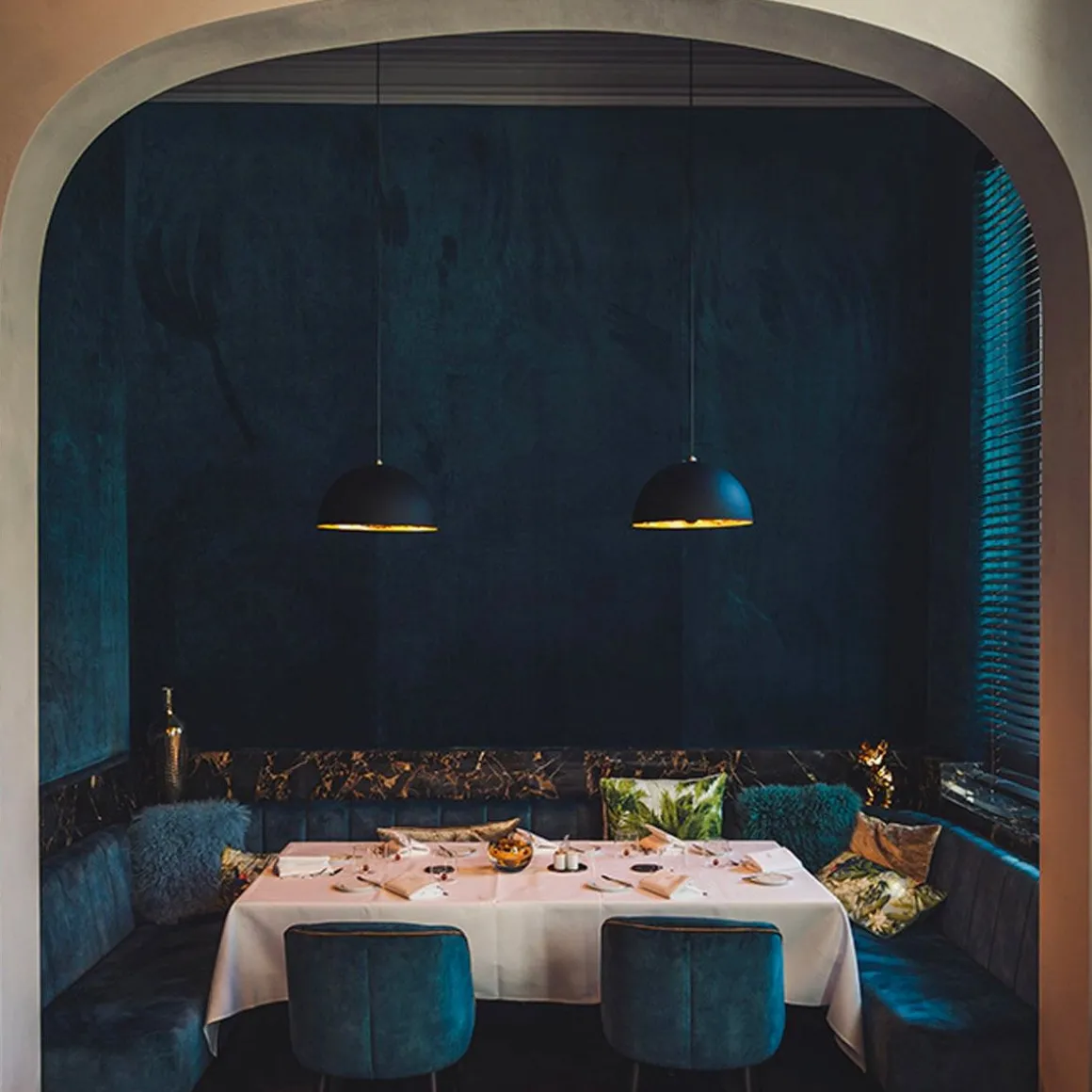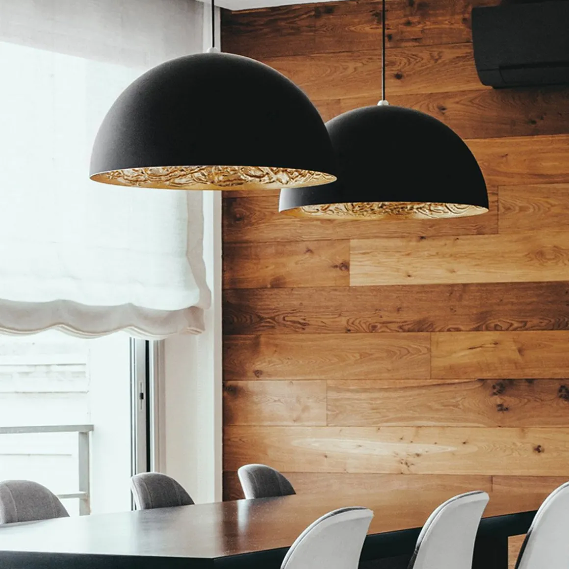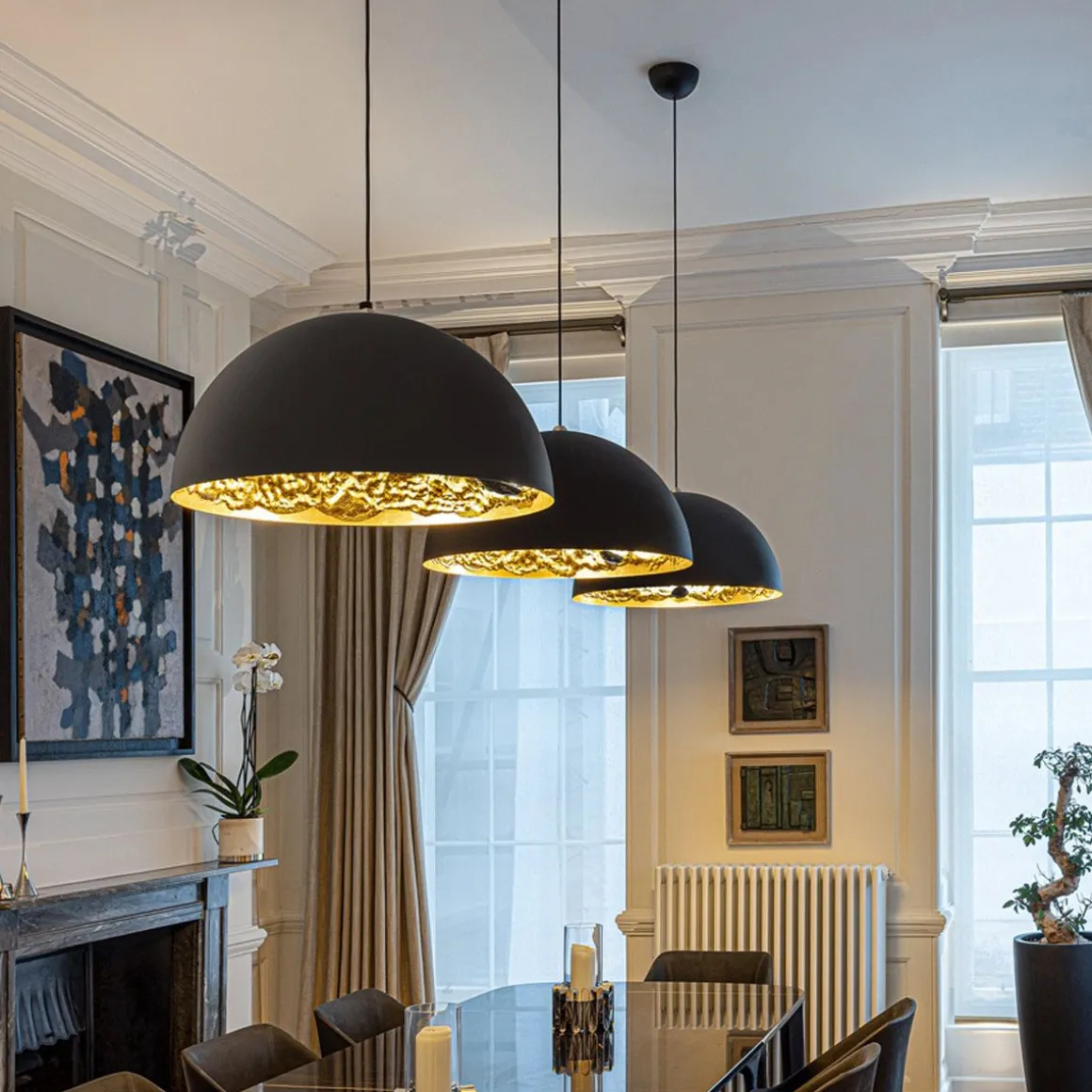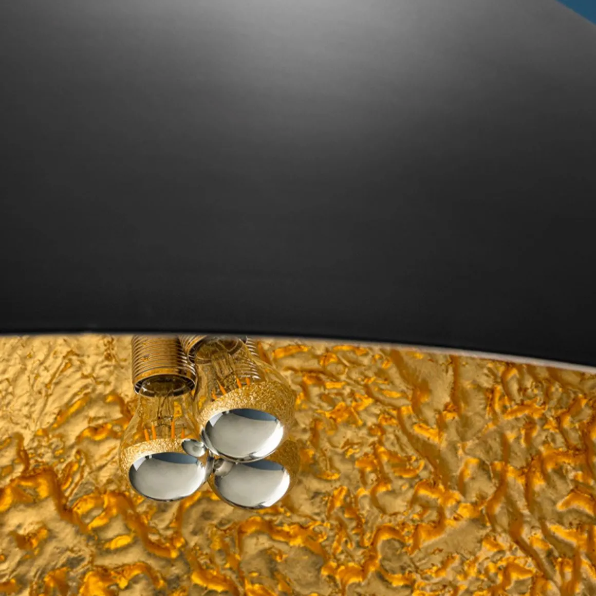 Matériaux : Sphère en aluminum ou en fibre de verre en différents diamètres / Surface interne irrégulière doublée de feuilles en argent, or ou cuivre / Extérieur noir mat, porte lampe en acier.