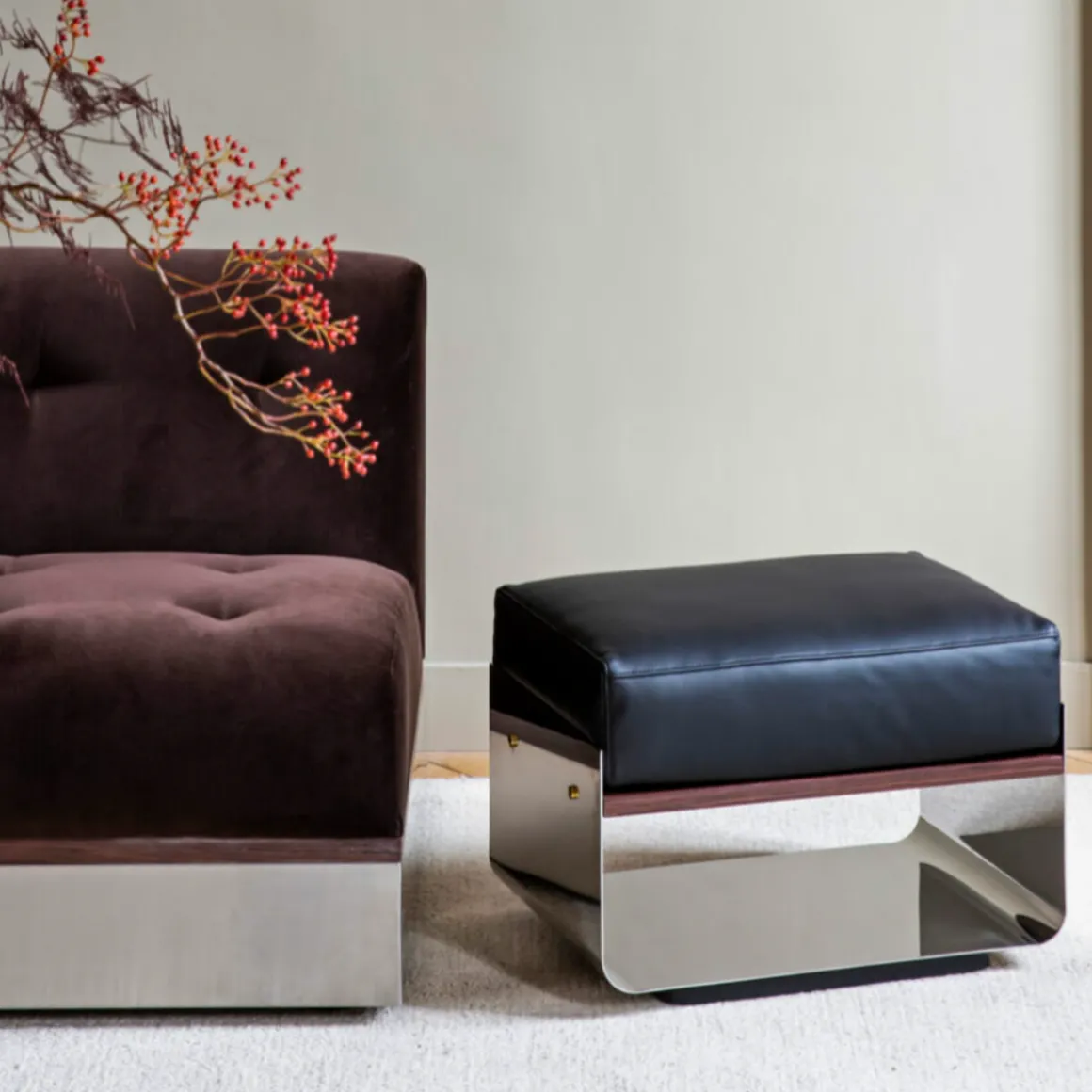 Stellar – Tabouret de Red Edition. Module d’assise bas, Stellar est fidèle aux codes et lignes des années 70’s chères à la marque. Une assise au design monobloc qui incarne l’élégance et la polyvalence. Fier de ses volumes carrossés et de son esthétique monobloc, Stellar associe subtilement les métaux inox et laiton à une note de bois palissandre. Le coussin généreux offre une assise confortable et personnalisable. Amovible, il permet au besoin de transformer l’assise en table d’appoint.