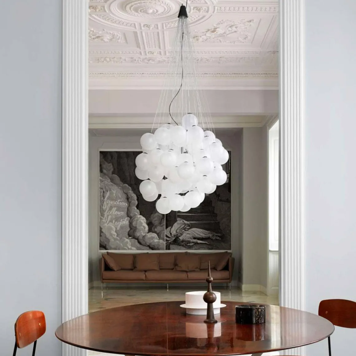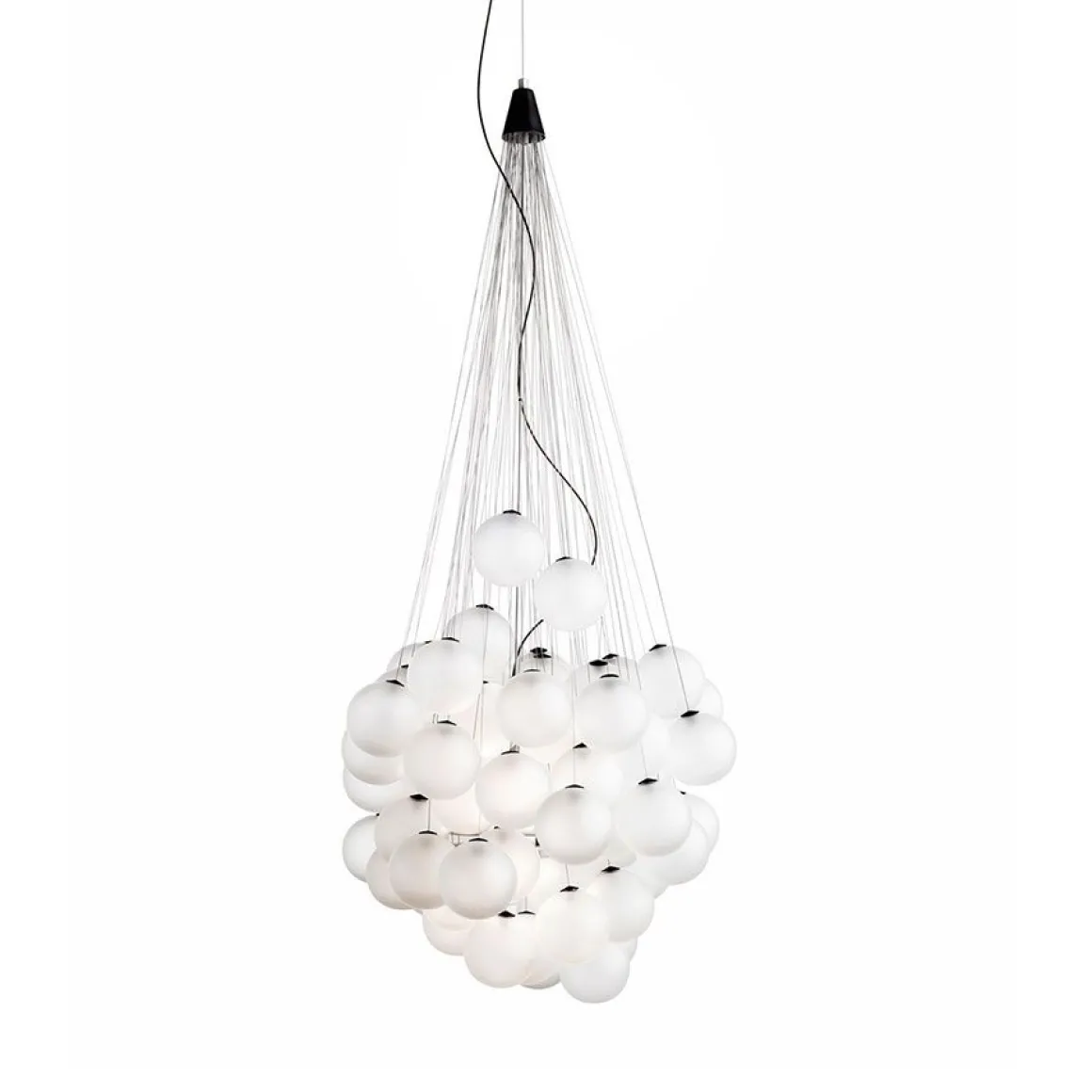 Le modèle Stochastic est une conception du créateur norvégien Daniel Rybakken. Cette suspension est composée de différentes sphères en verre suspendues à différentes hauteurs. Vous pouvez monter les sphères à votre guise sur les barres en acier. Chaque barre disposant d’une longueur différente, cela crée différentes grappes lumineuses. Chaque version est différente. D’où le nom Stochastic (stochastique) qui renvoie à une méthode de travail arbitraire, qui permet d’obtenir à chaque fois une conception unique. Un module double LED à haute efficacité – est enfermé à l’intérieur des sphères diffusant à la fois vers le haut et vers le bas. Les sphères sont disponibles en blanc satin ou en métal réfléchissant.